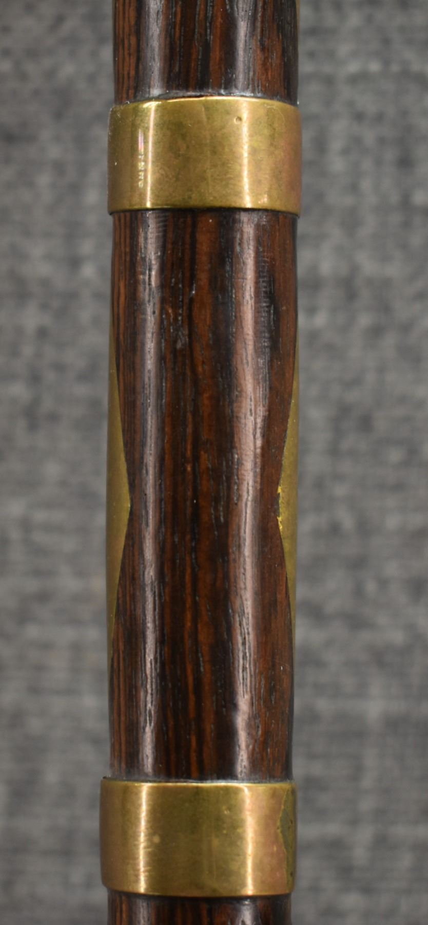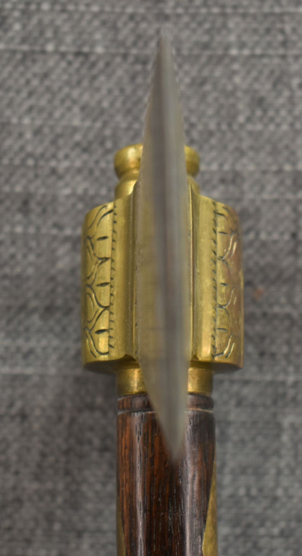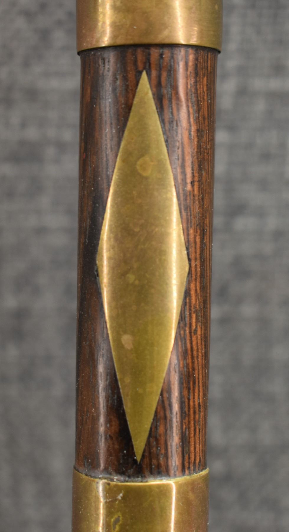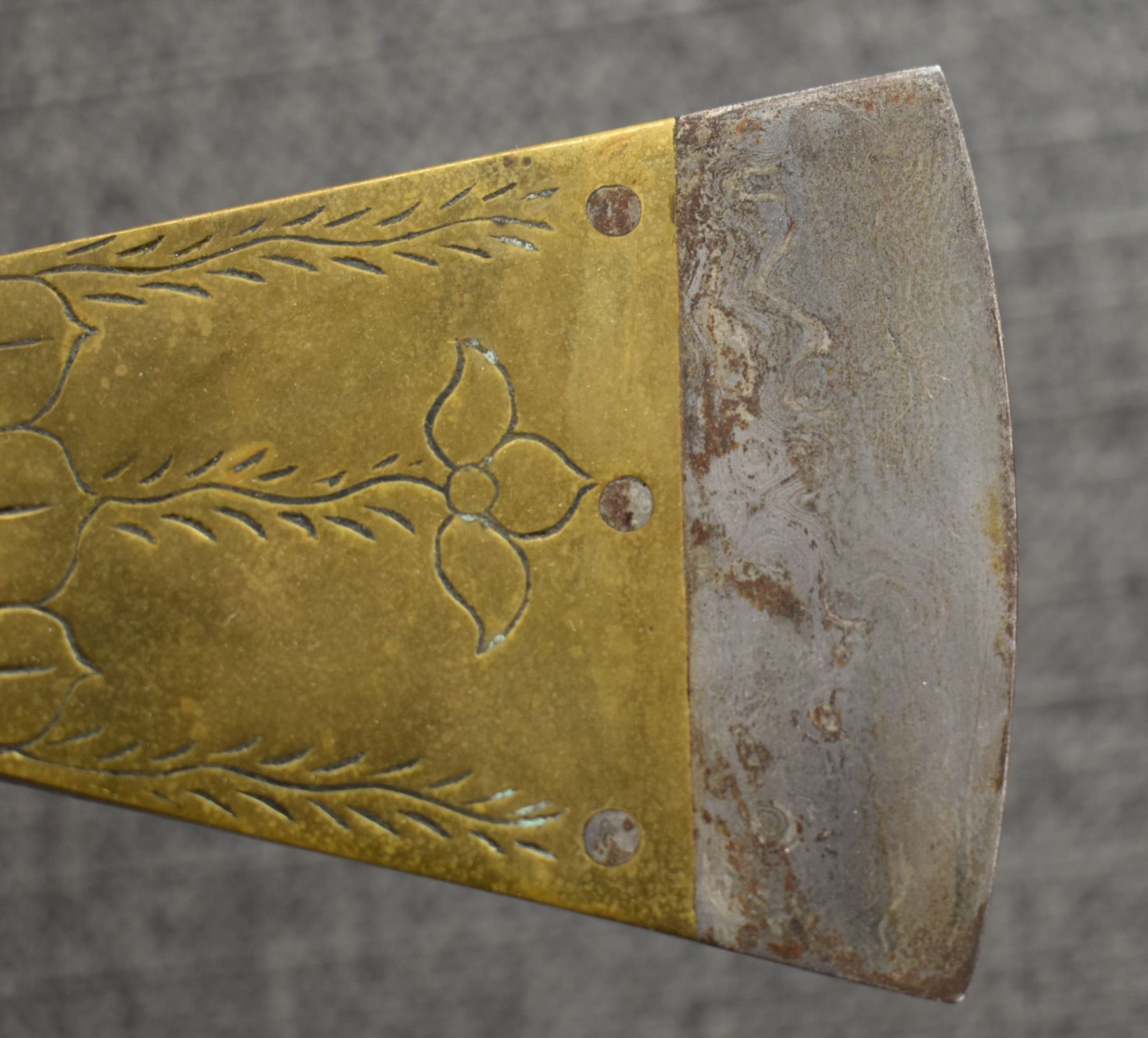 20th century, wooden handle/stem with brass rings and diamond inlaid handle with brass pipe tomahawk head with engraved design and Damascus blade 16.25" x 6"