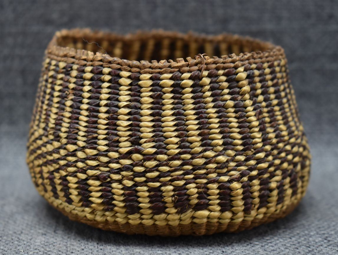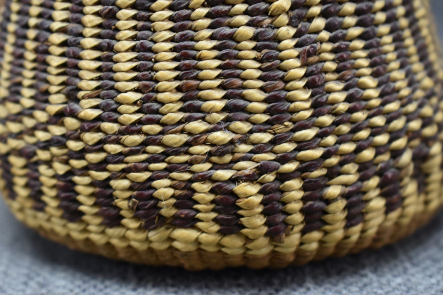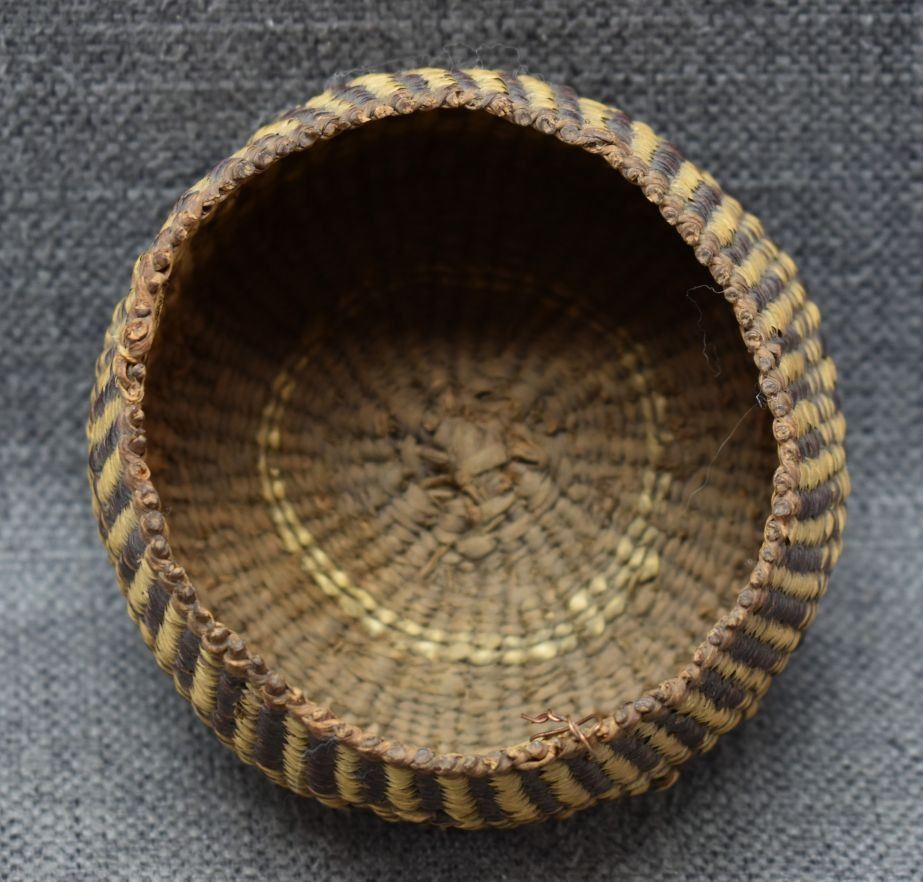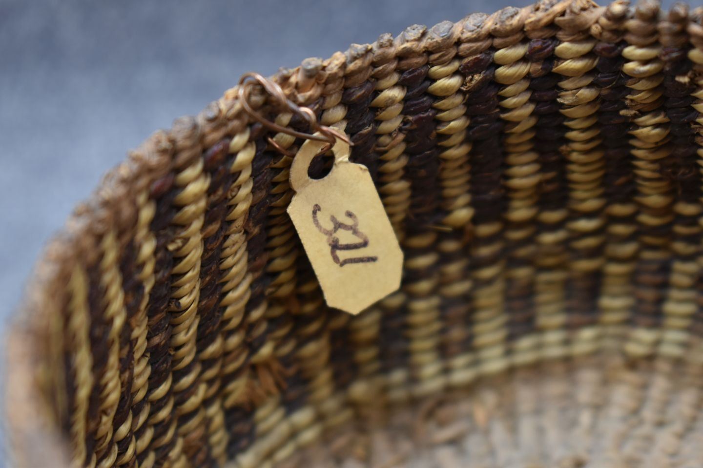 1900's pit river. Hand woven negative design basketry bowl with old collection number. 2.5'' x 4.5''