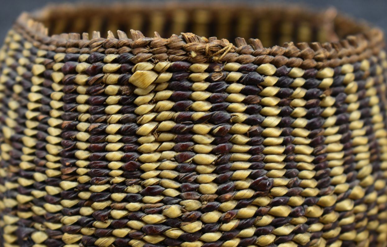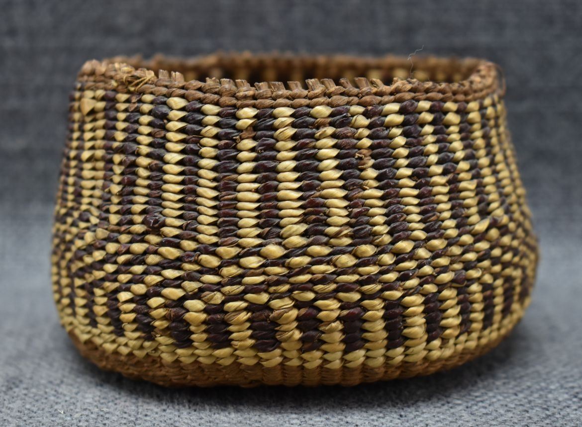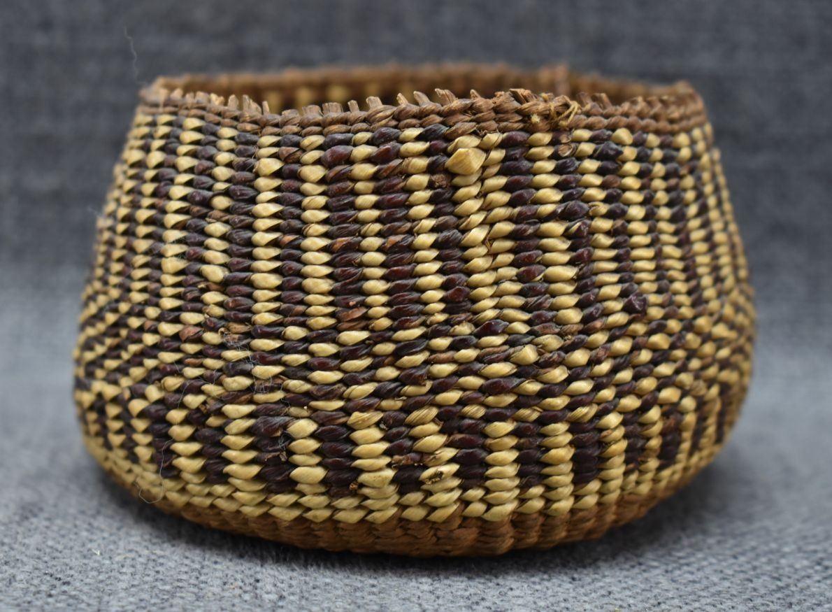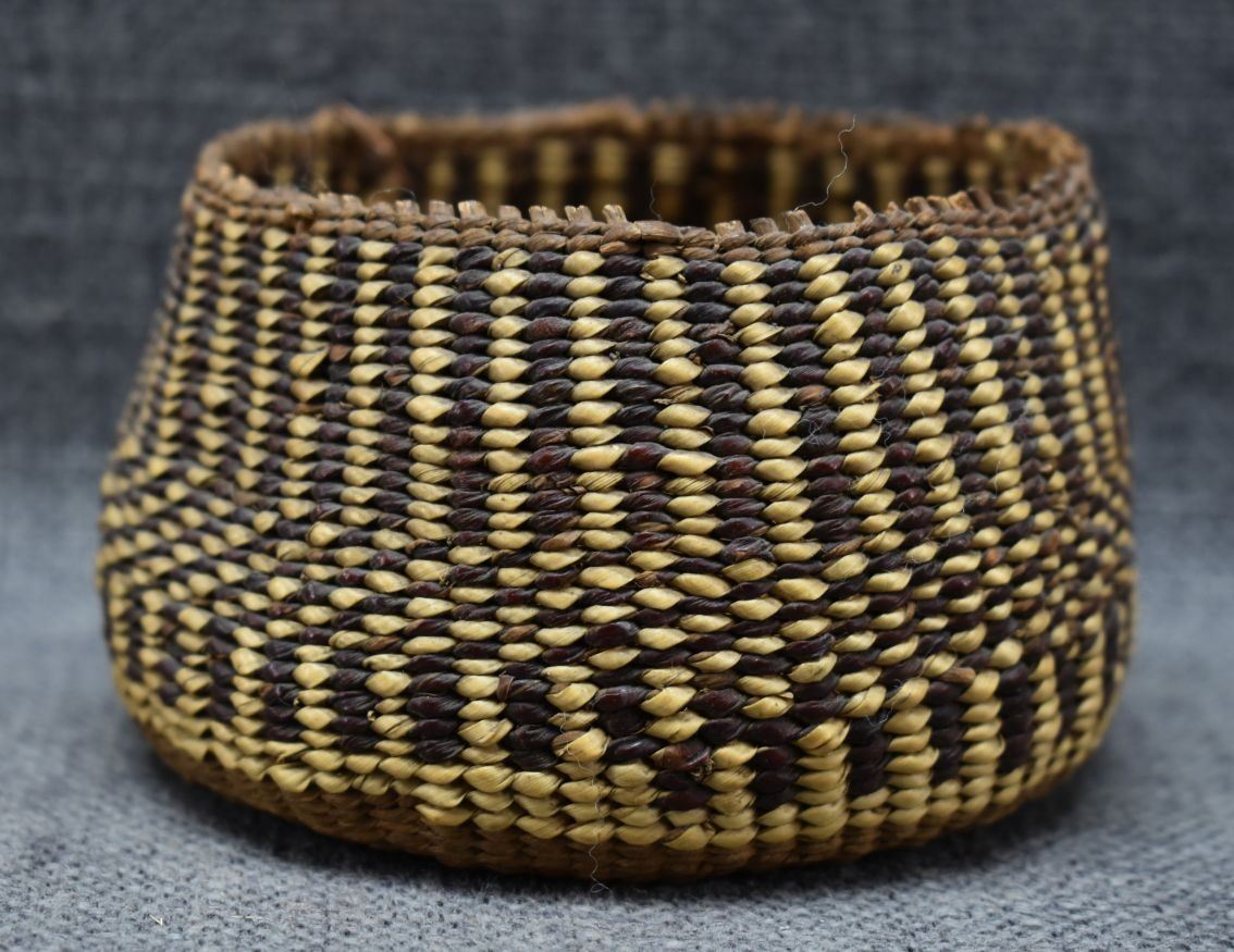 1900's pit river. Hand woven negative design basketry bowl with old collection number. 2.5'' x 4.5''