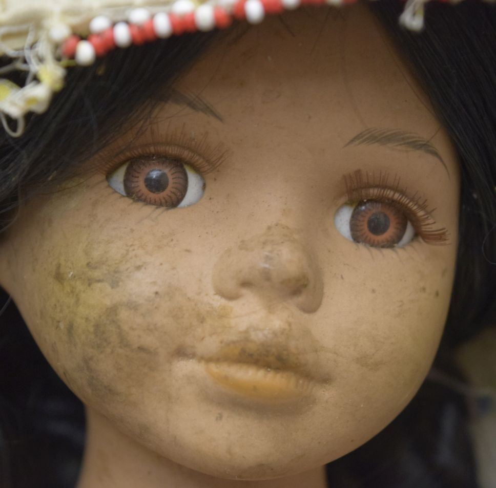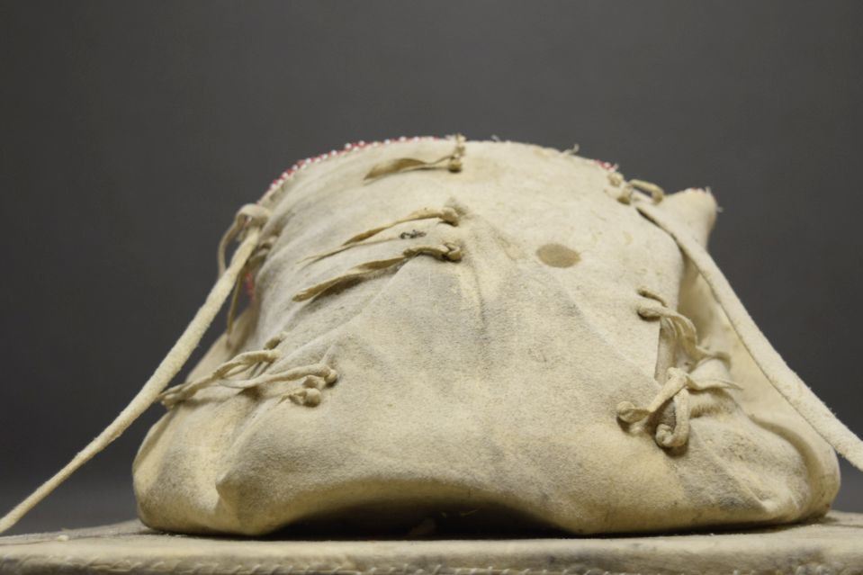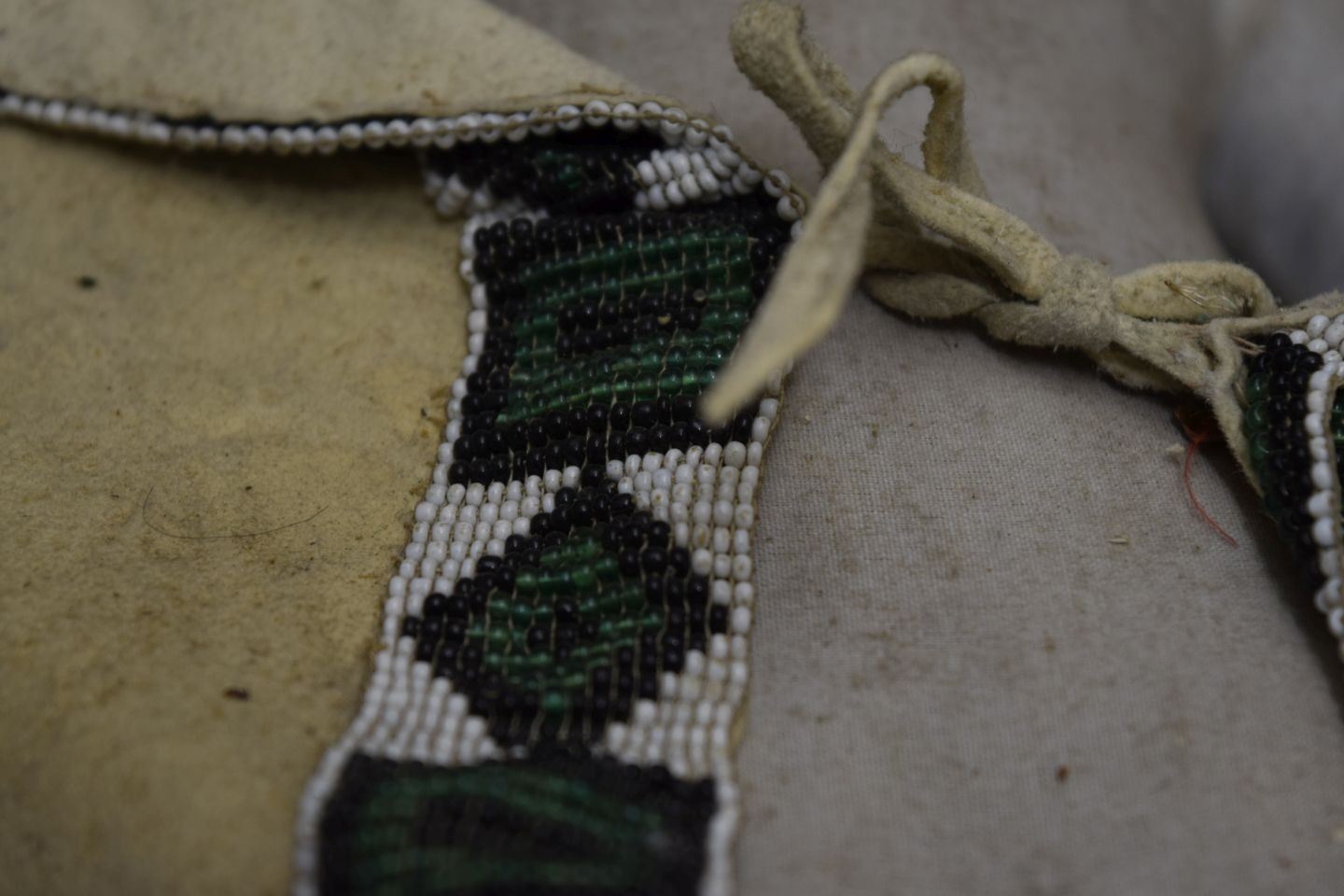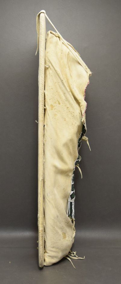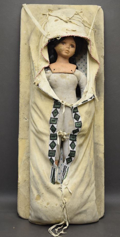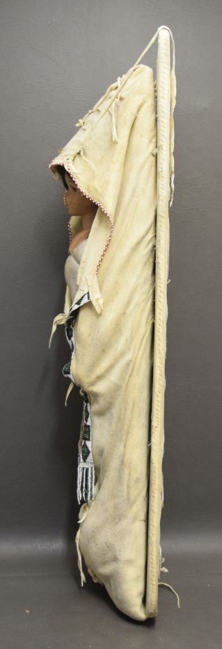 1960's pit river Indian cradle loom beaded design on native tanned hide cradle, 30'' x 12'' x 6'' and vintage doll 31'' tall