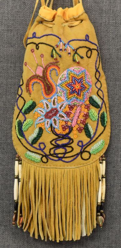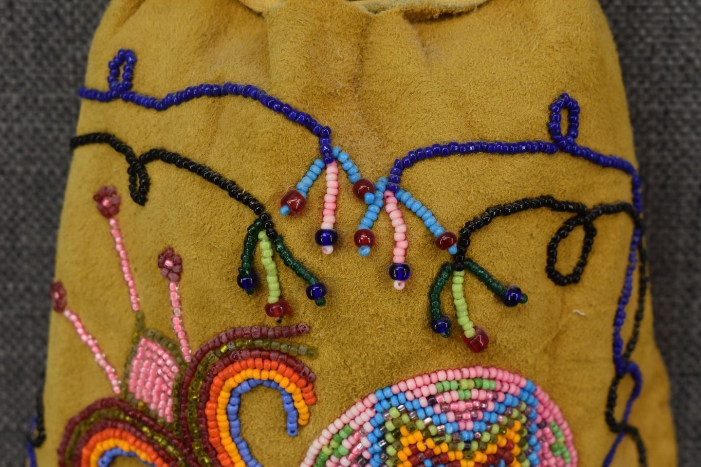 1970's Plains. Thread sewn beaded design on commercial leather bag. 16'' x 7''