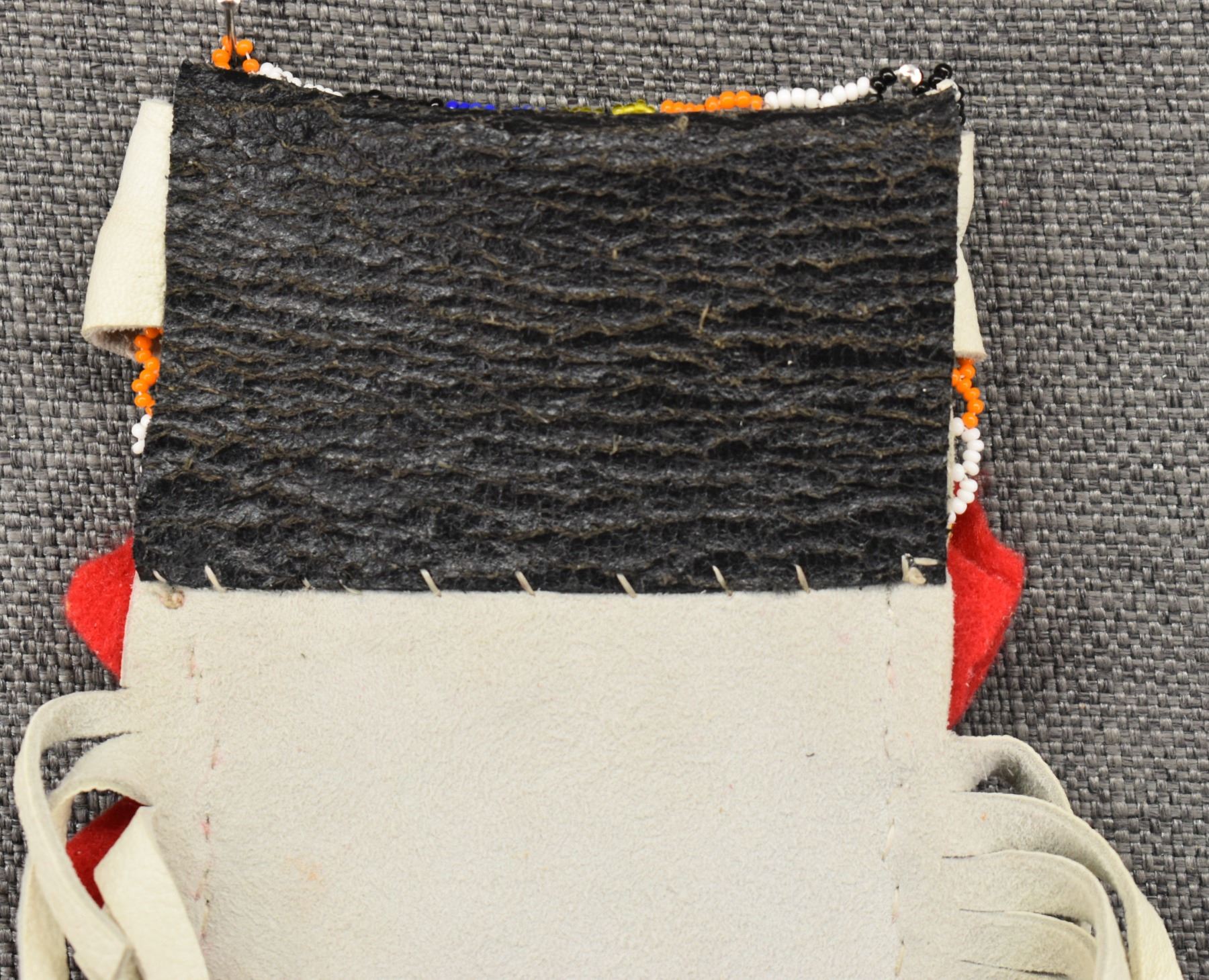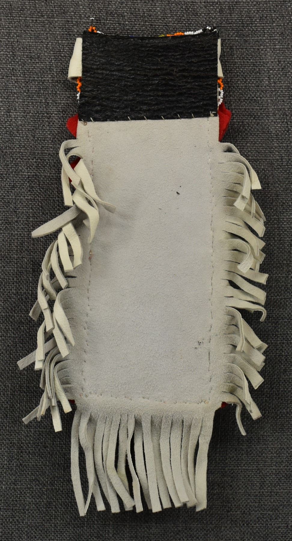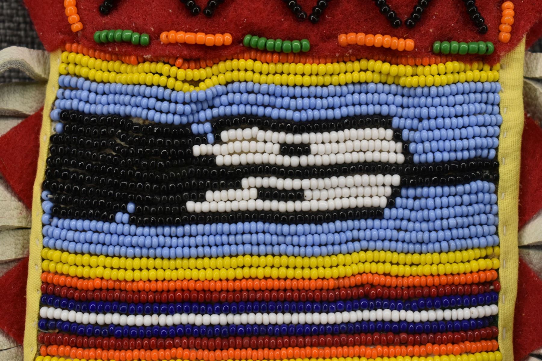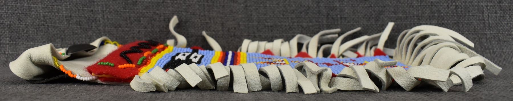 20th century plains Indian, hand made from native tanned leather and trade cloth with thread sown beaded design 13" x 7.5" including fringe