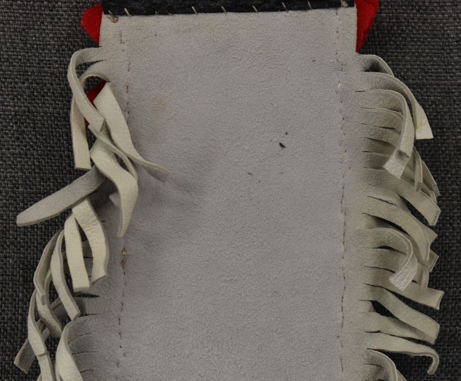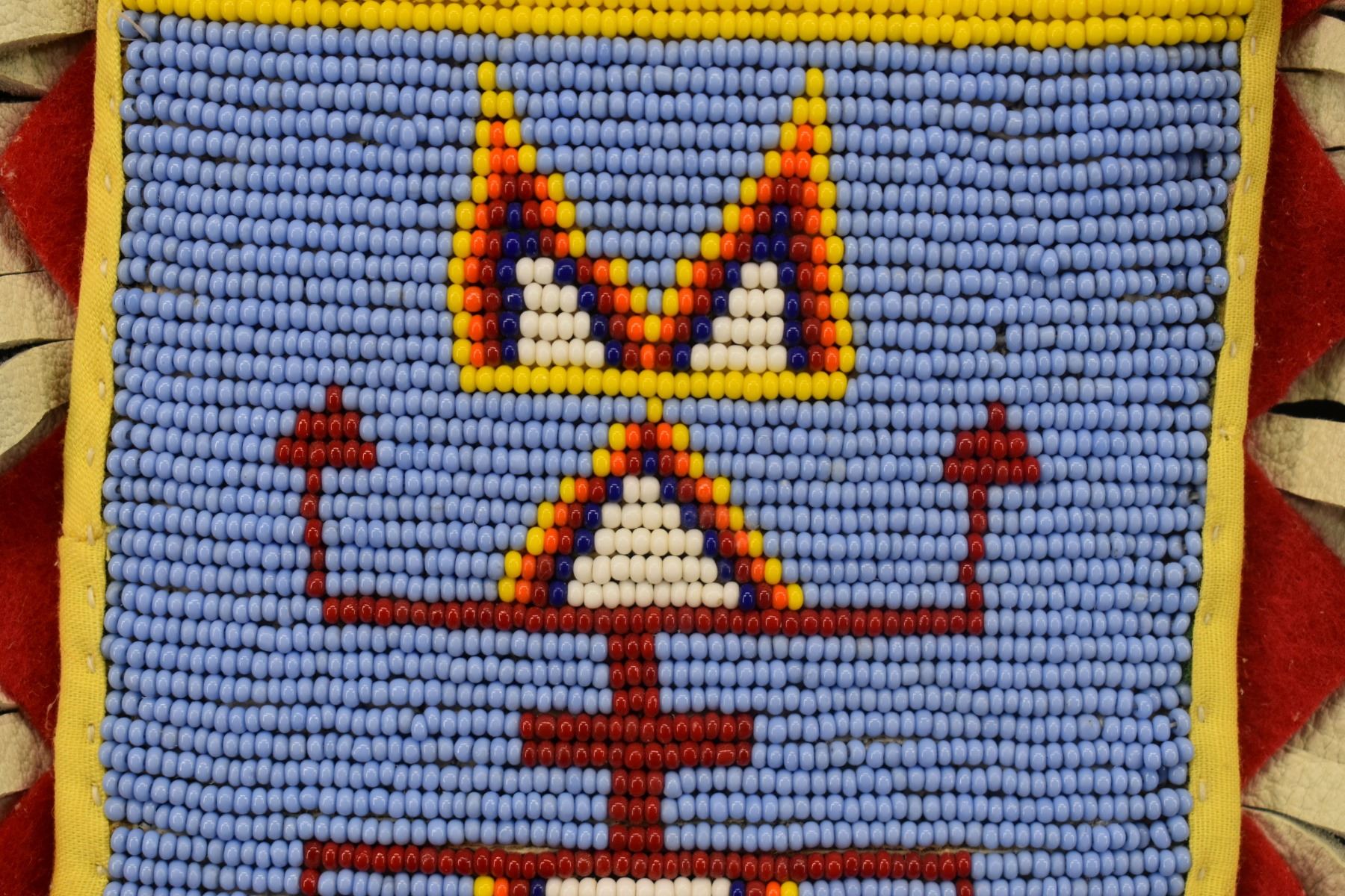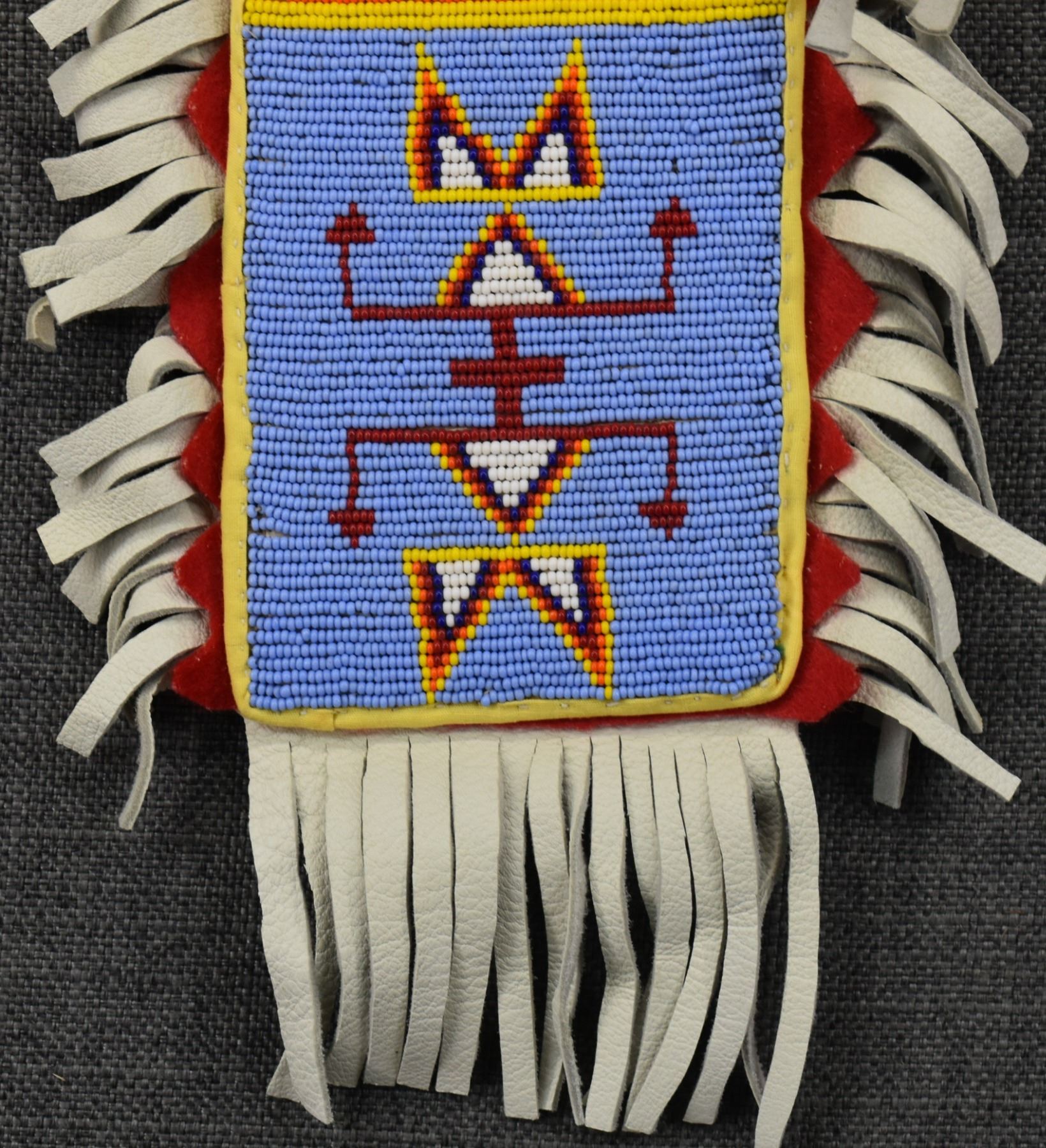 20th century plains Indian, hand made from native tanned leather and trade cloth with thread sown beaded design 13" x 7.5" including fringe