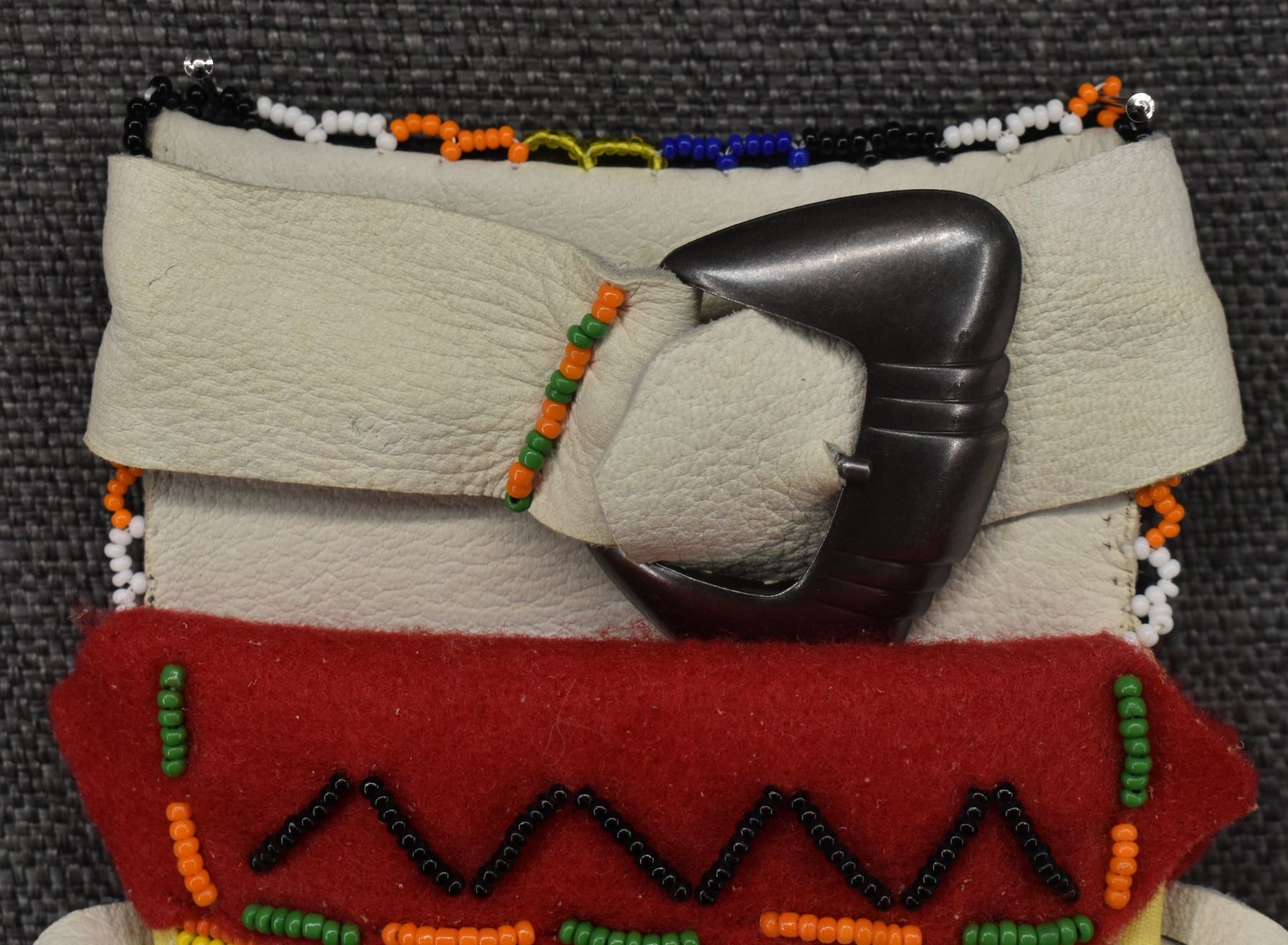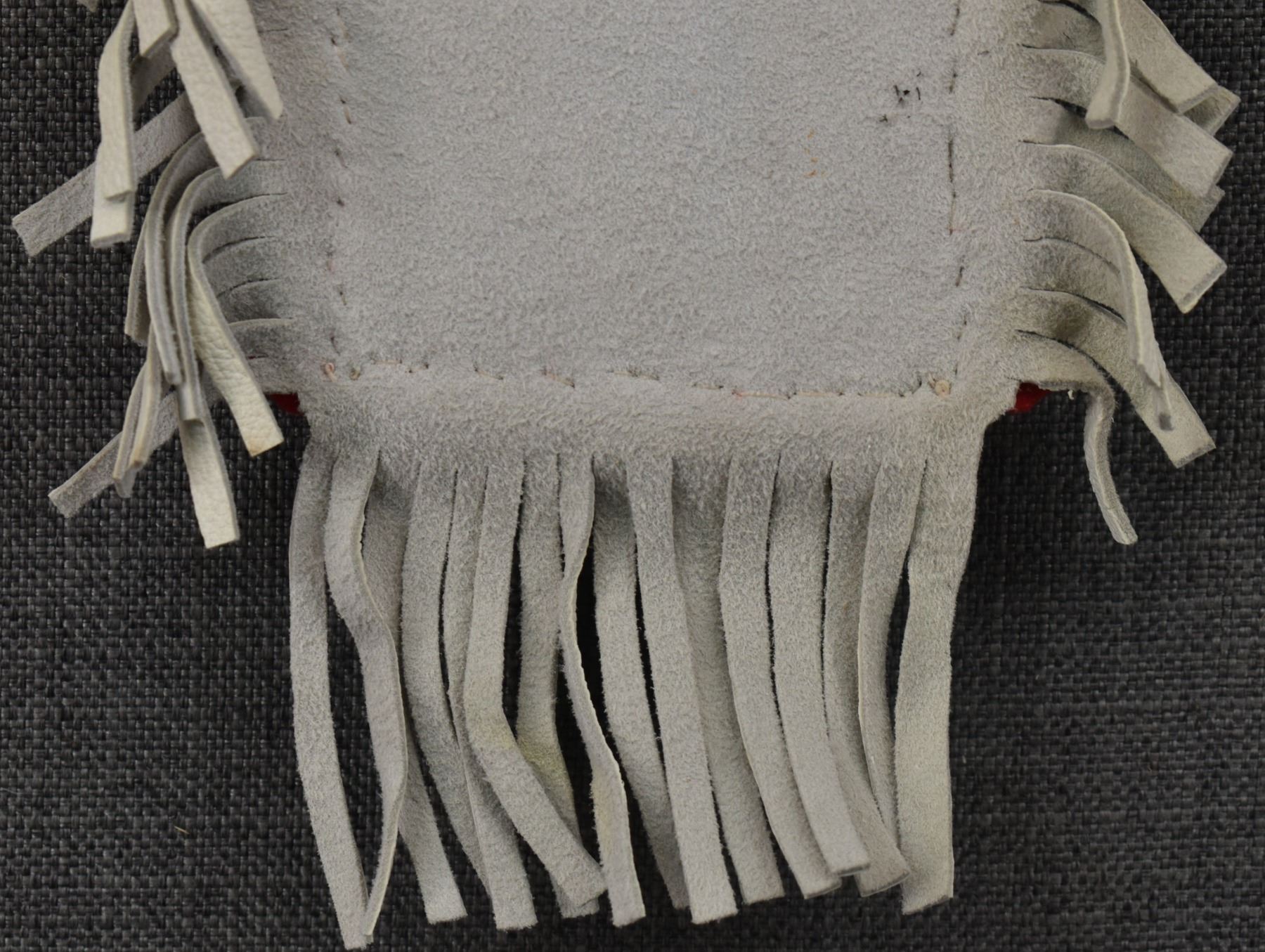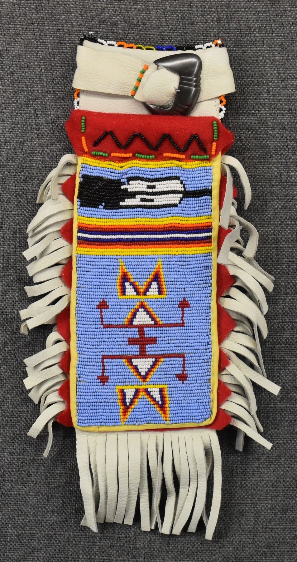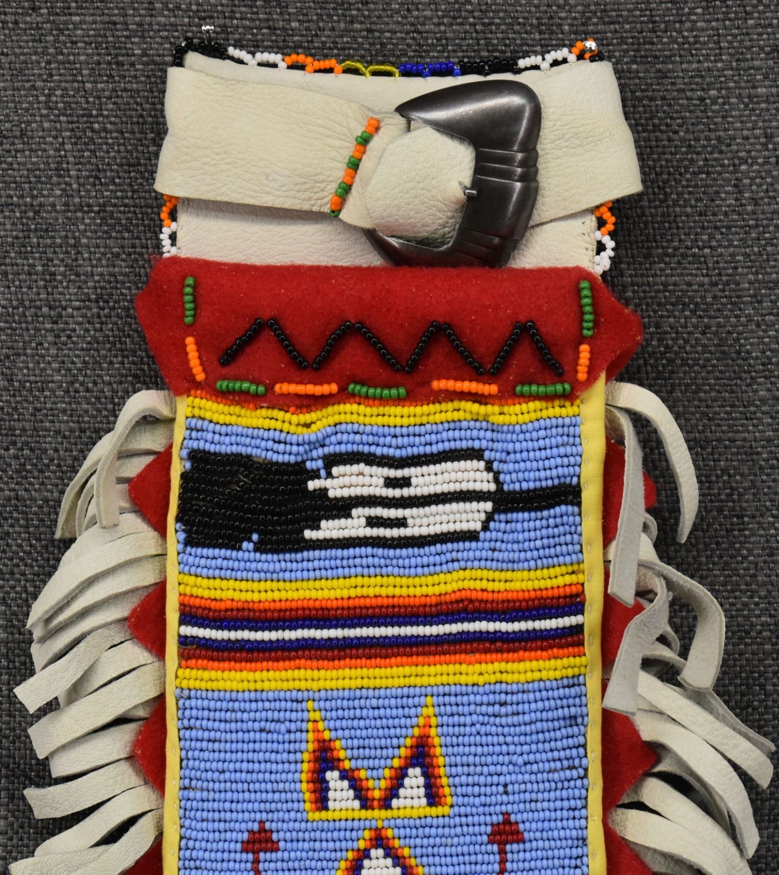20th century plains Indian, hand made from native tanned leather and trade cloth with thread sown beaded design 13" x 7.5" including fringe