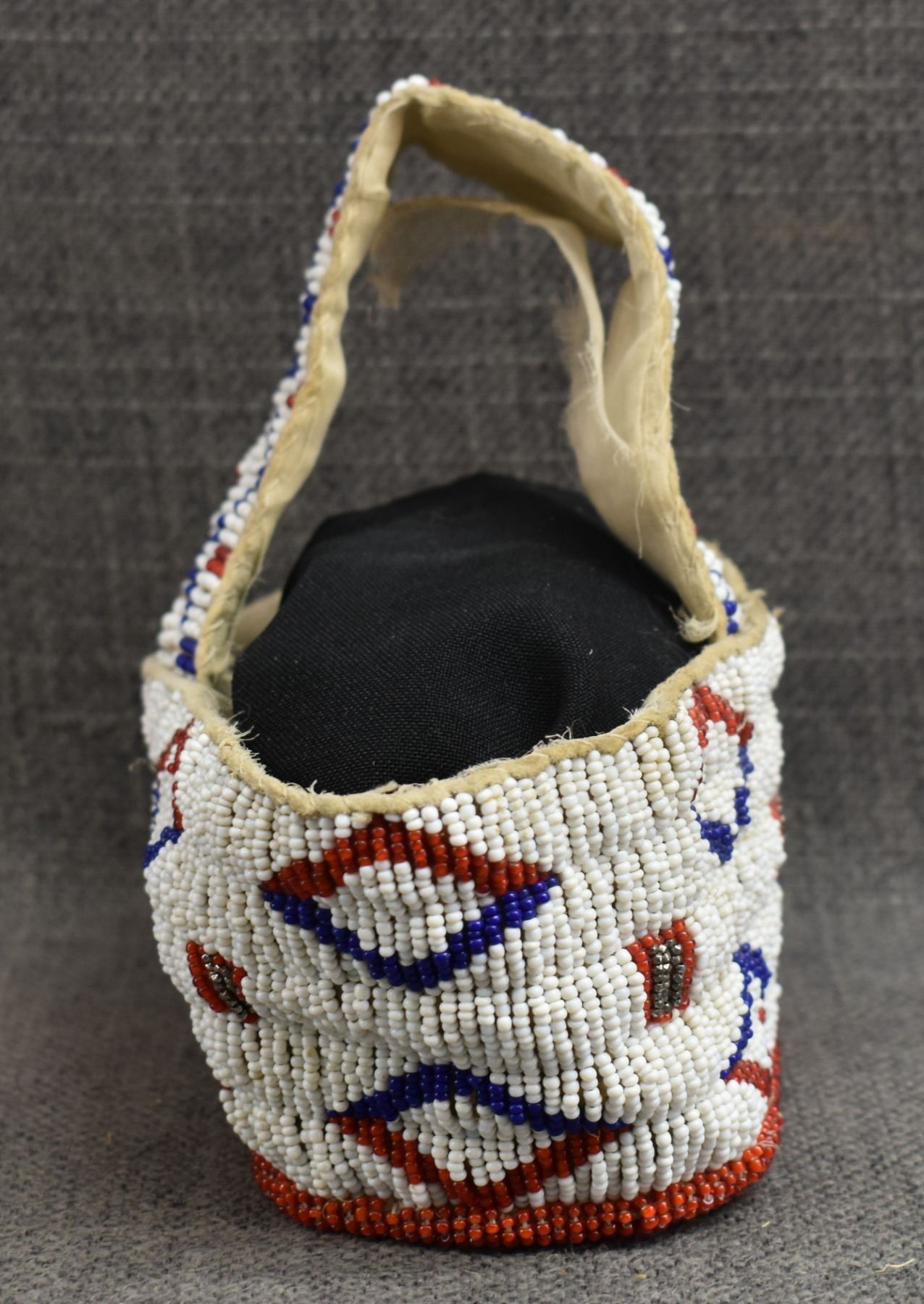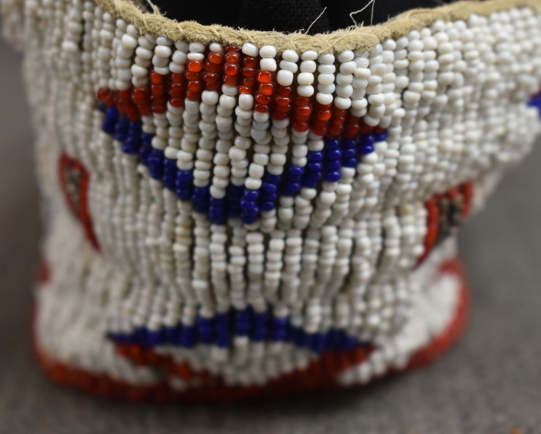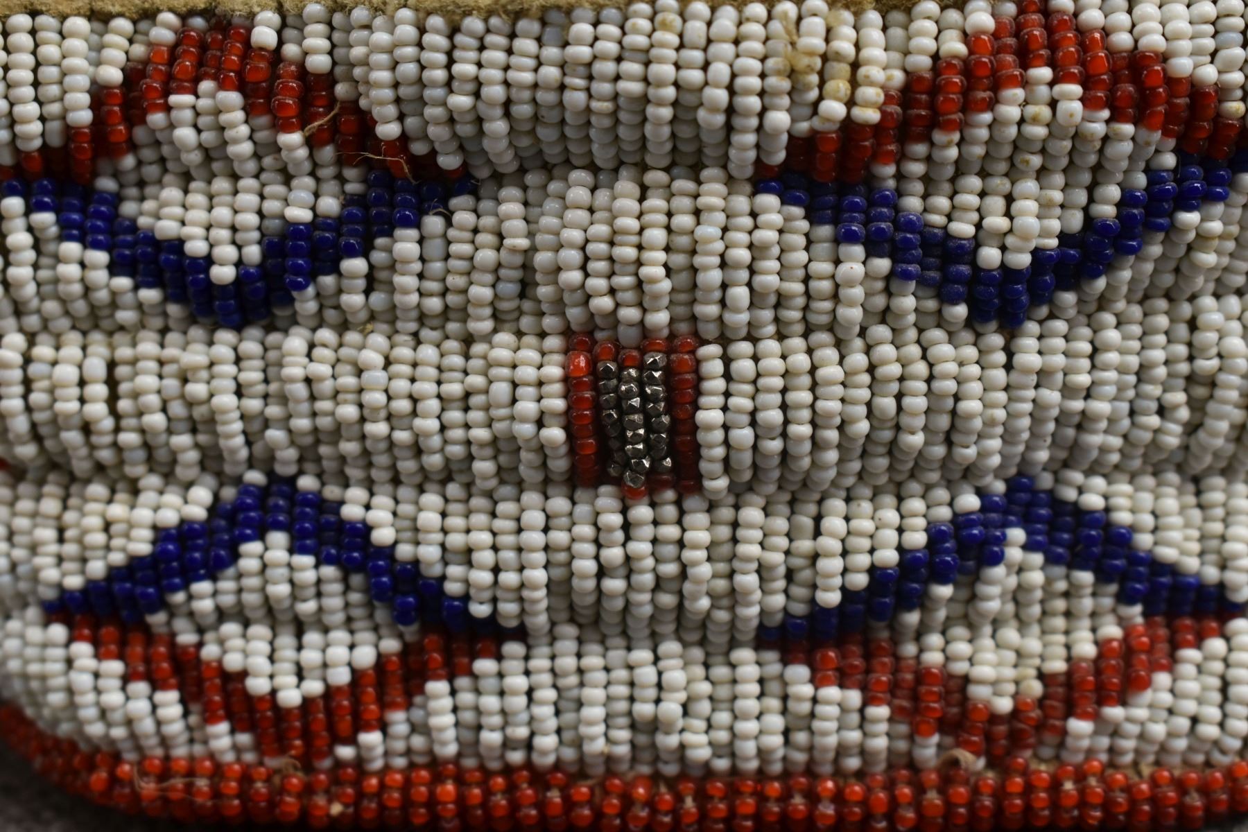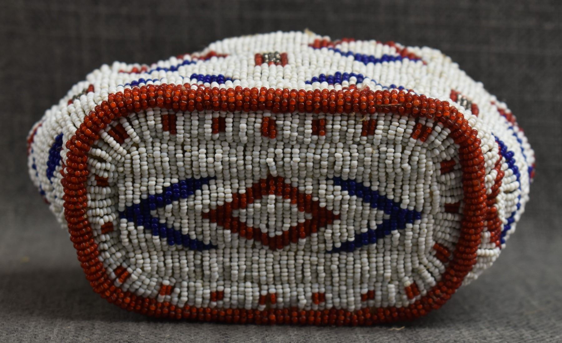 20th century plains Indian, hand made thread sown beaded design on leather with cloth lining 5.5" x 6.5" x 3.5"