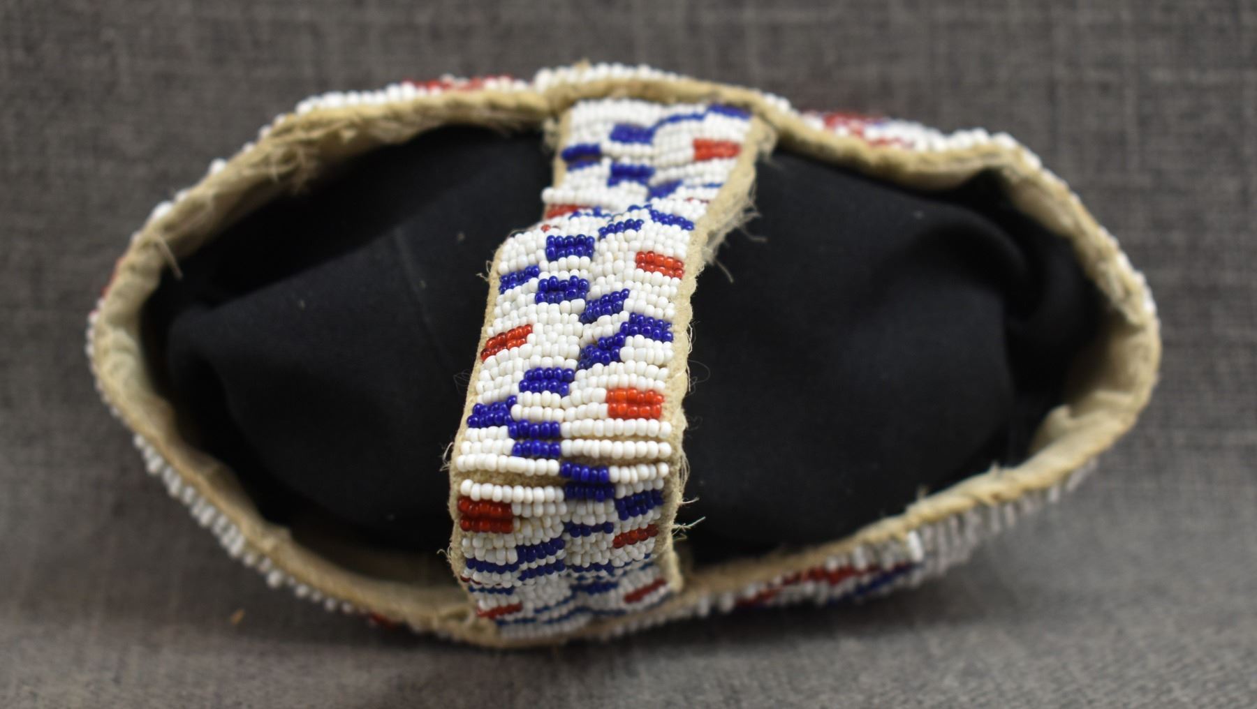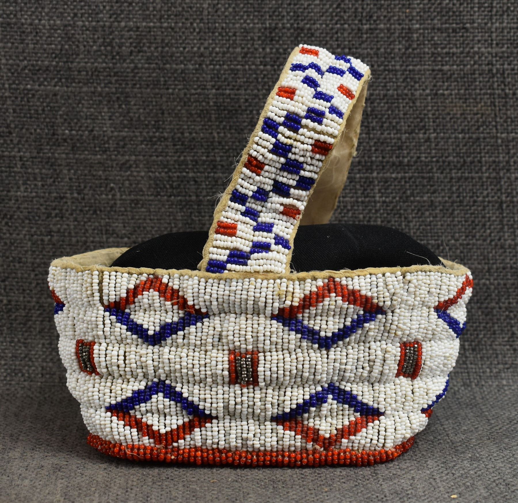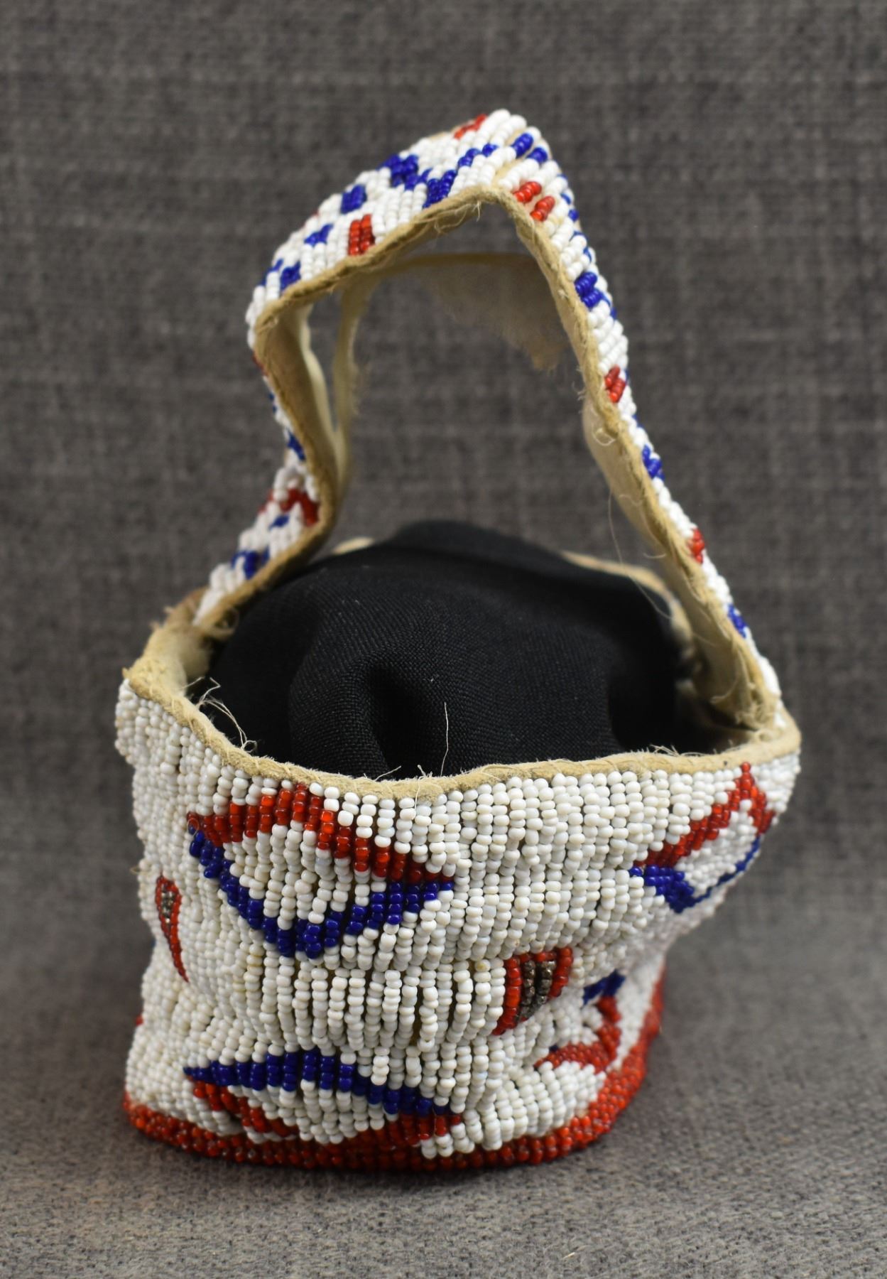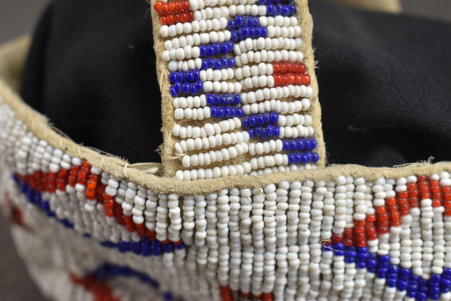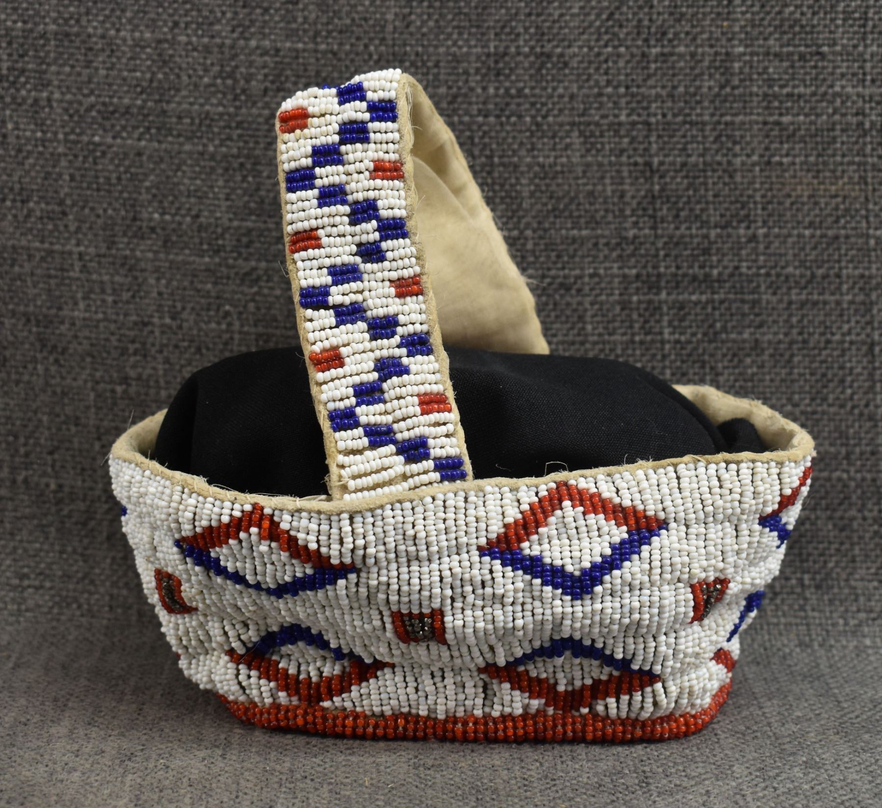 20th century plains Indian, hand made thread sown beaded design on leather with cloth lining 5.5" x 6.5" x 3.5"
