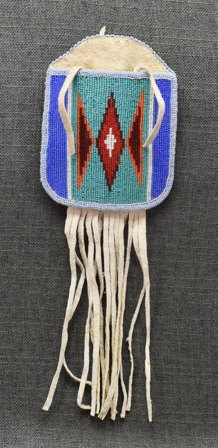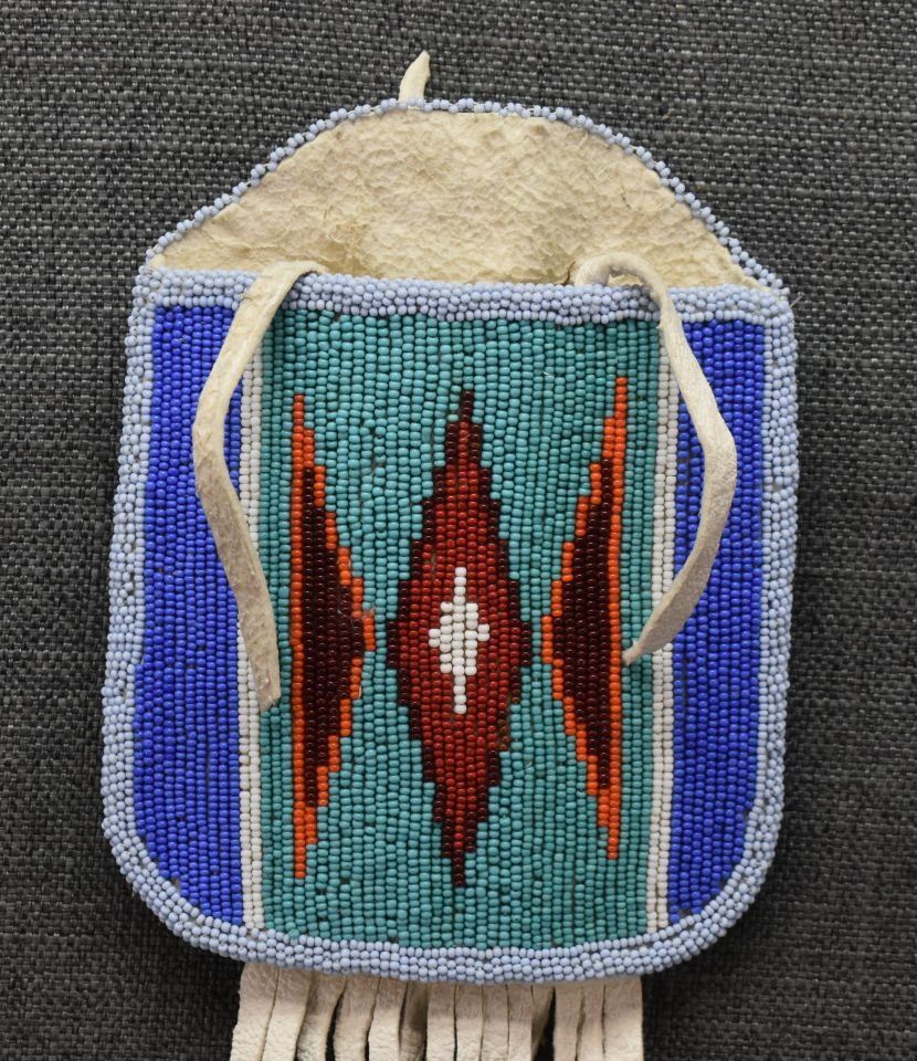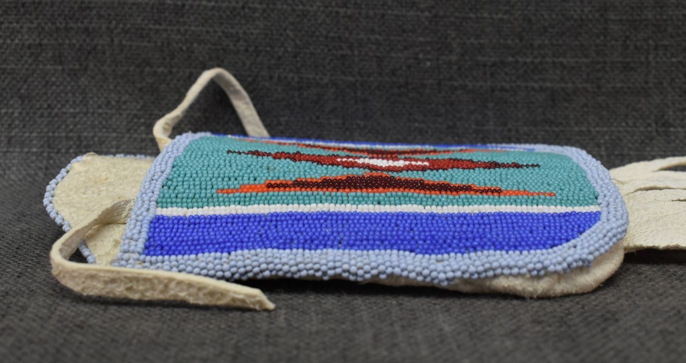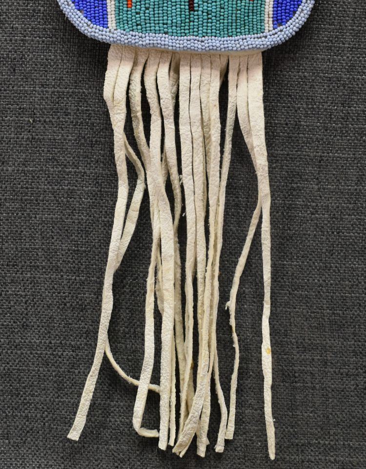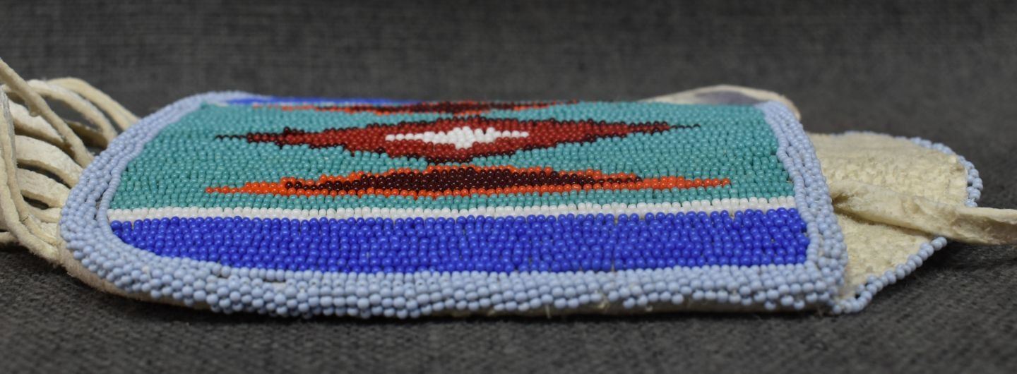 contemporary plains Indian, hand made from leather with thread sown beaded design 6" x 5.75" plus 9" fringe