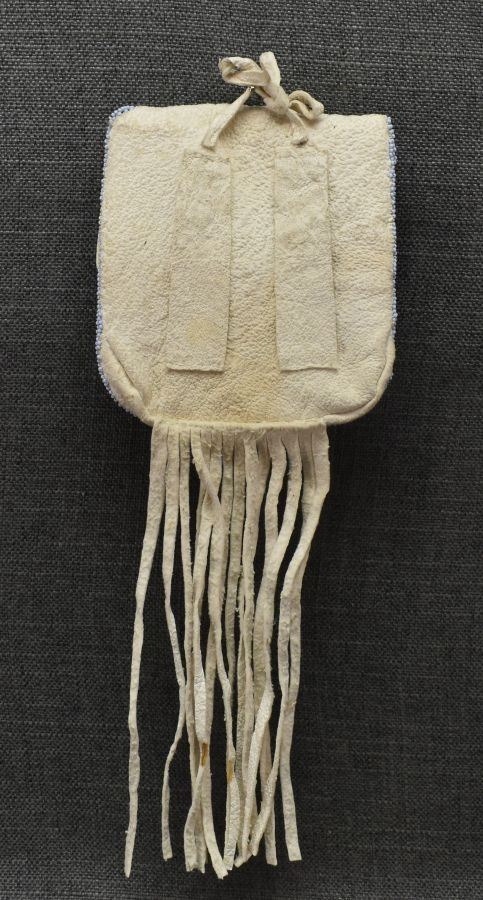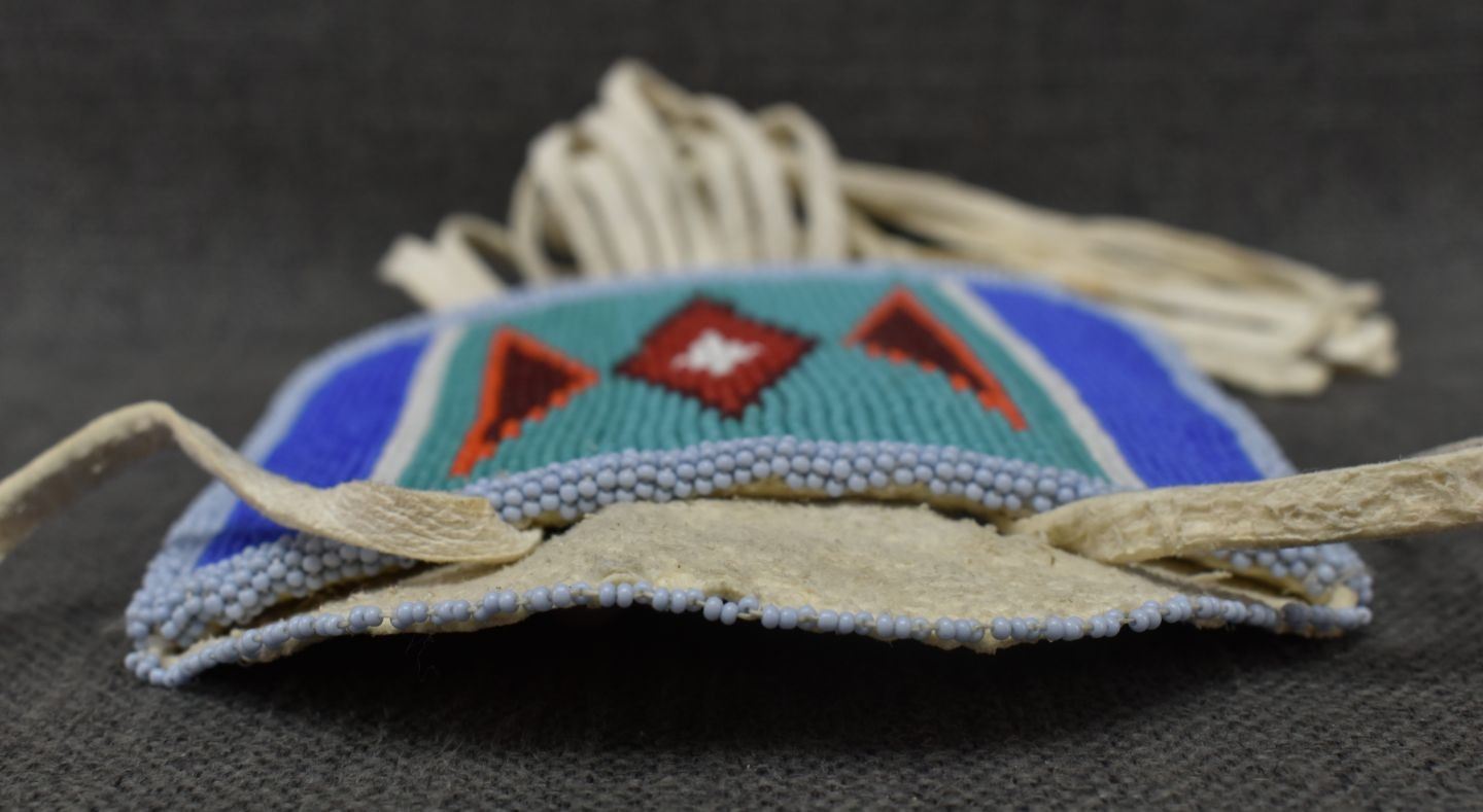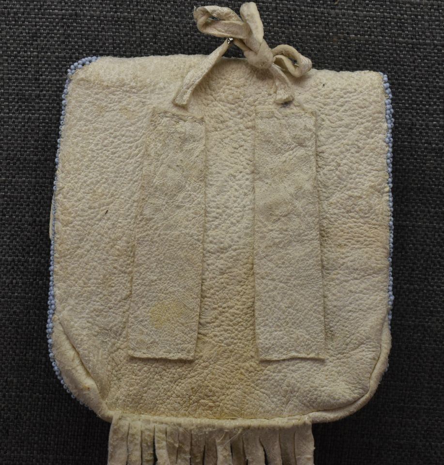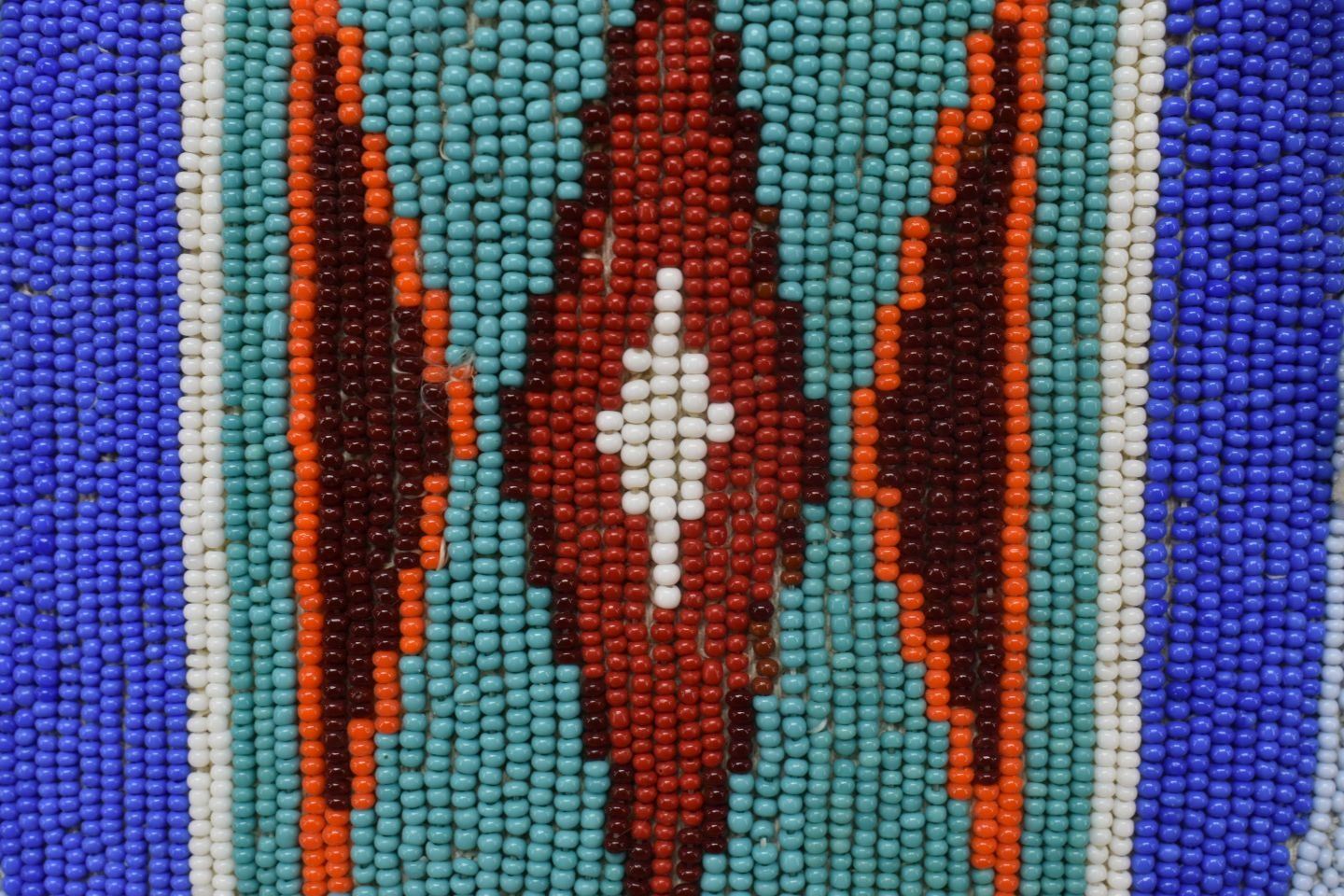 contemporary plains Indian, hand made from leather with thread sown beaded design 6" x 5.75" plus 9" fringe