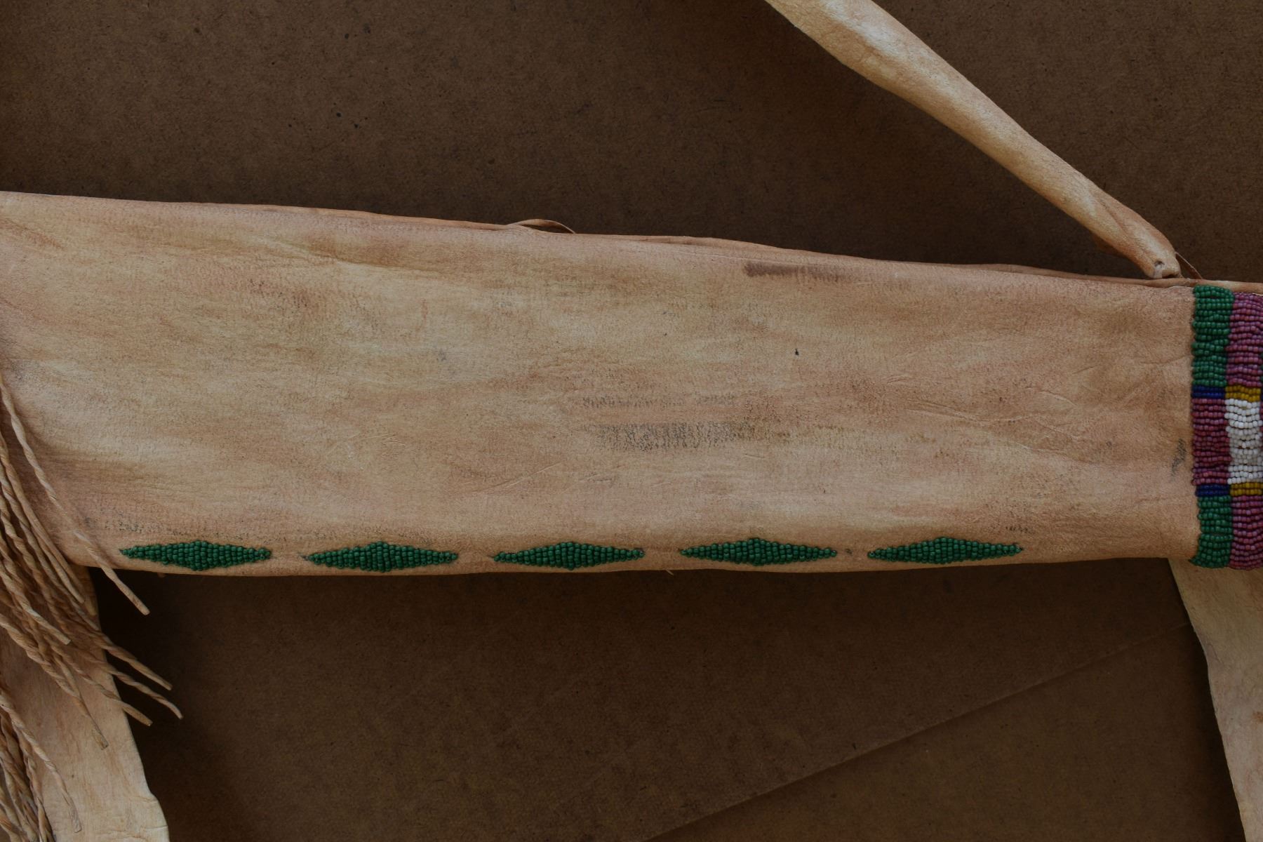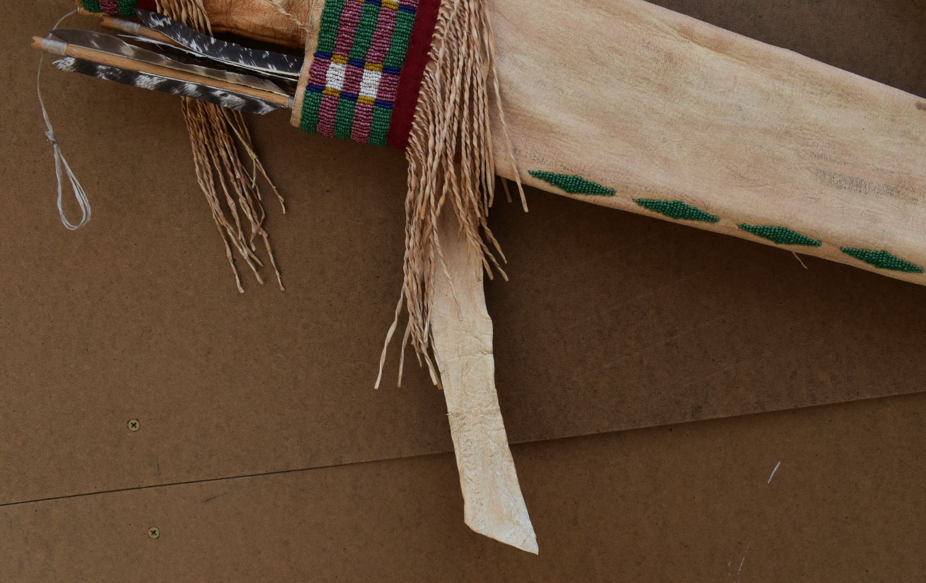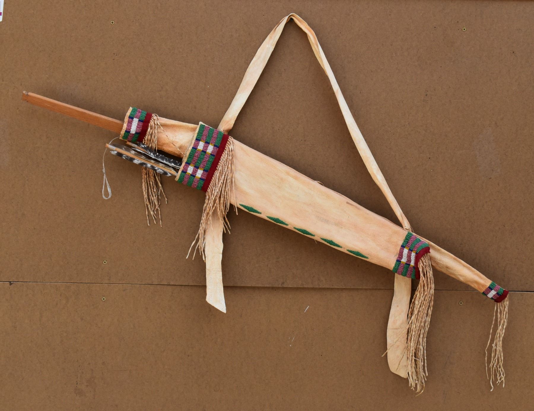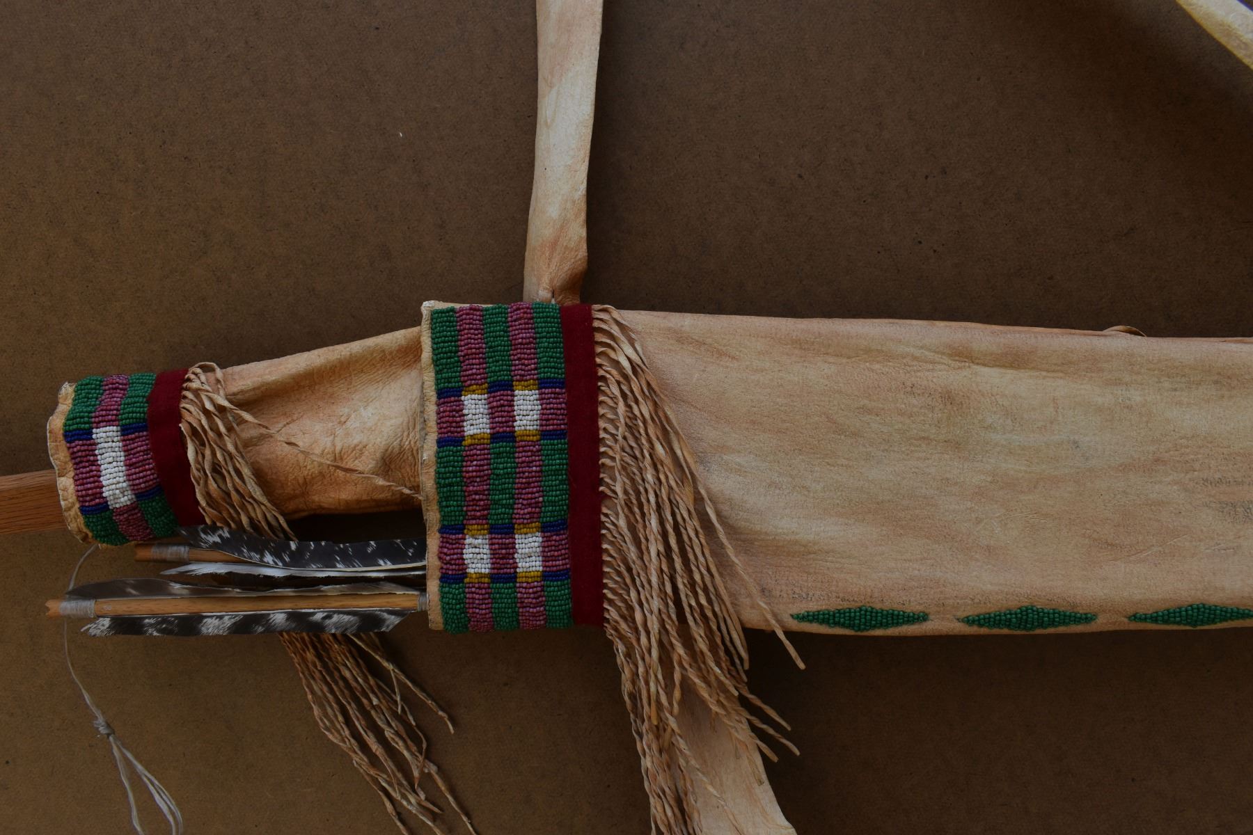 20th century plains. Beaded design on leather bow case and quiver. 36'' x 8''. Wooden bow 43'' long . Arrows 25'' long