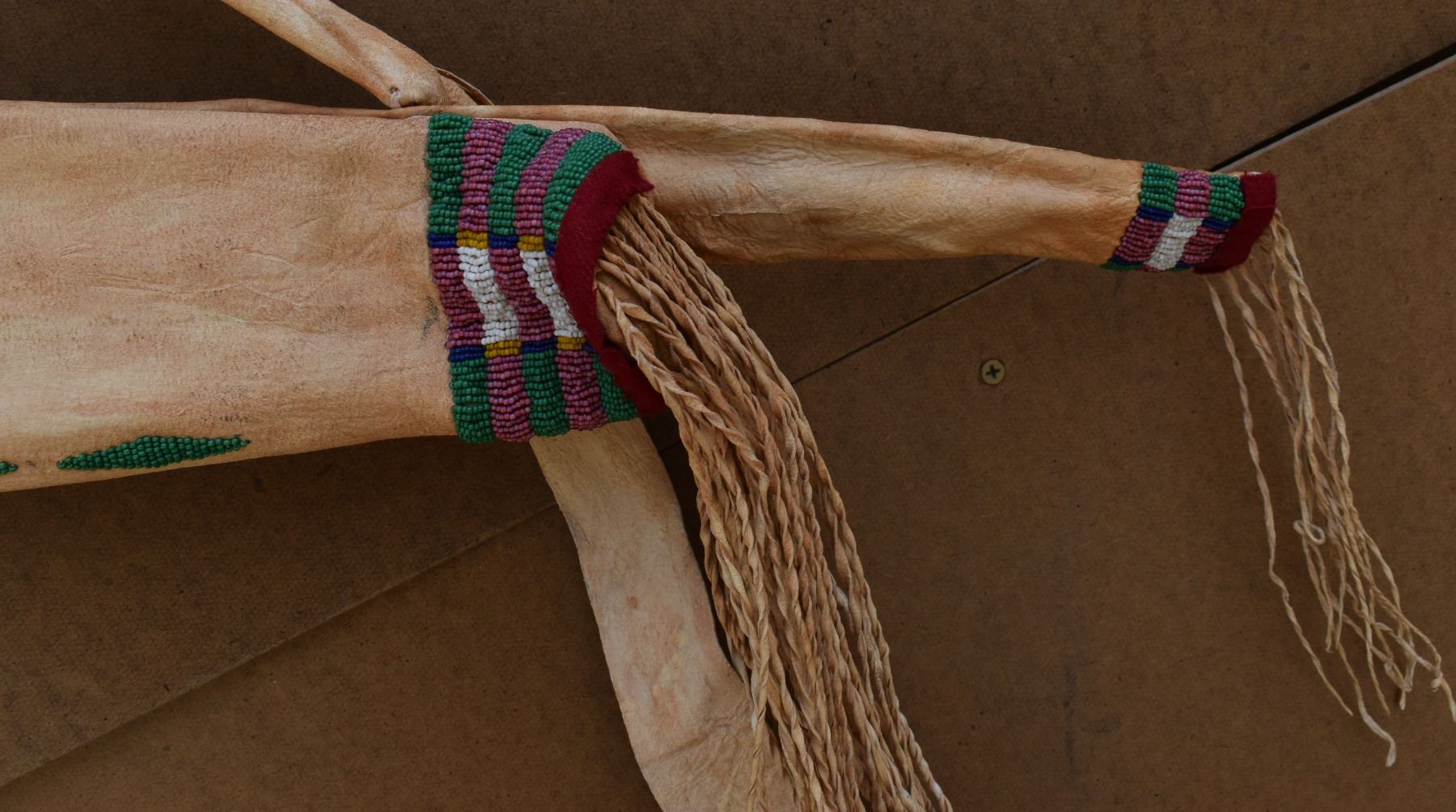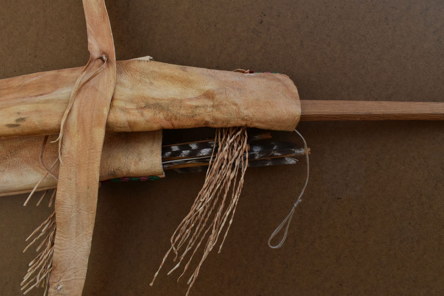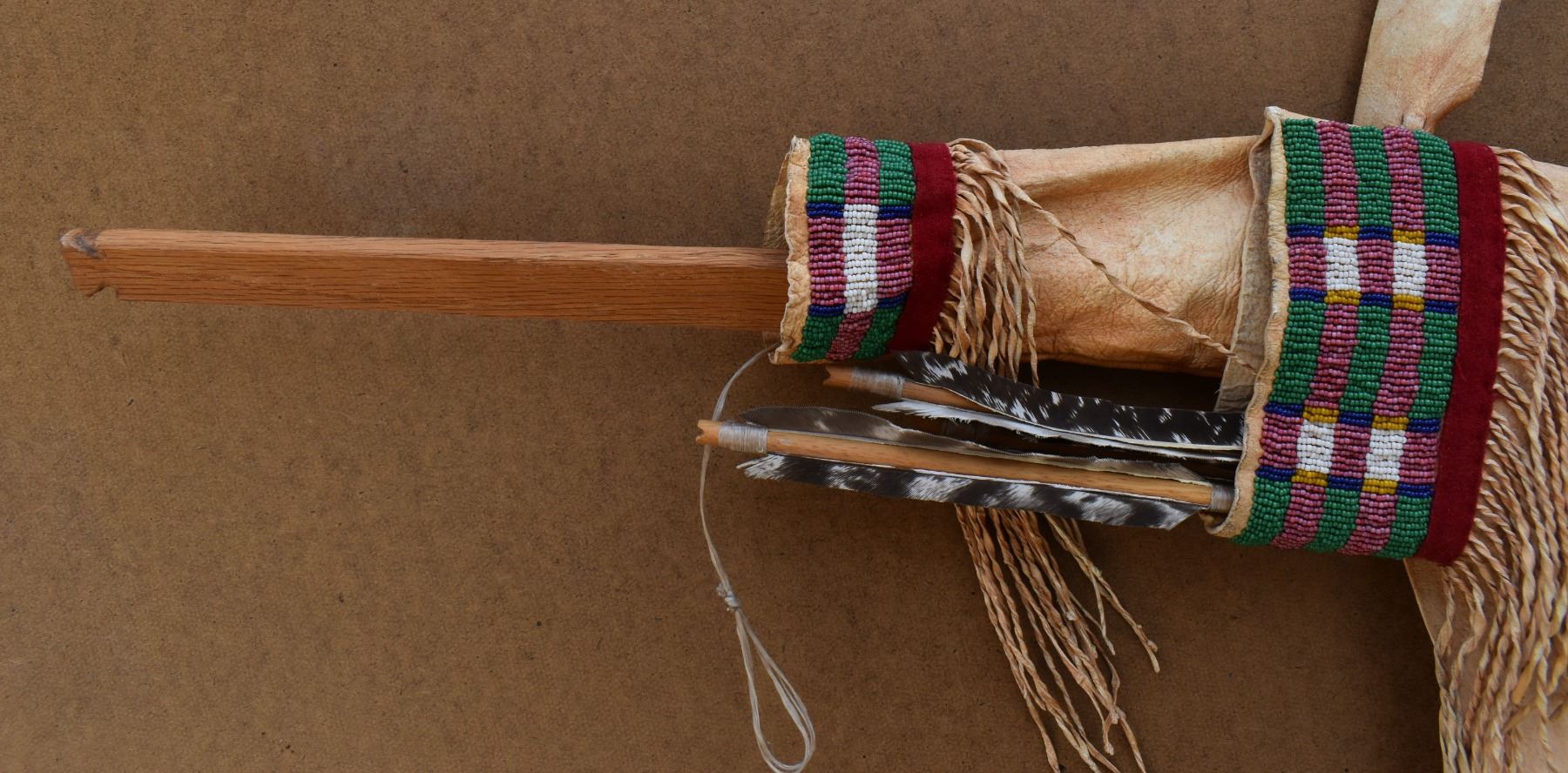 20th century plains. Beaded design on leather bow case and quiver. 36'' x 8''. Wooden bow 43'' long . Arrows 25'' long