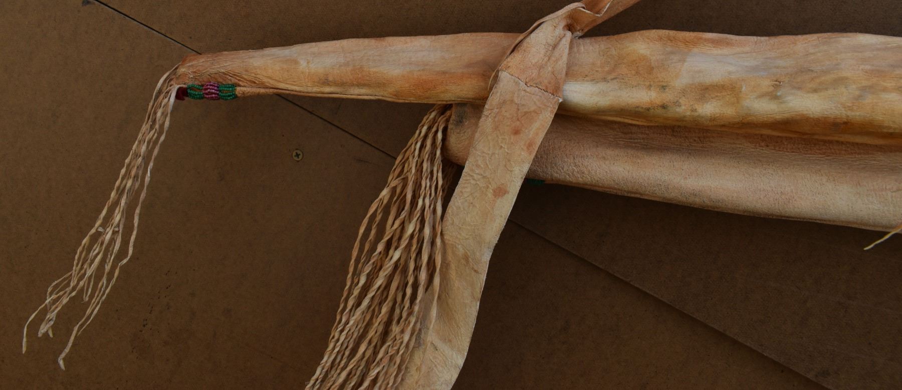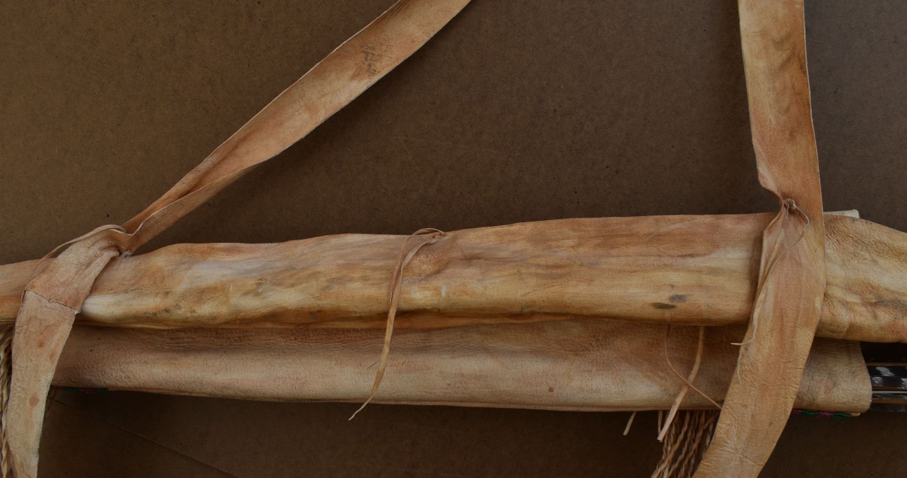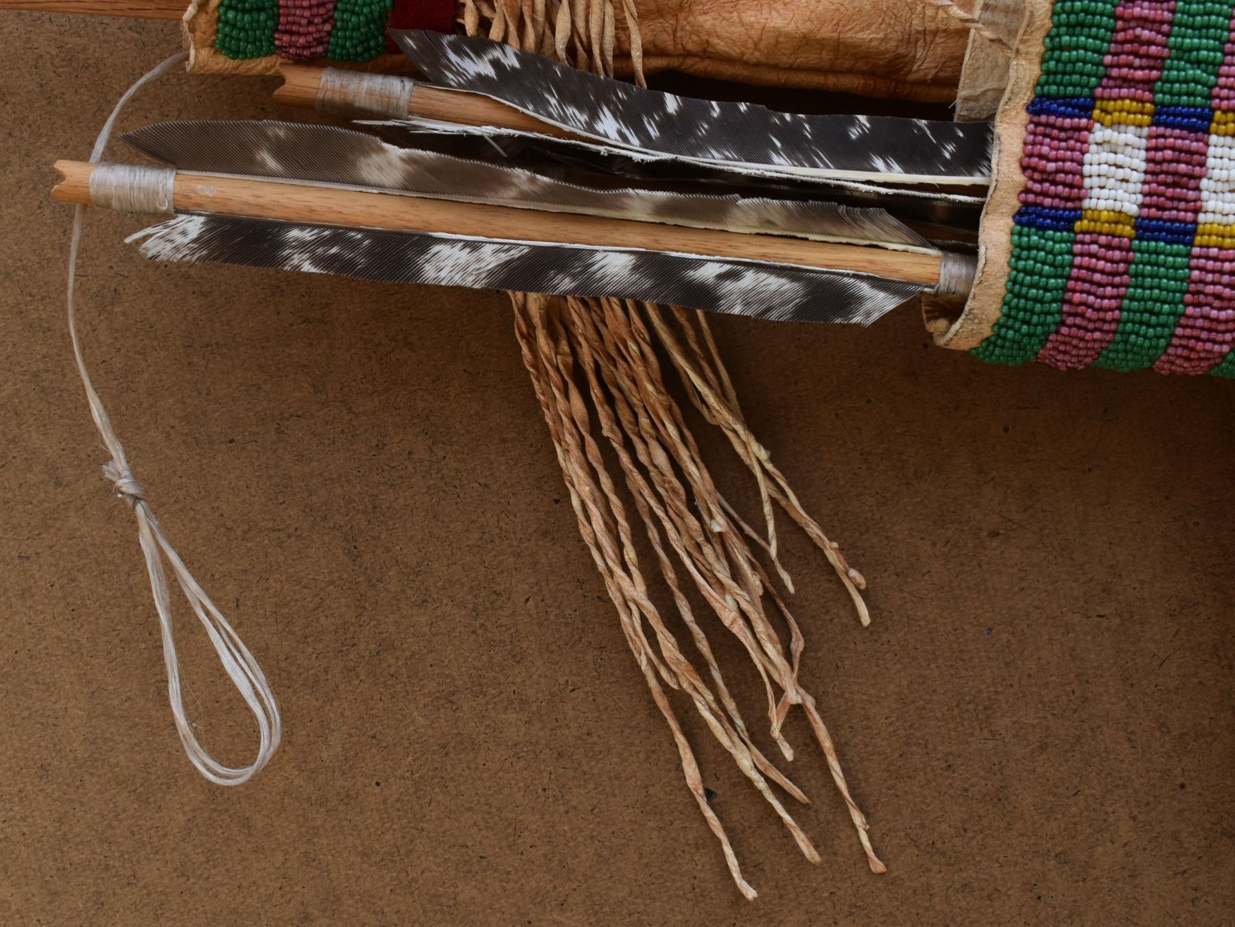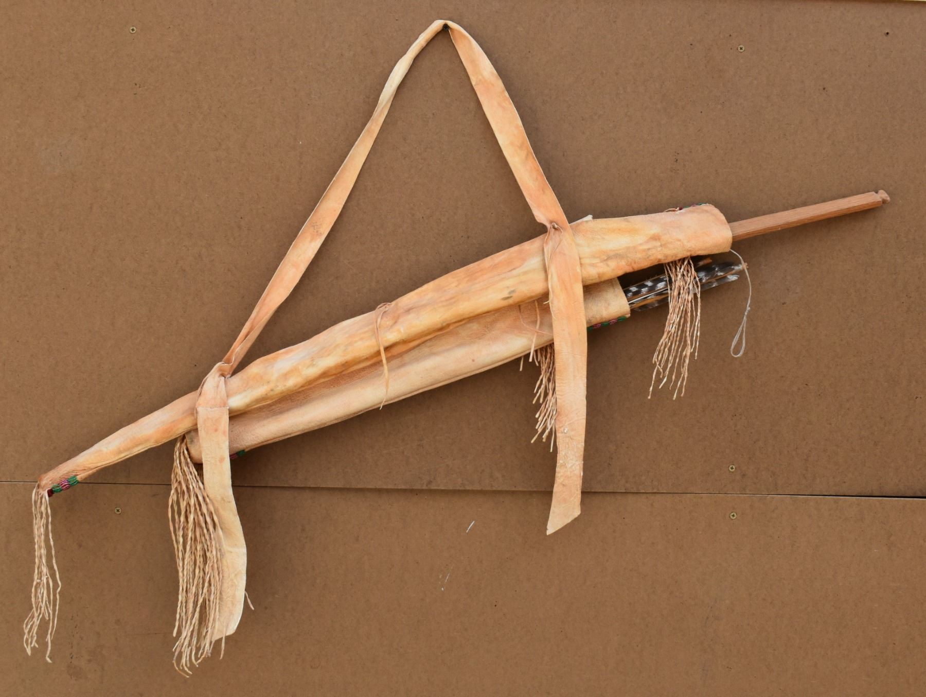 20th century plains. Beaded design on leather bow case and quiver. 36'' x 8''. Wooden bow 43'' long . Arrows 25'' long