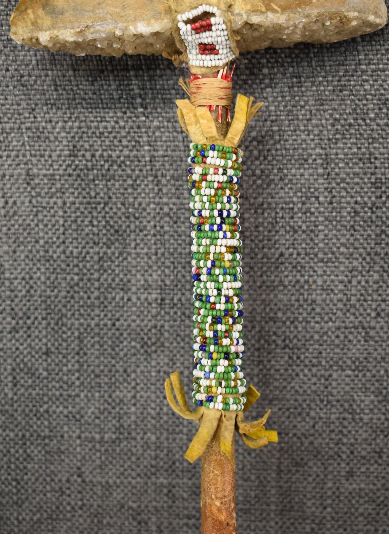 20th century plains Indian, hand made wood handle wrapped in native tanned leather with thread sown beaded design and stone head 20.5" x 4.75"