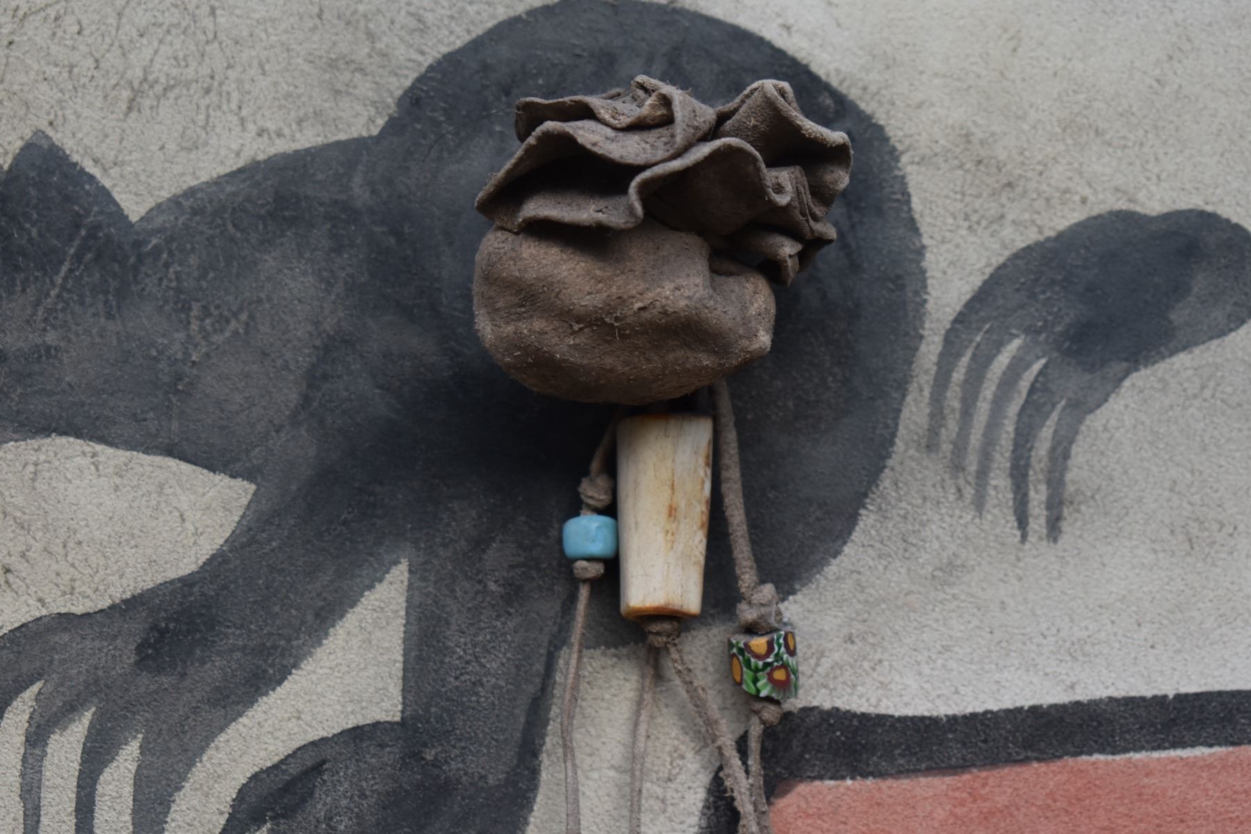 contemporary, plains. Hand painted design on commercial leather. 23'' dia. Has medicine bundle and trade cloth