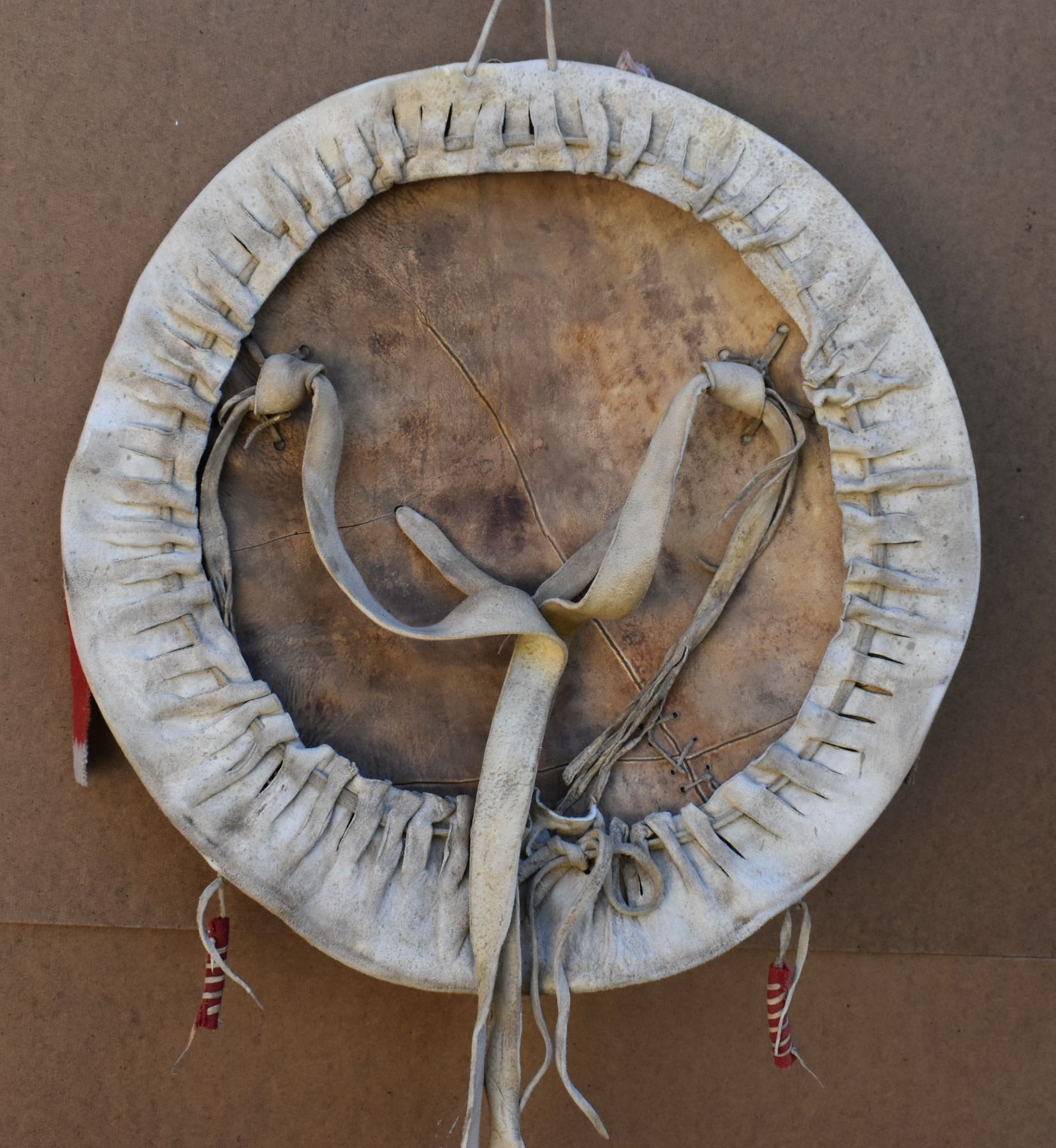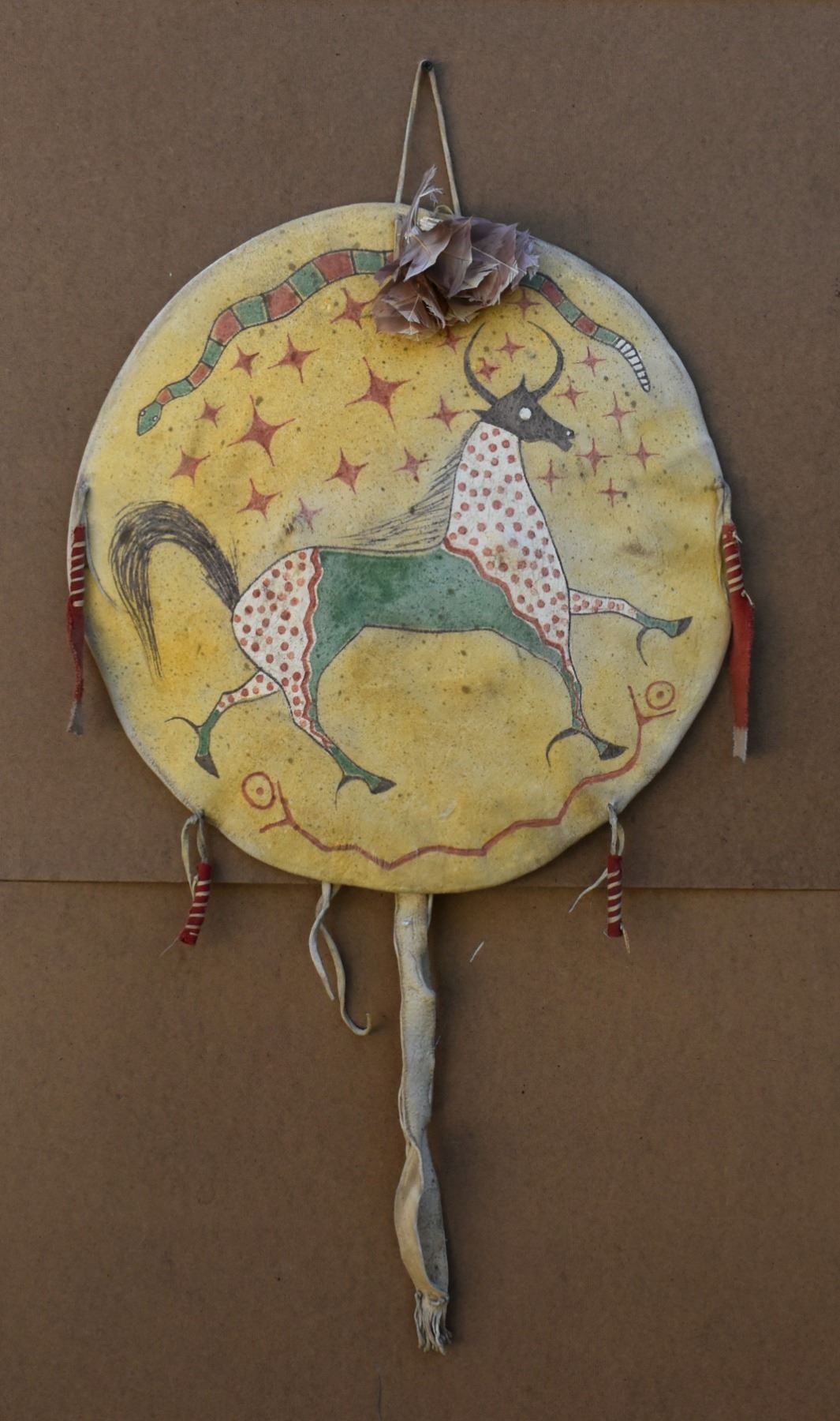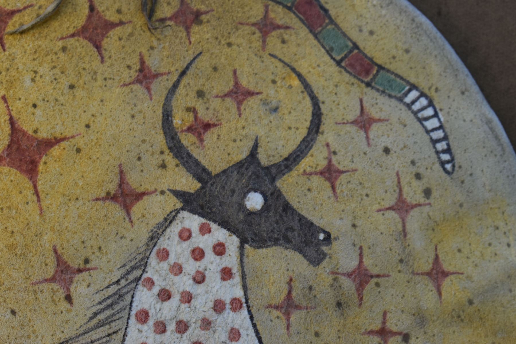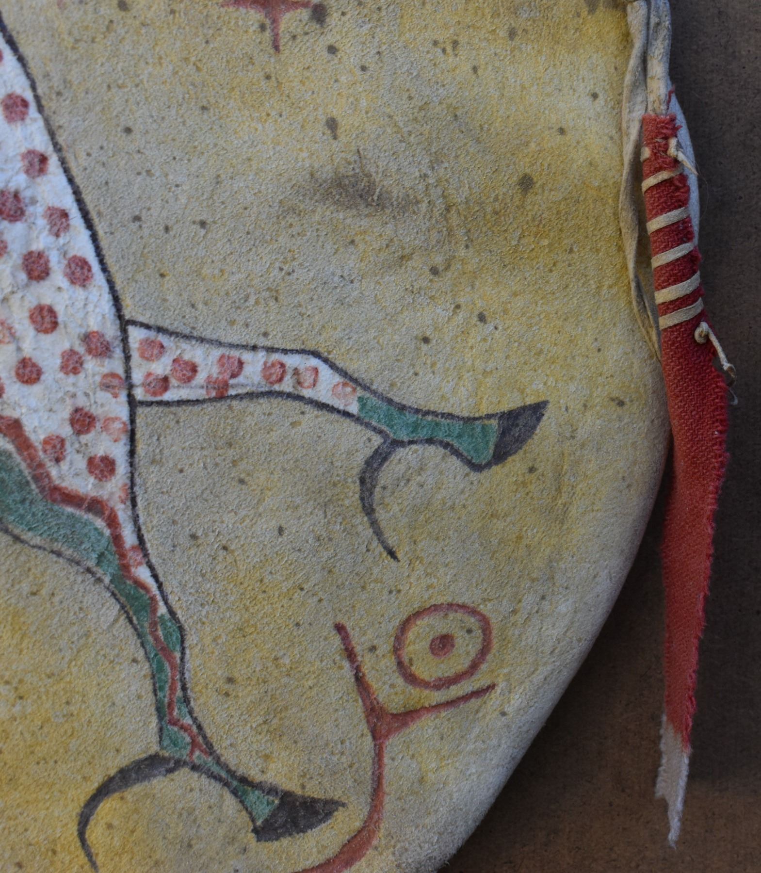 20th century plains. Hand painted design on native tanned leather hide shield cover over parfleche shield. 18'' dia