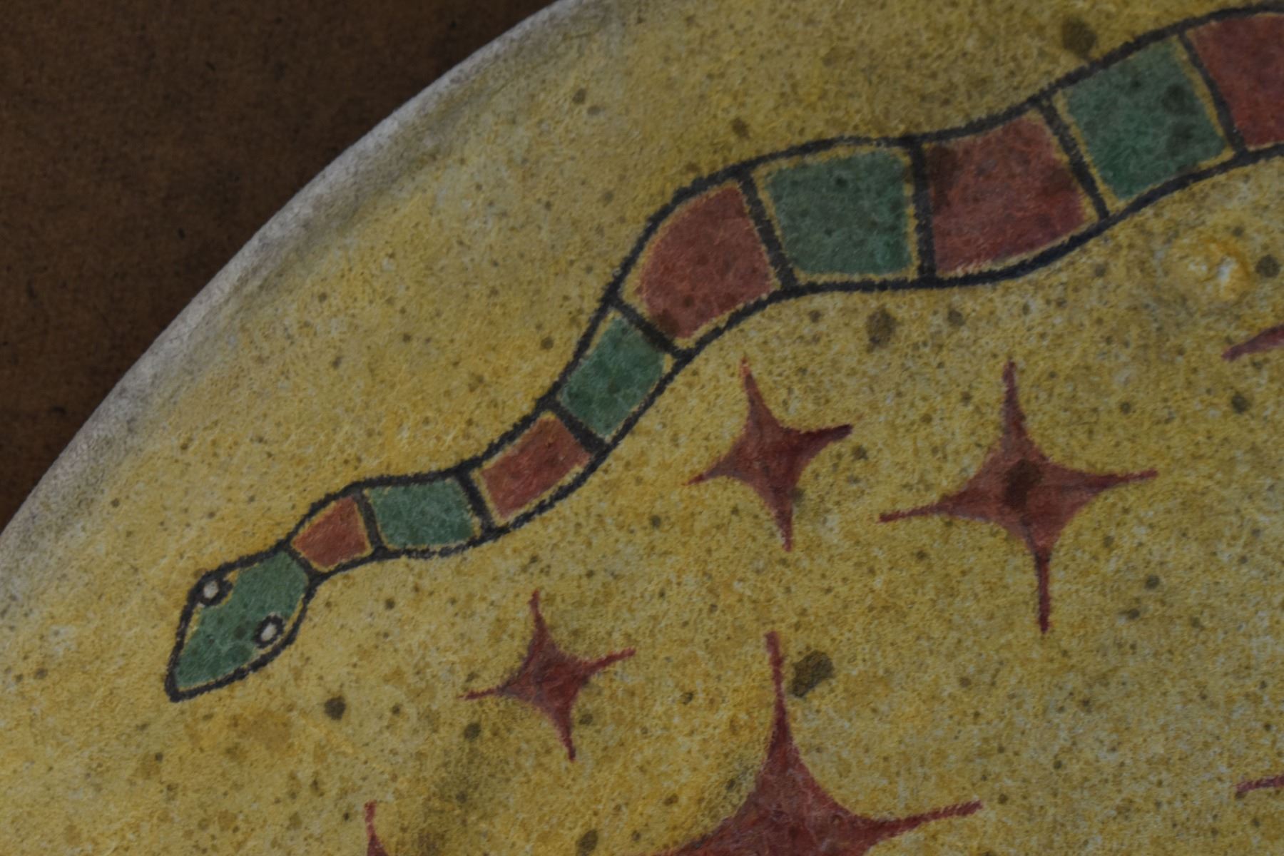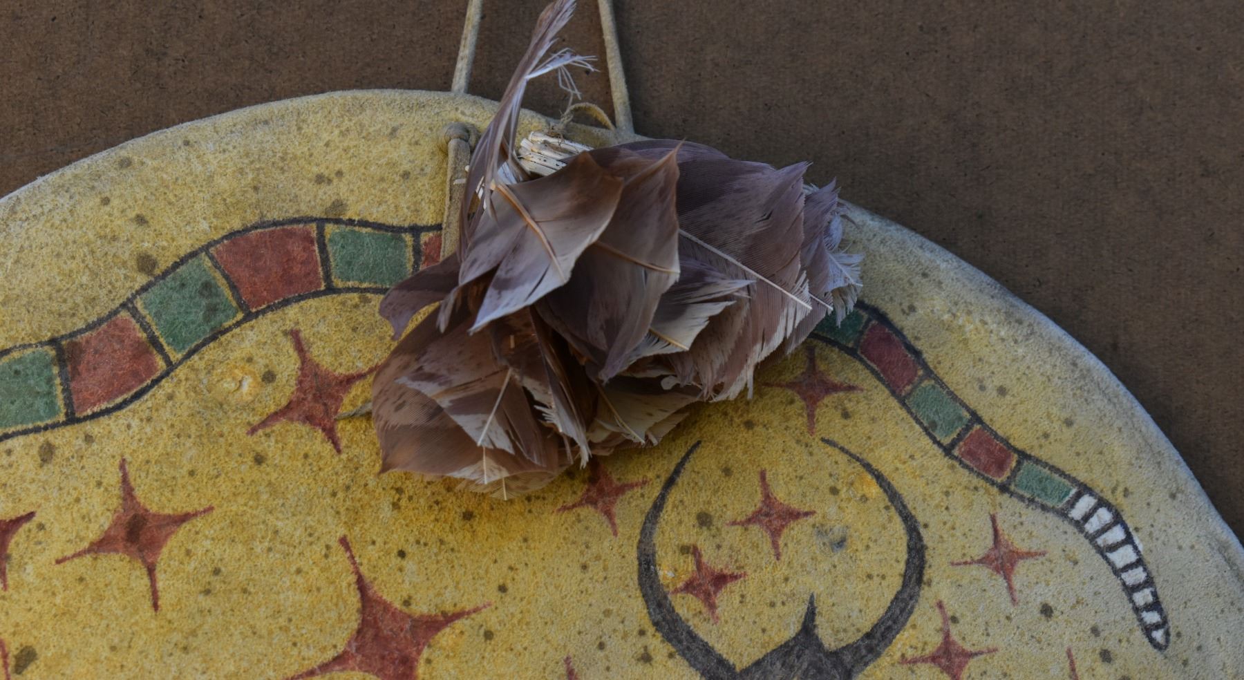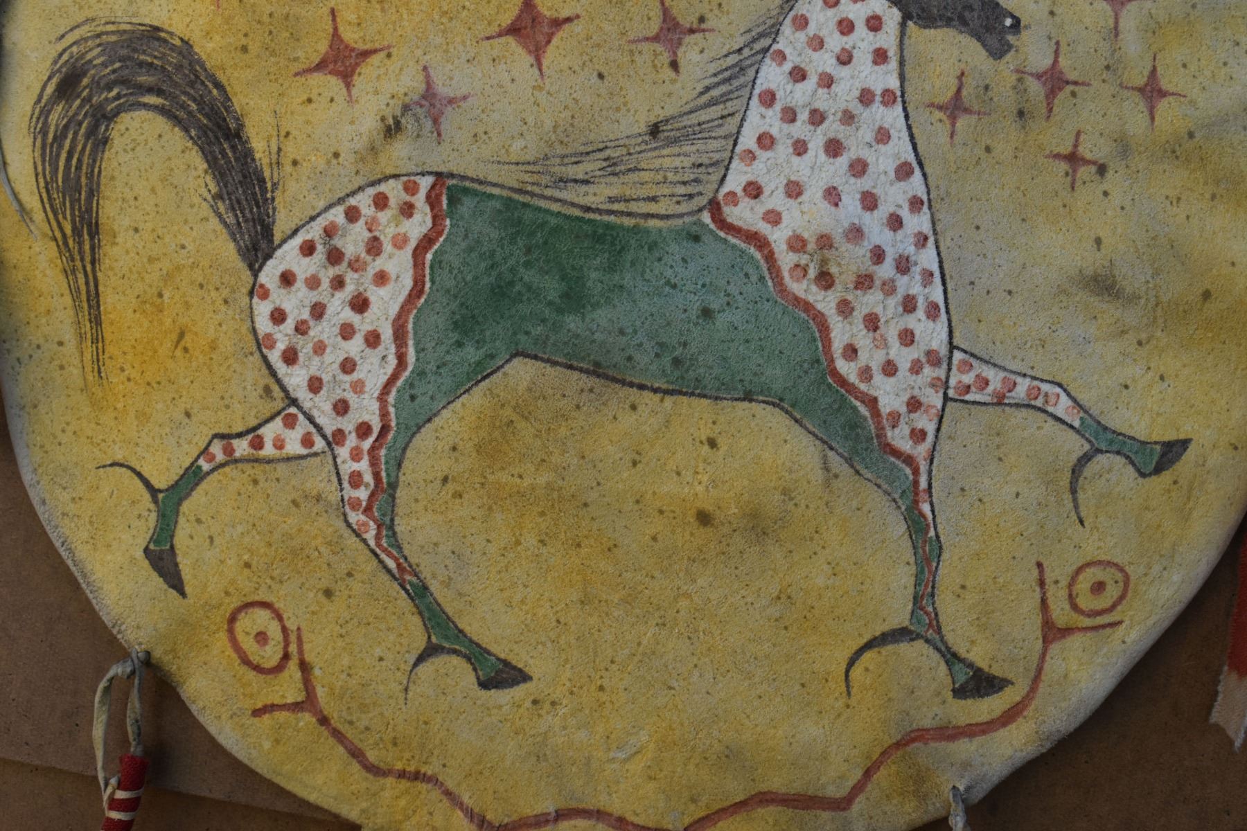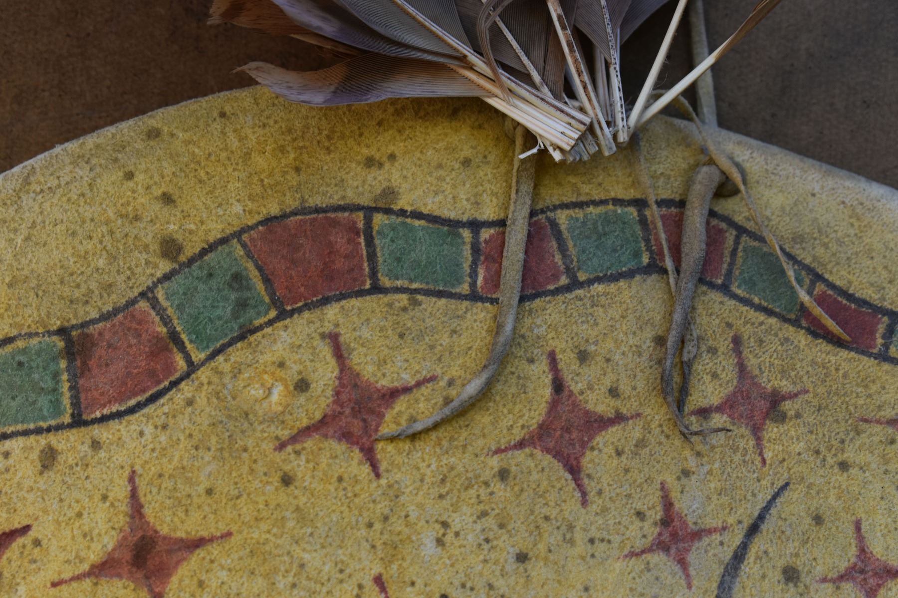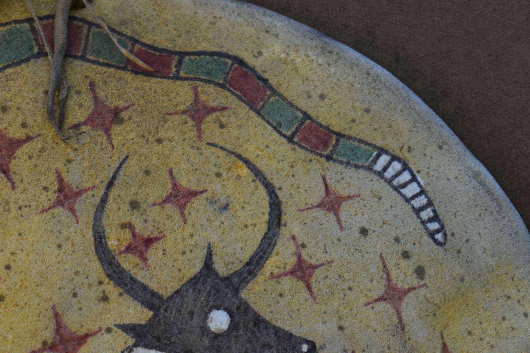 20th century plains. Hand painted design on native tanned leather hide shield cover over parfleche shield. 18'' dia