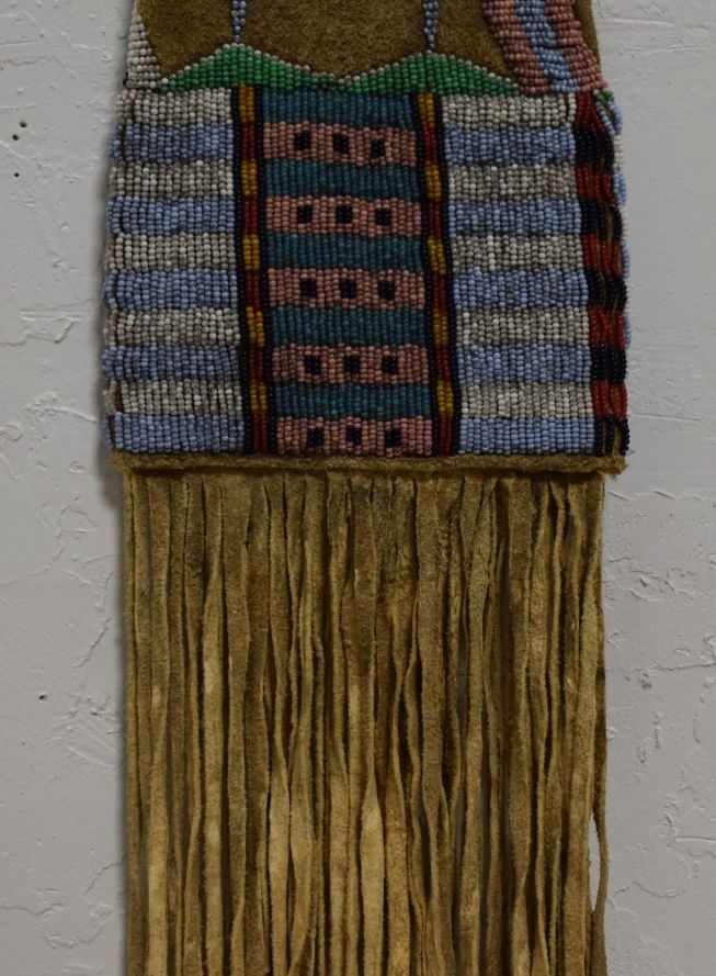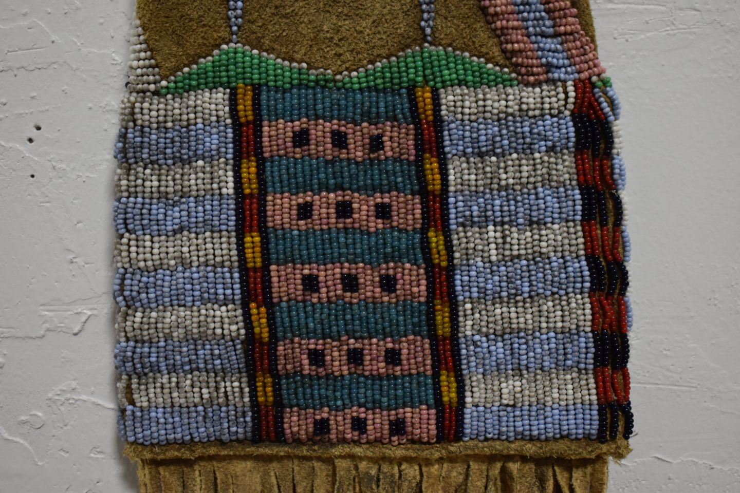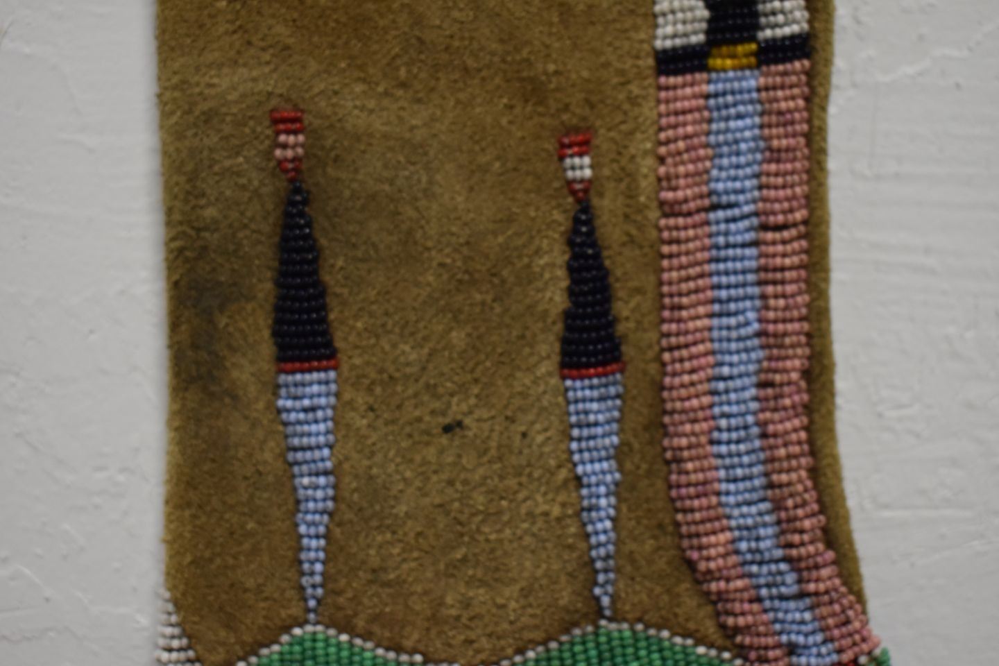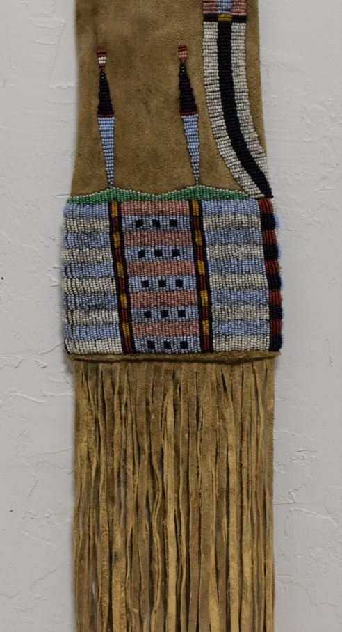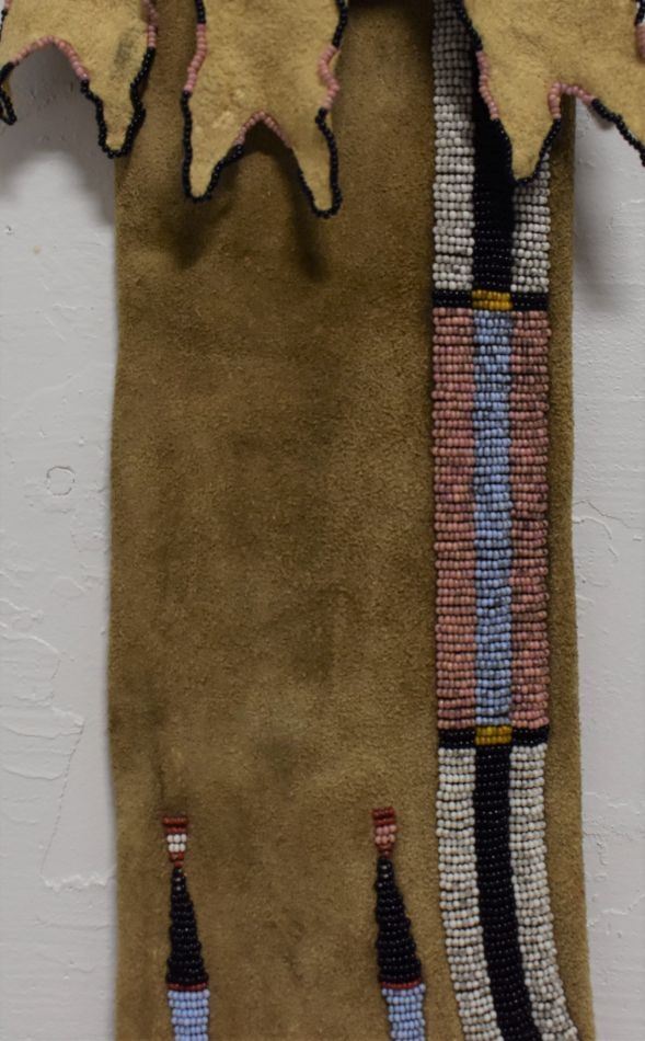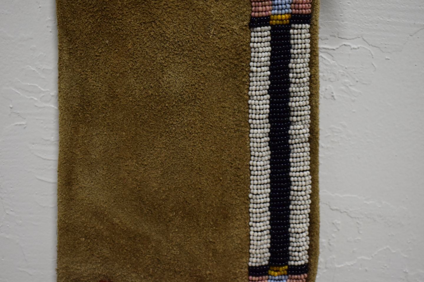20th century Plains Indian. Thread sewn beaded design on native tanned leather. 27'' x 5''.