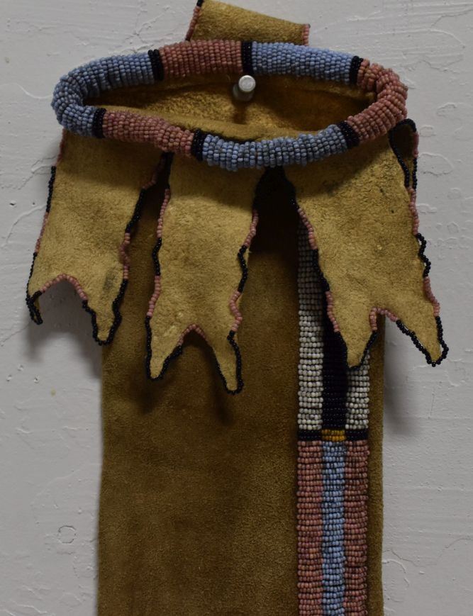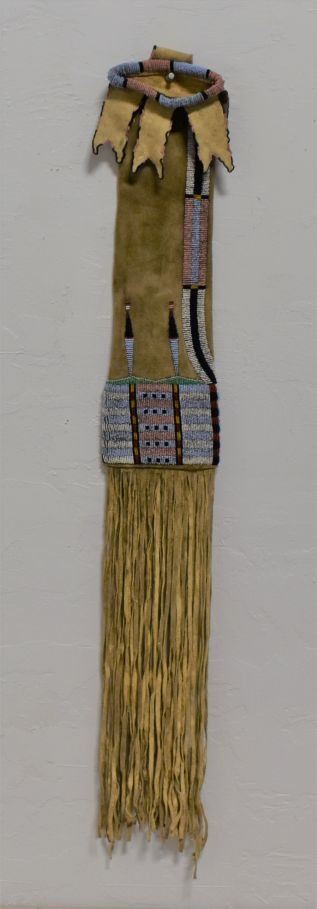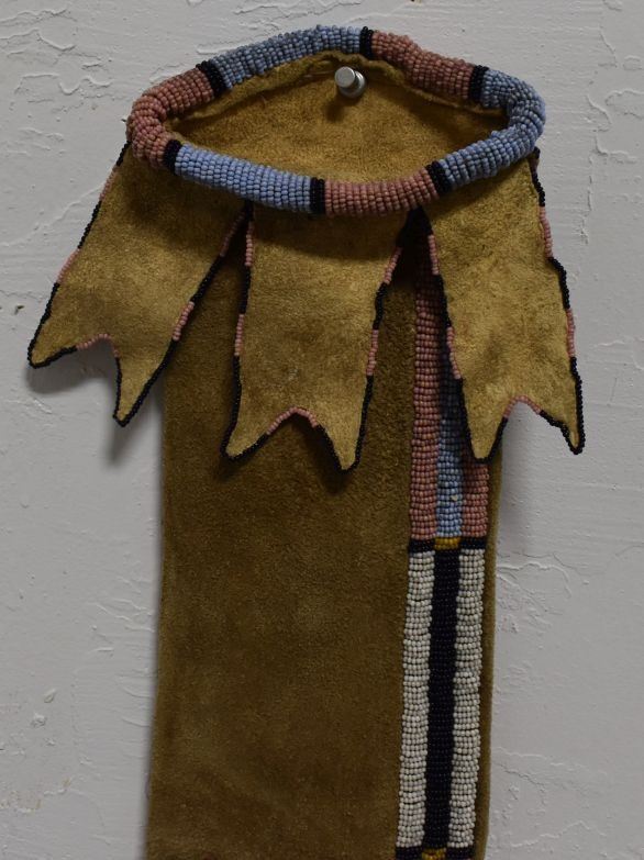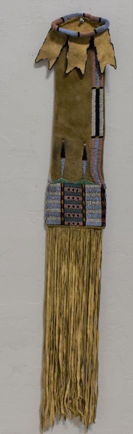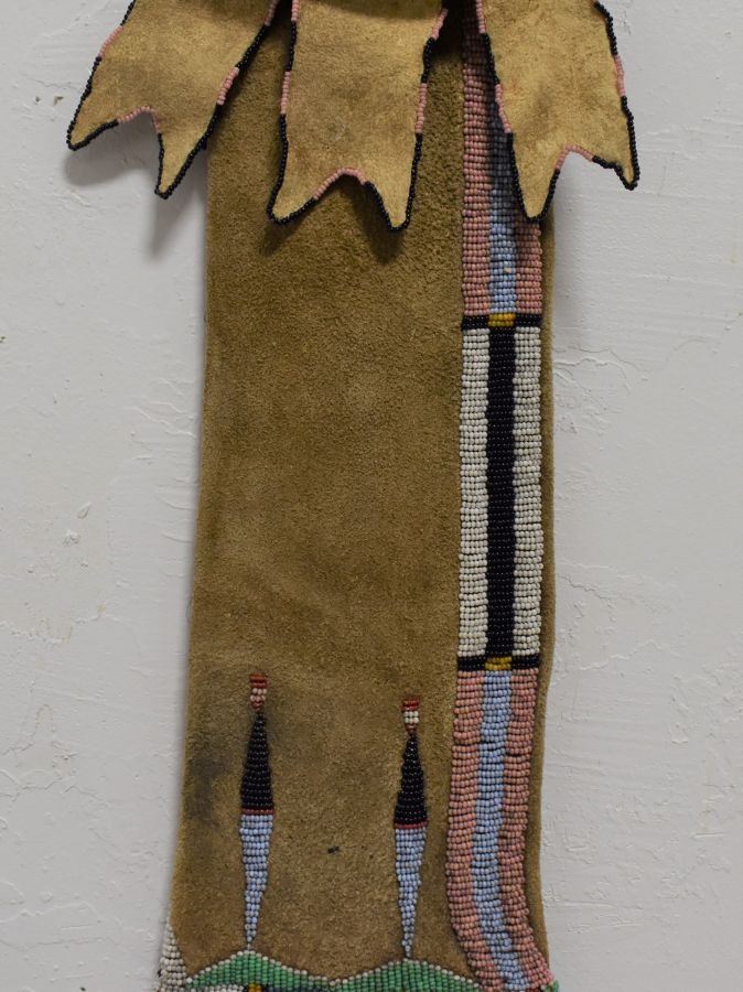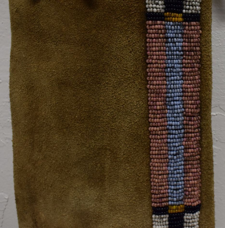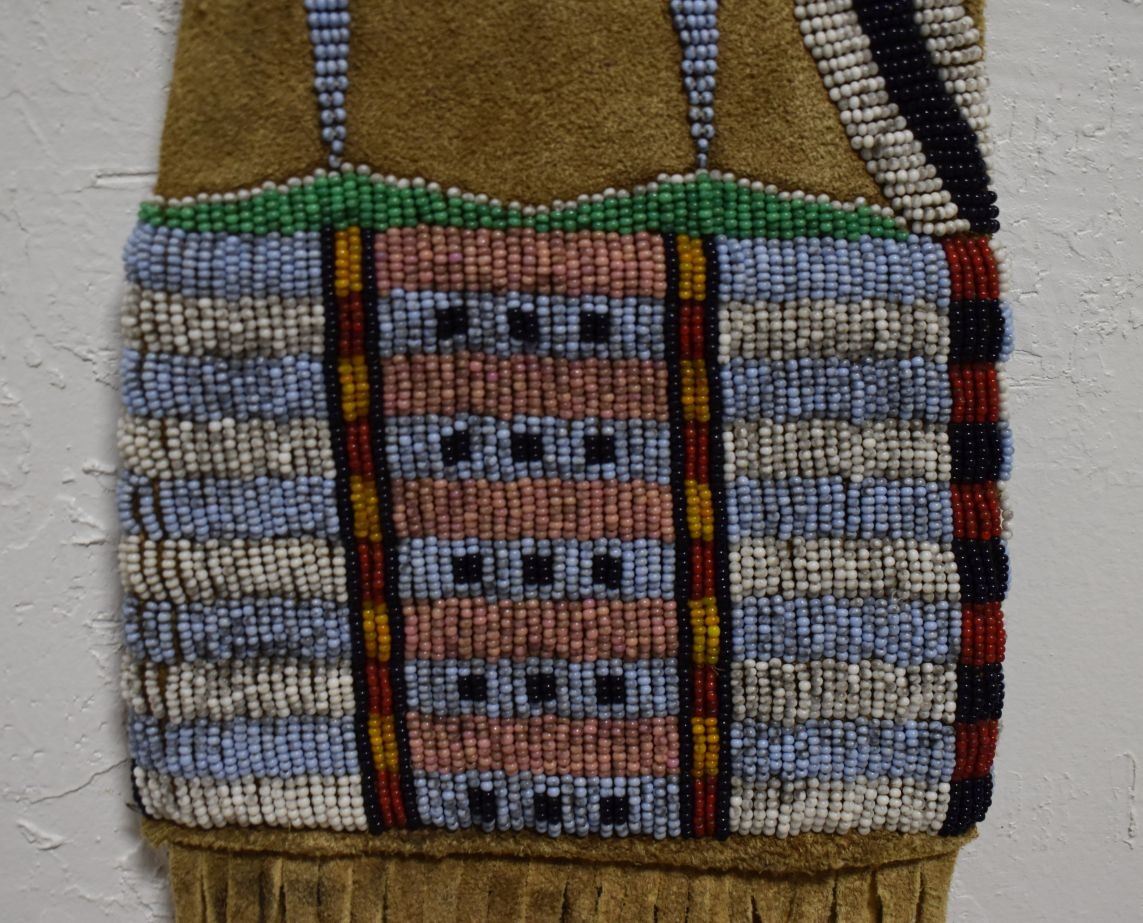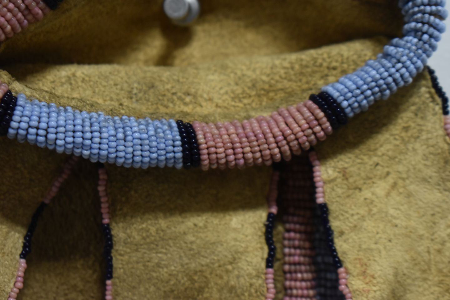 20th century Plains Indian. Thread sewn beaded design on native tanned leather. 27'' x 5''.