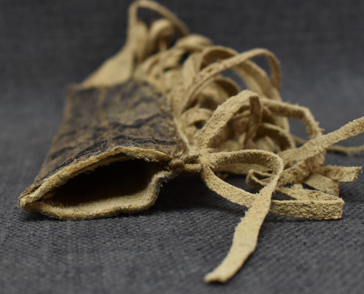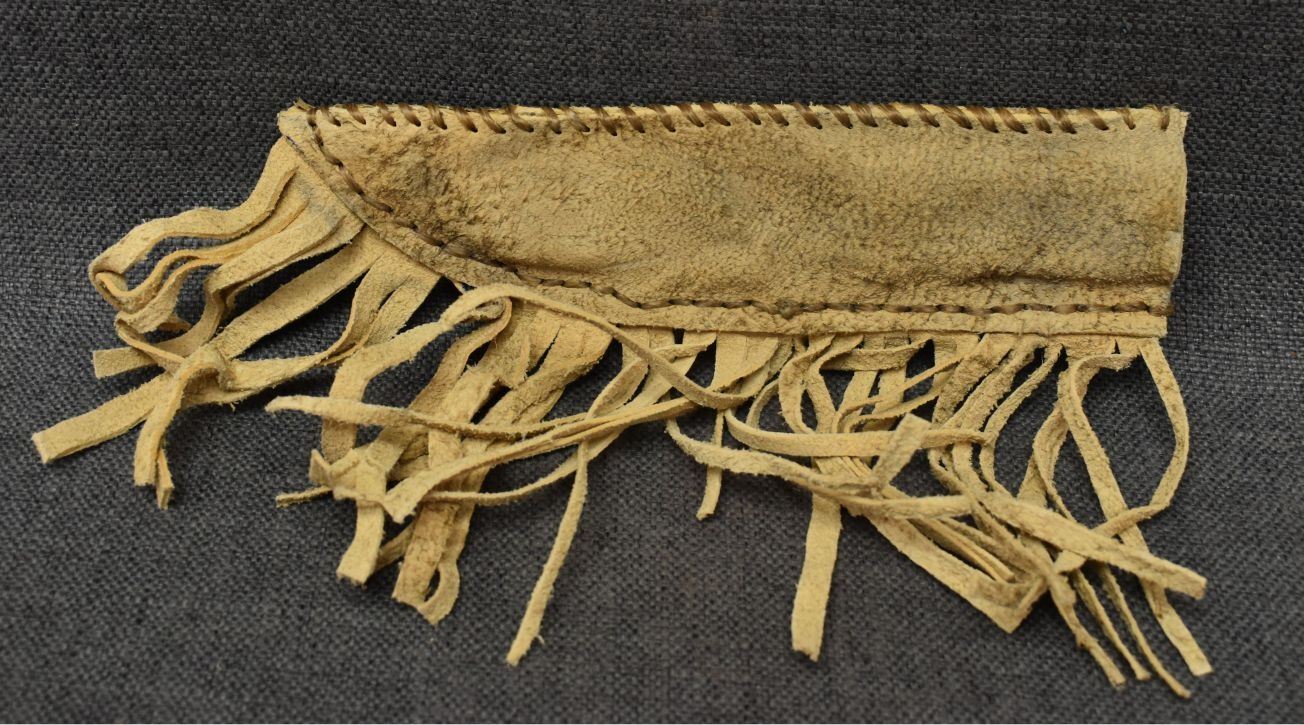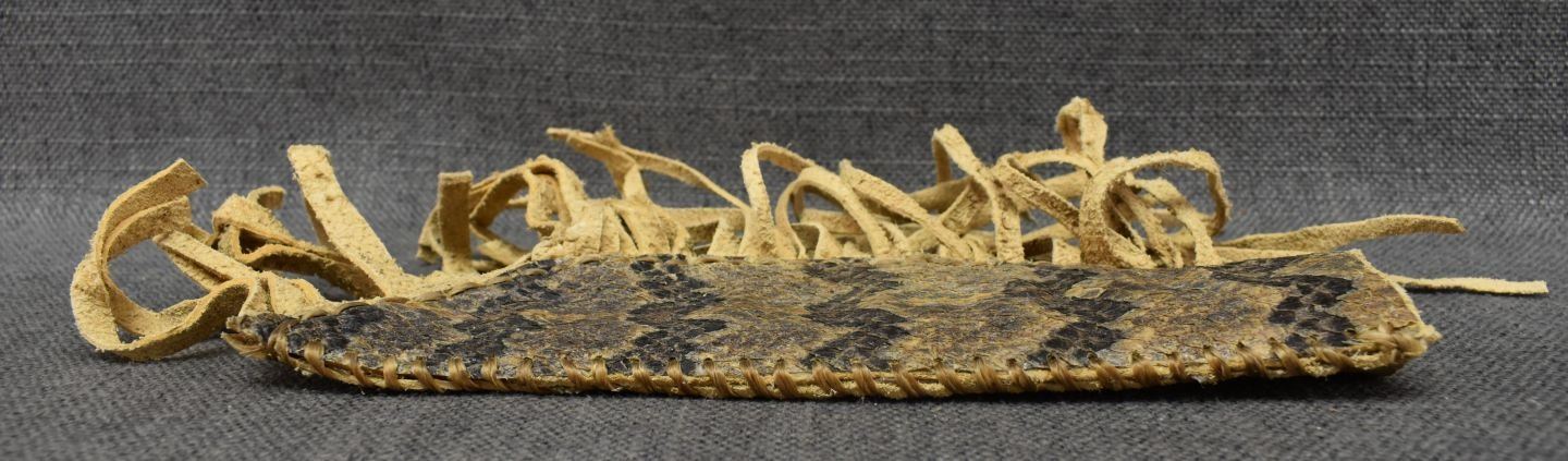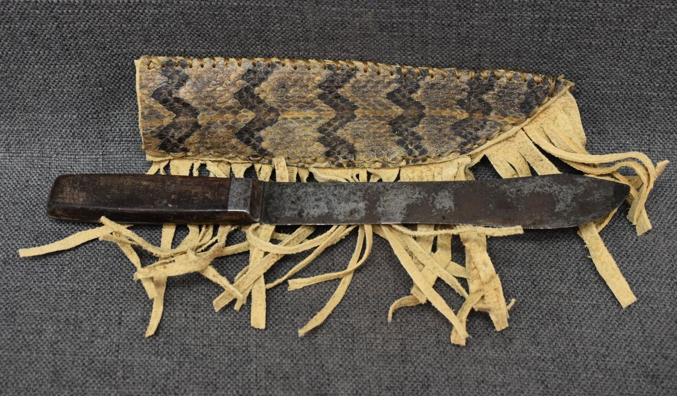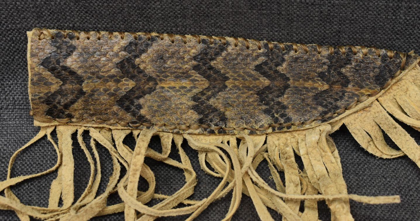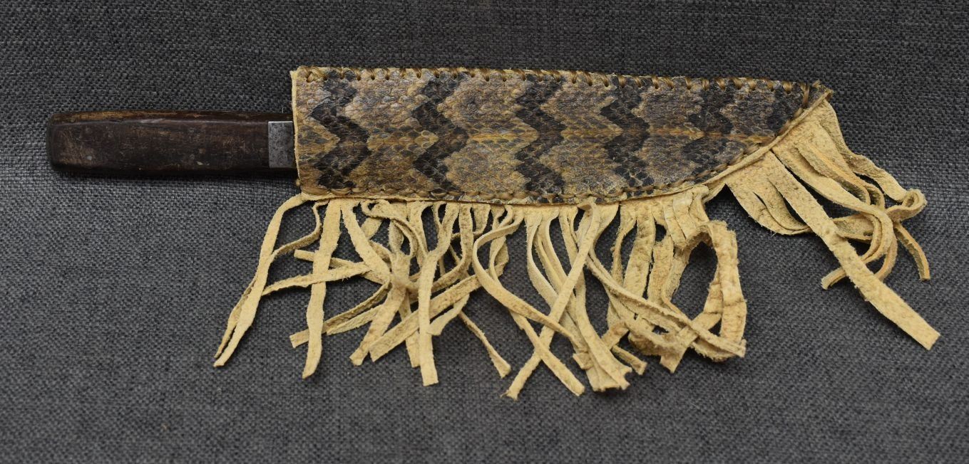 20th century plains, hand made from native tanned leather and rattlesnake skin 9.75" x 2.5" excluding fringe, knife is 12.75" long