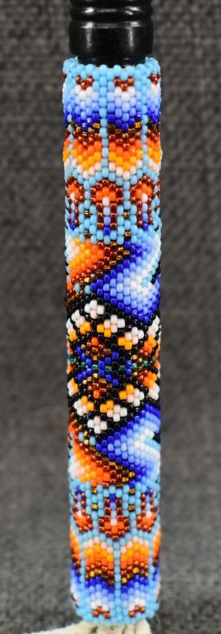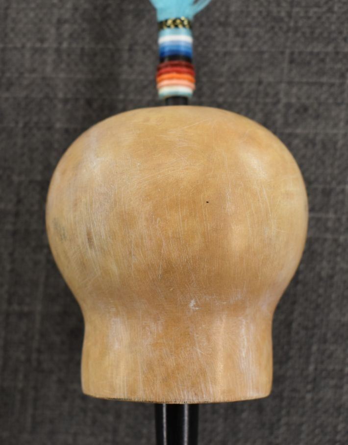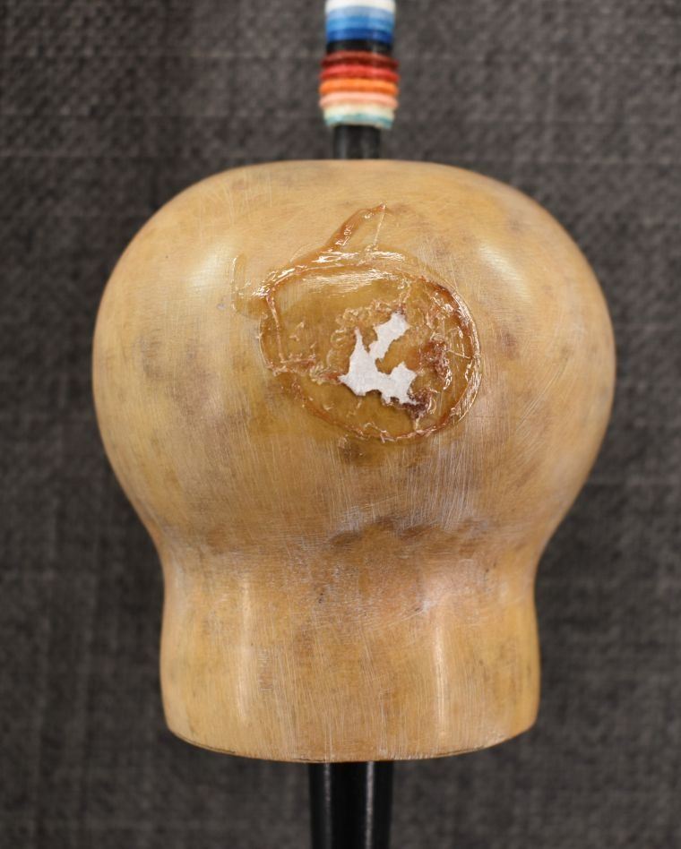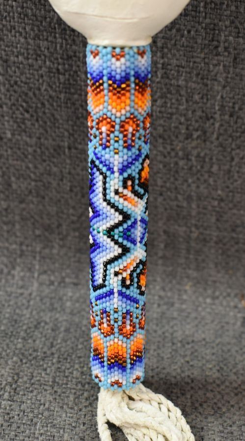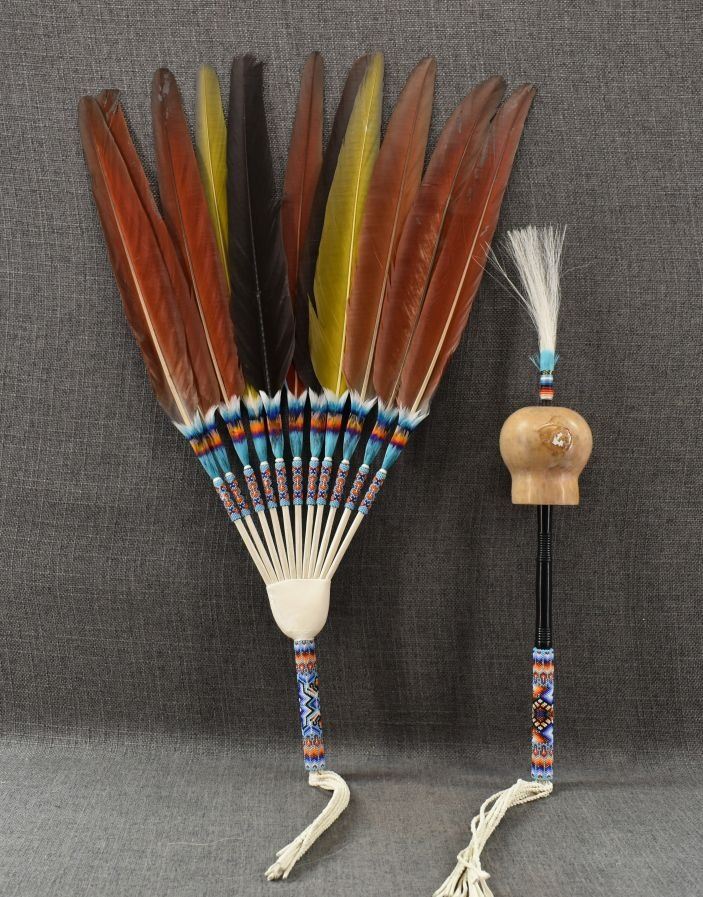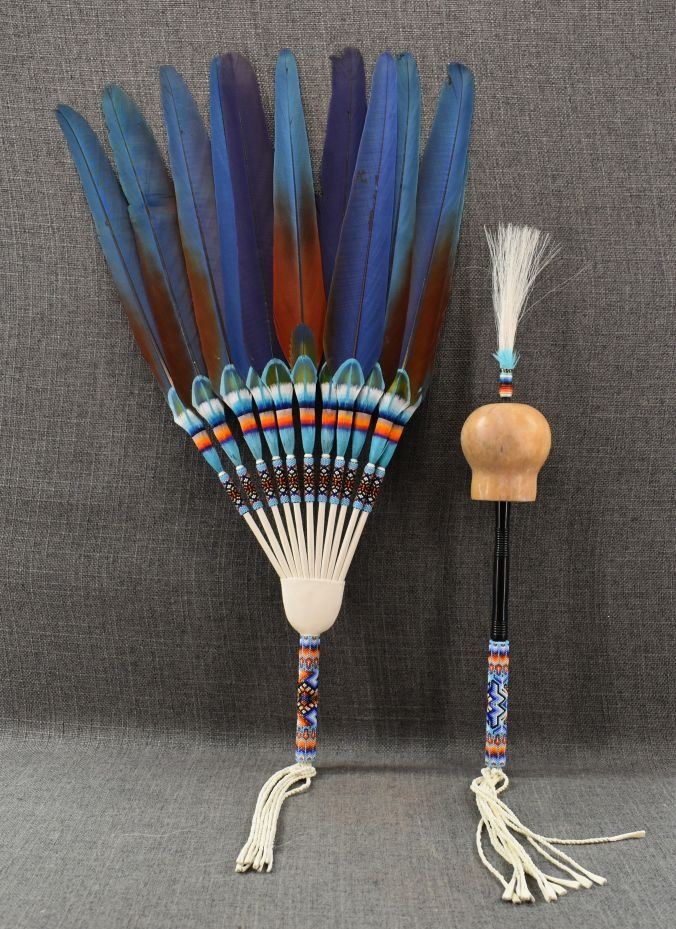 20th century. Plains peyote fan. 31'' x 12''. Gourd rattle 26'' long