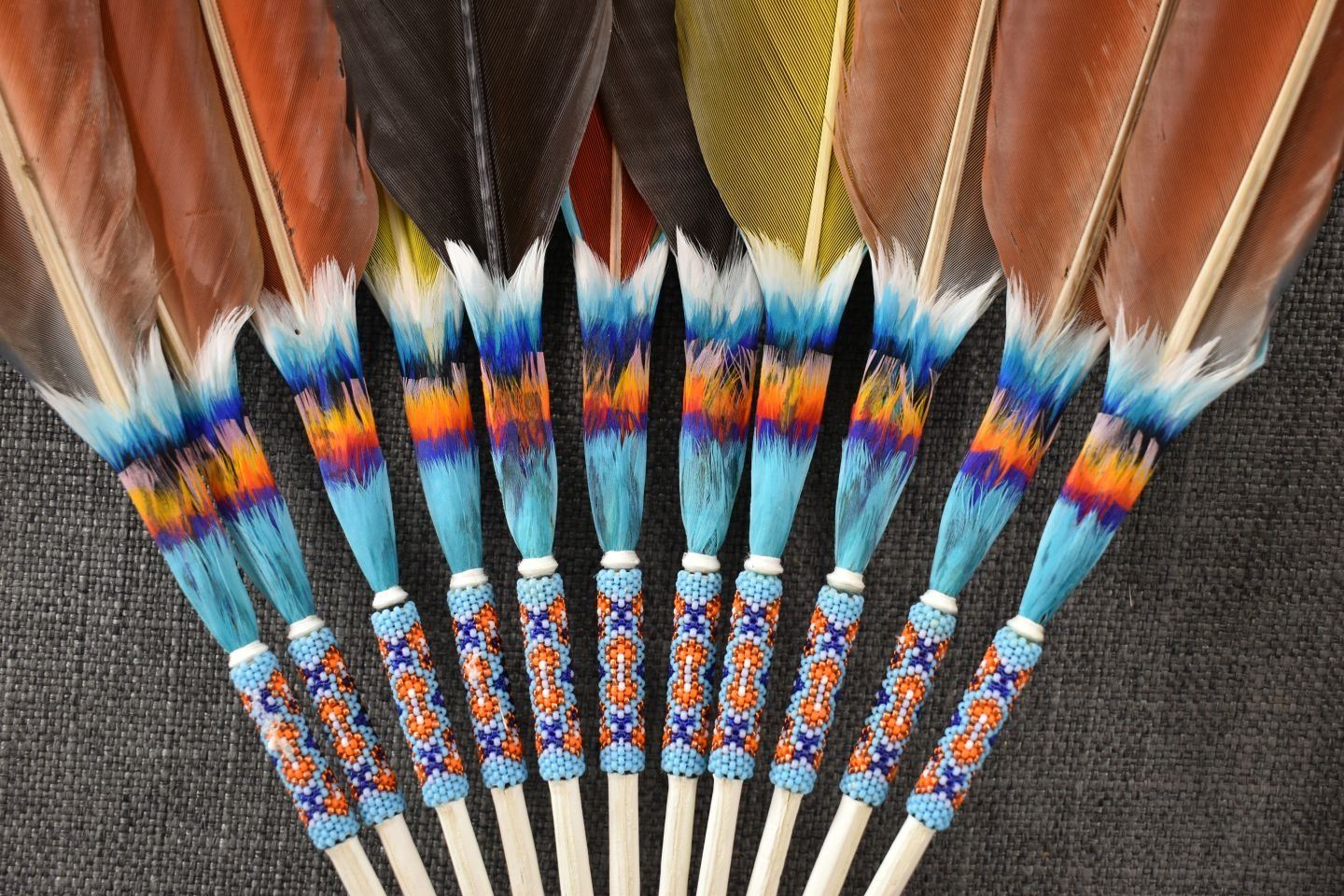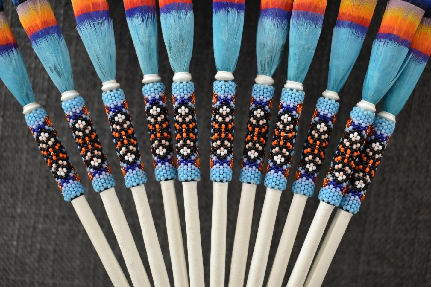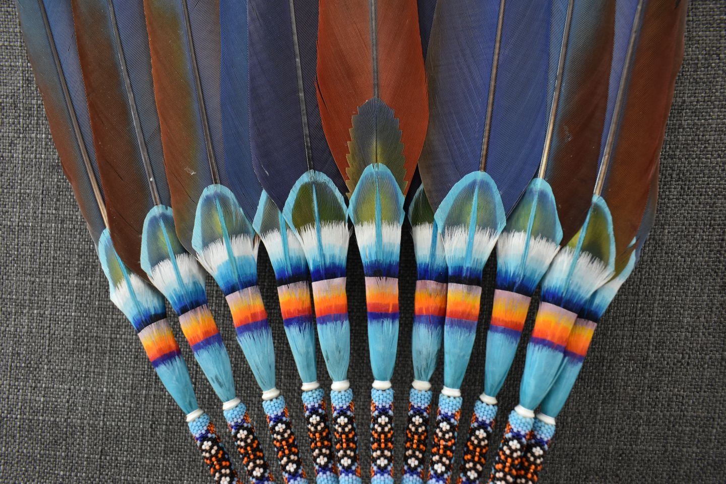 20th century. Plains peyote fan. 31'' x 12''. Gourd rattle 26'' long