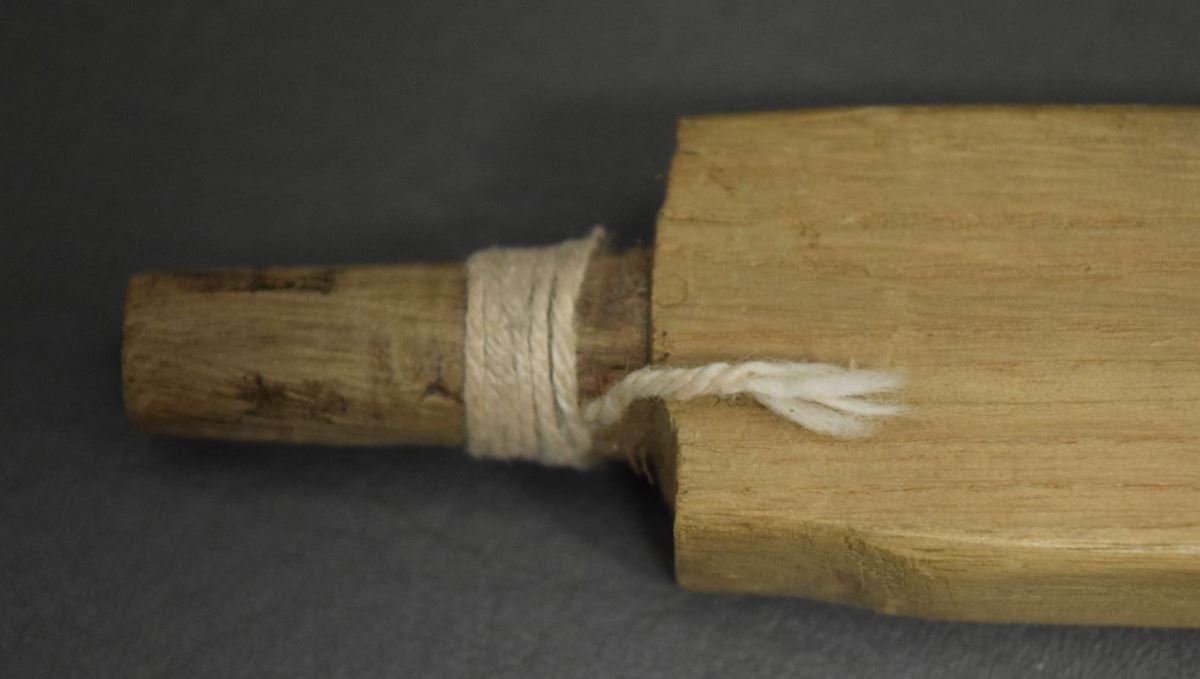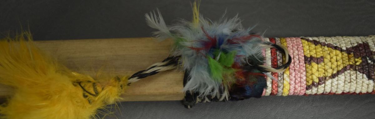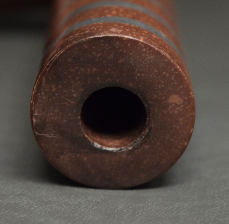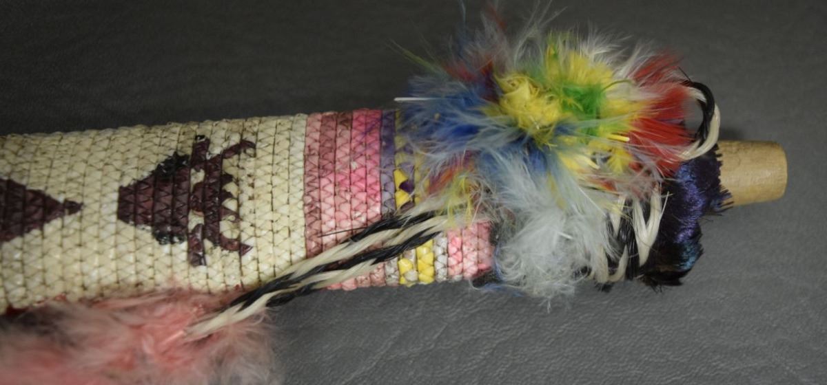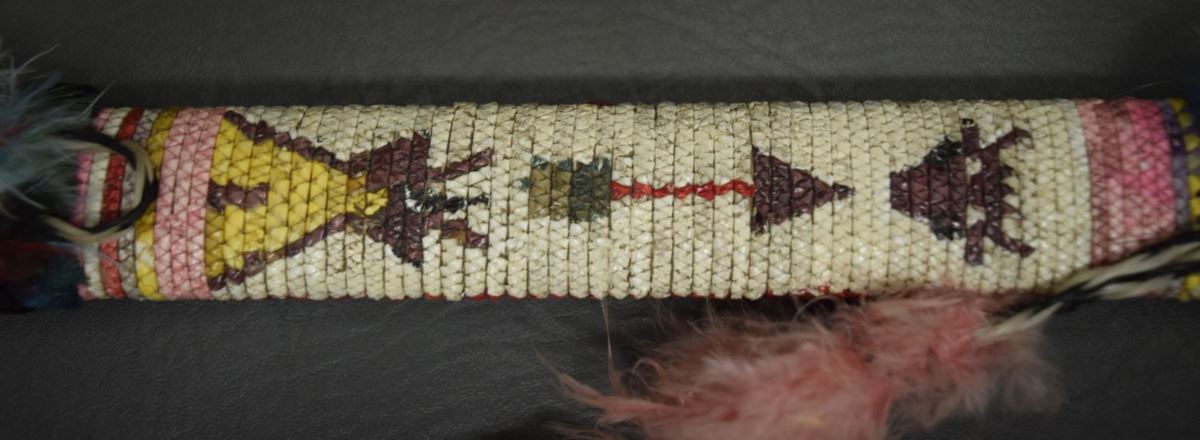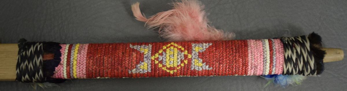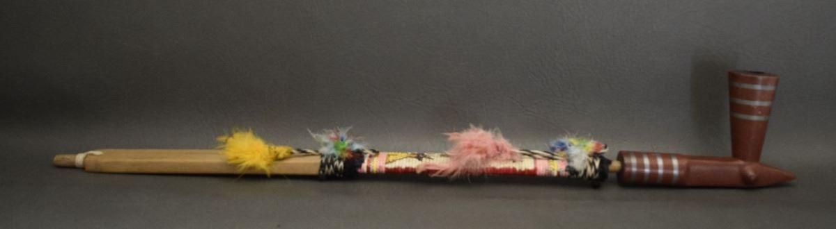 1940's pipe stone pipe bowl with lead inlay 4'' x 6'' x 1.5'' and wooden stem with pictorial quilled design 20'' long