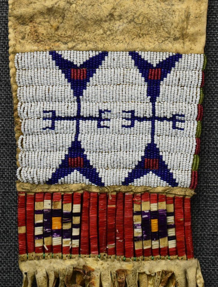 20th century plains Indian, hand made from native tanned leather with sinew sown beaded and quilled design 17" x 5" including fringe