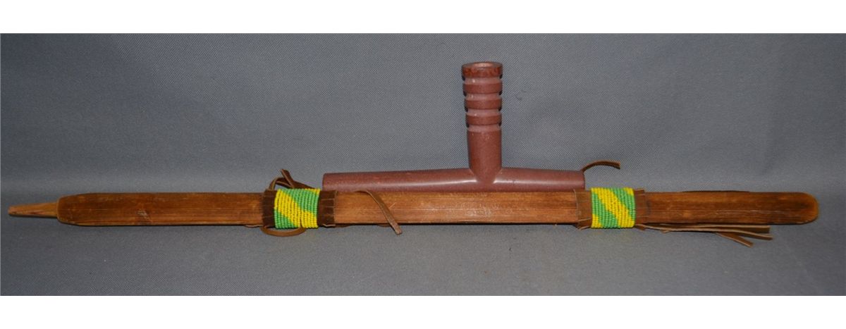 1970s 80s Pipe tone bowl and carved wood stem with beads signed Heyoka 31" long