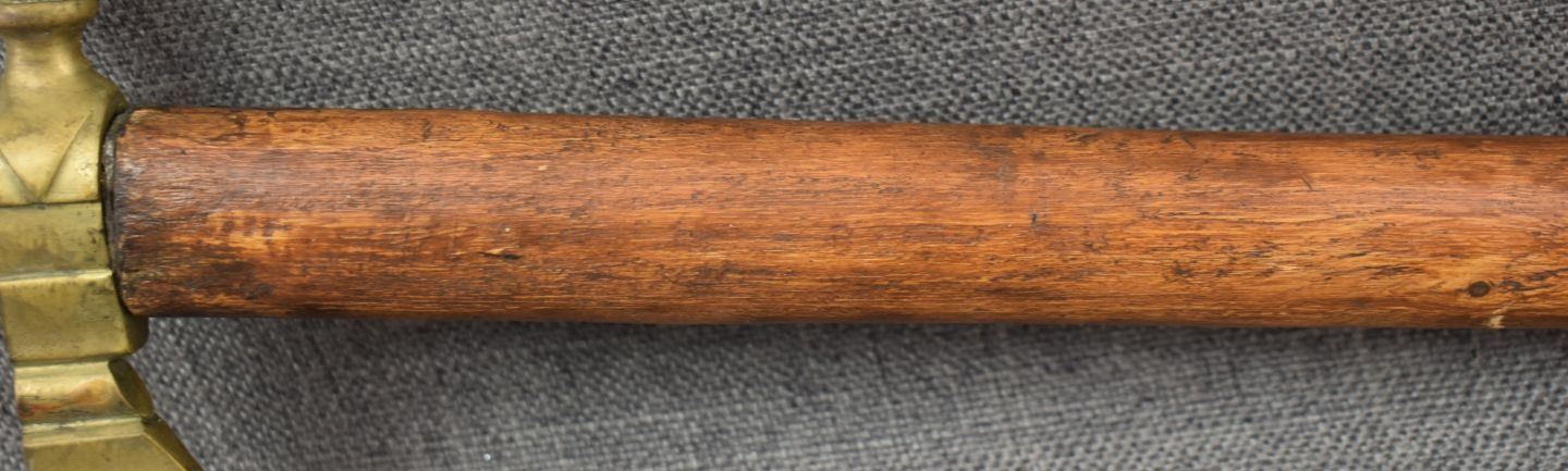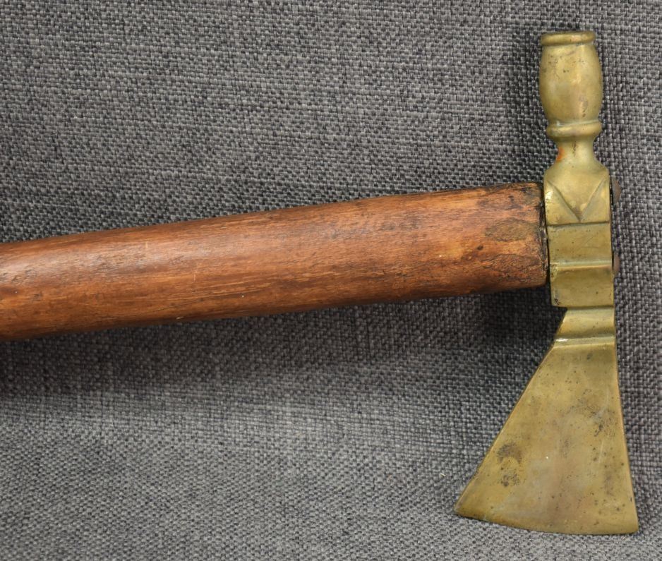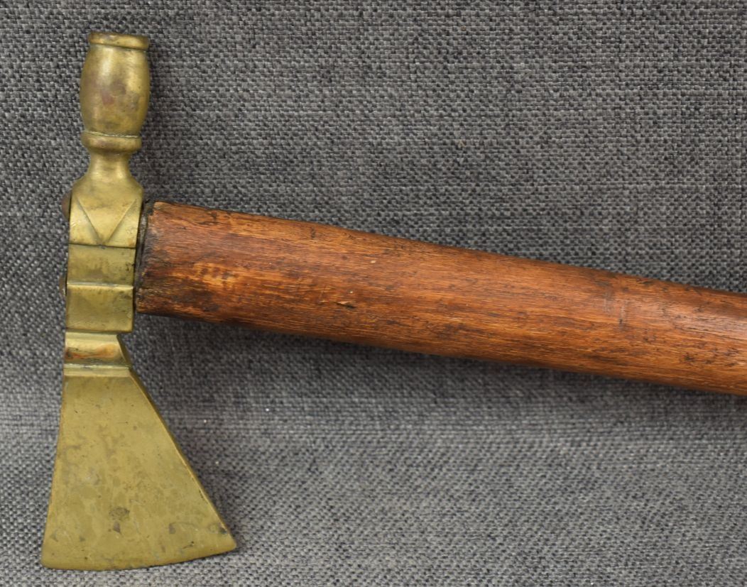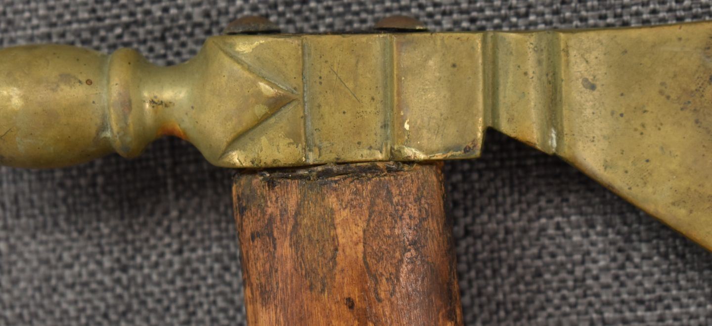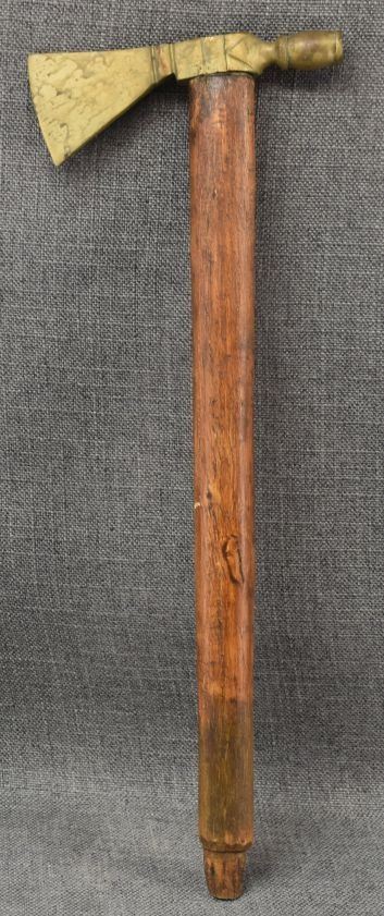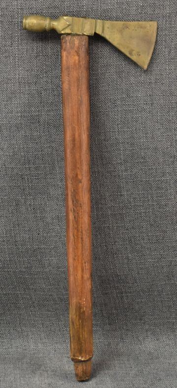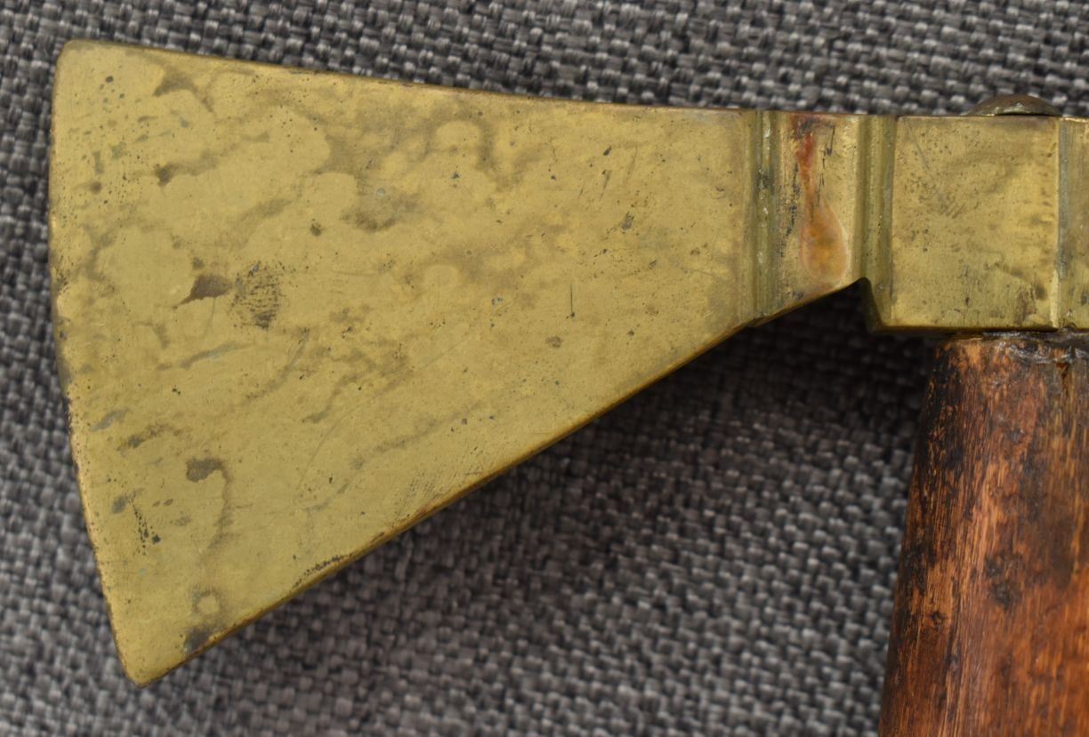 20th century. Commercial brass tomahawk head 7'' x 2.5'' and wooden stem18'' long