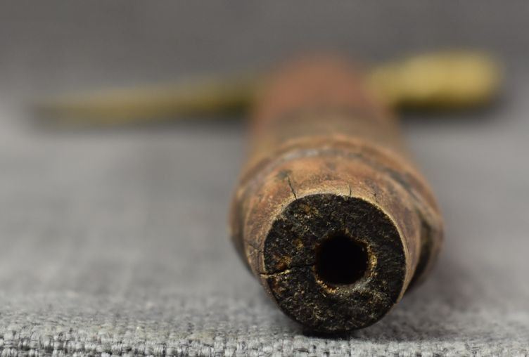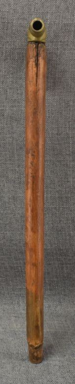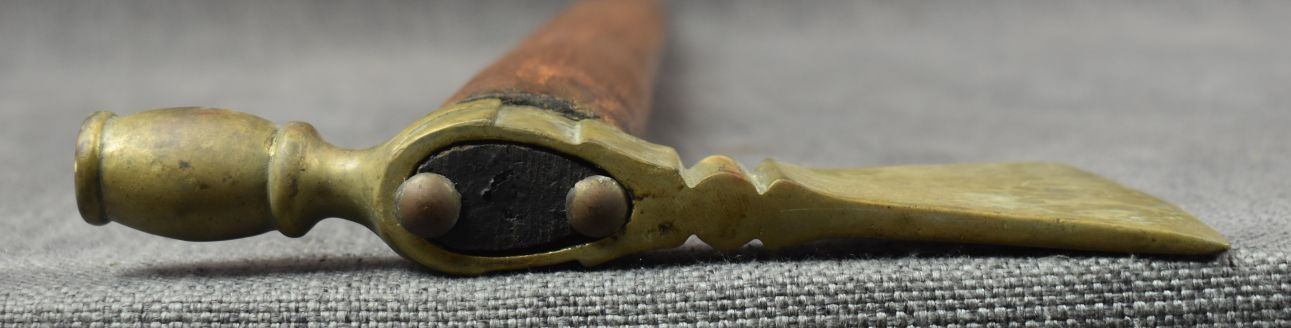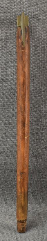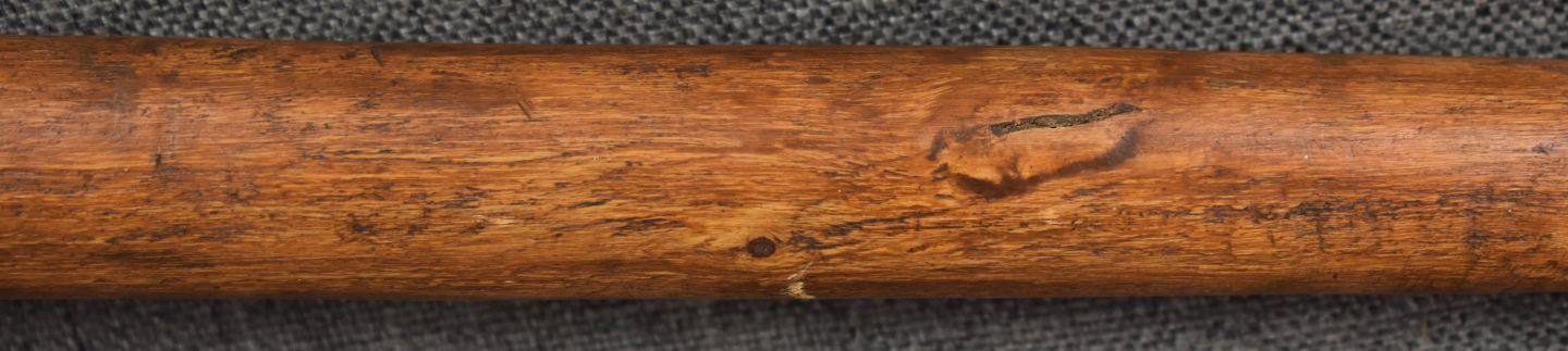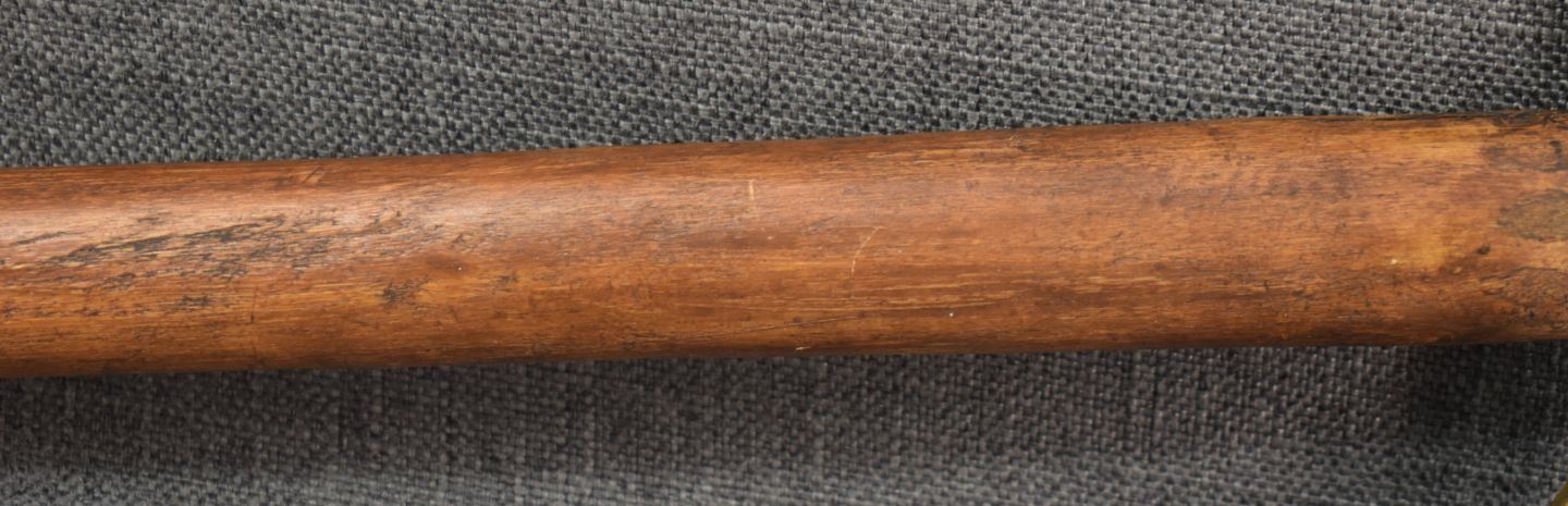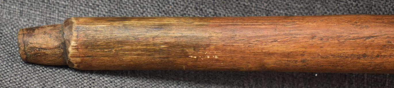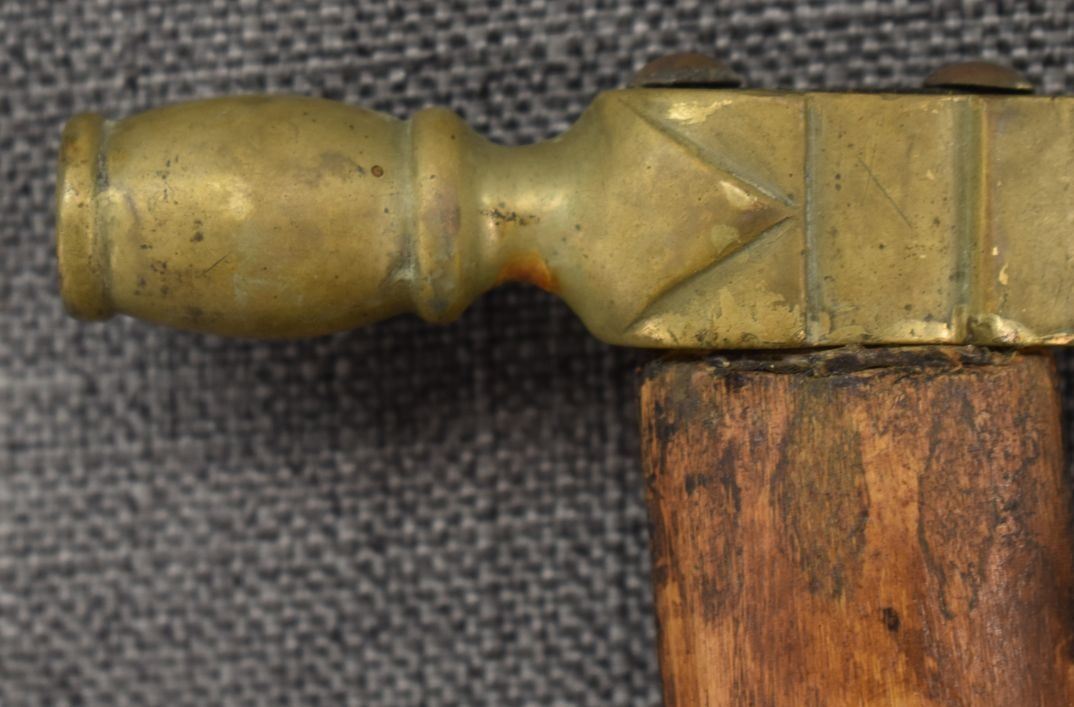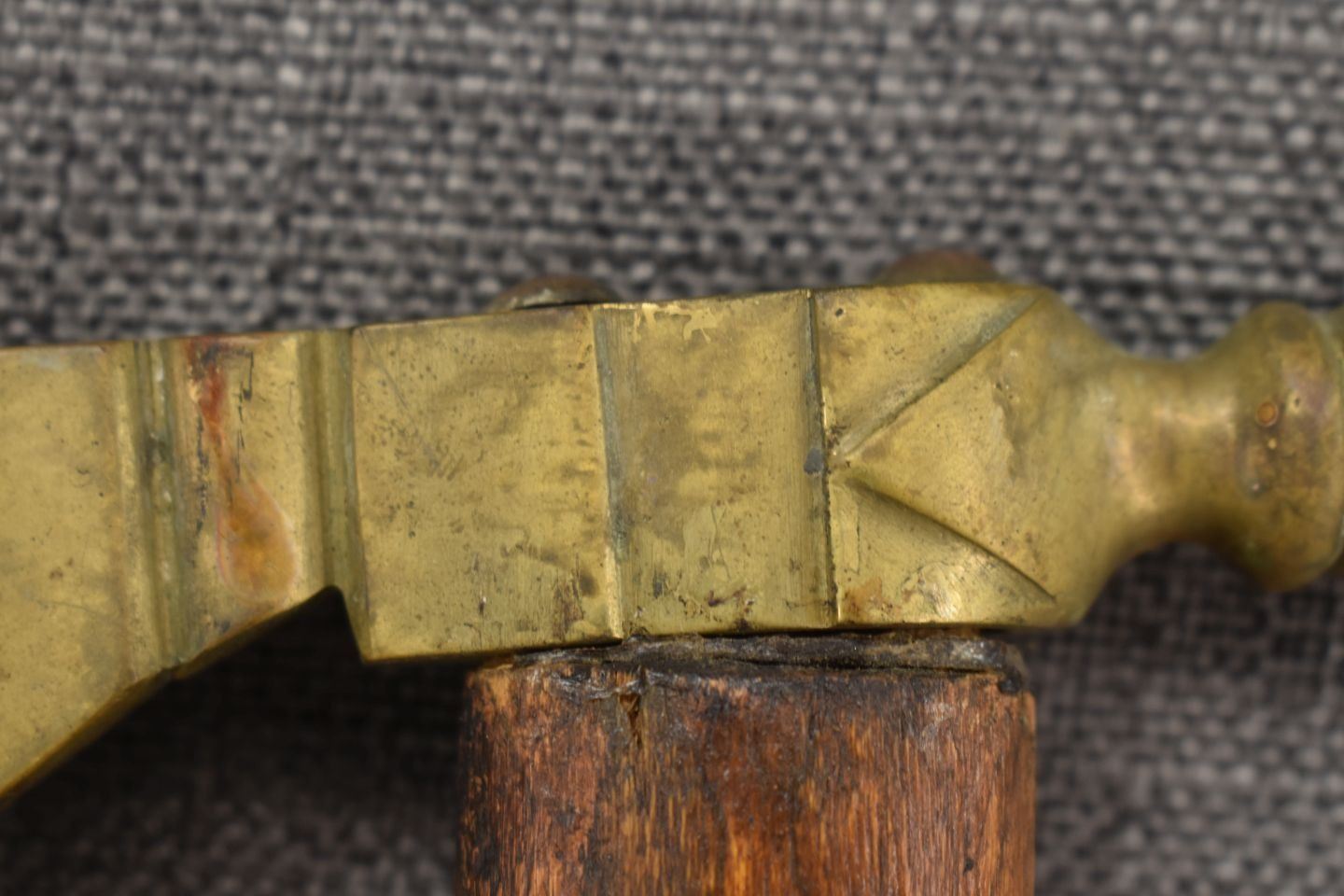 20th century. Commercial brass tomahawk head 7'' x 2.5'' and wooden stem18'' long