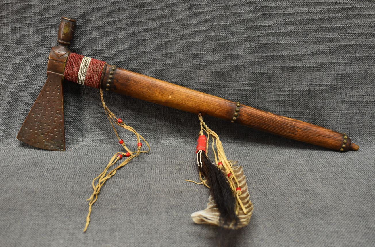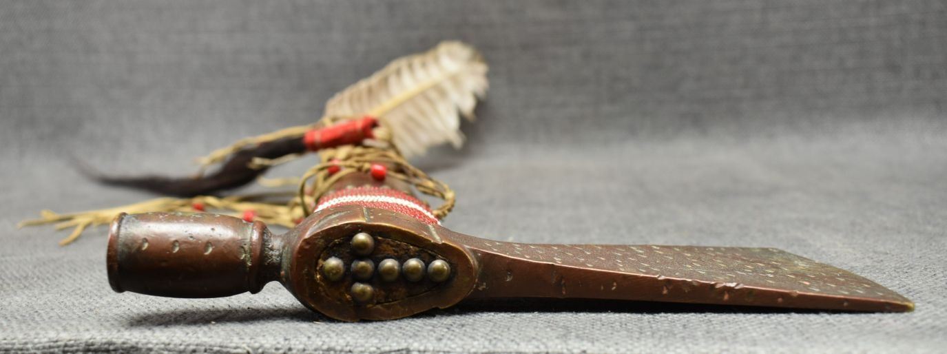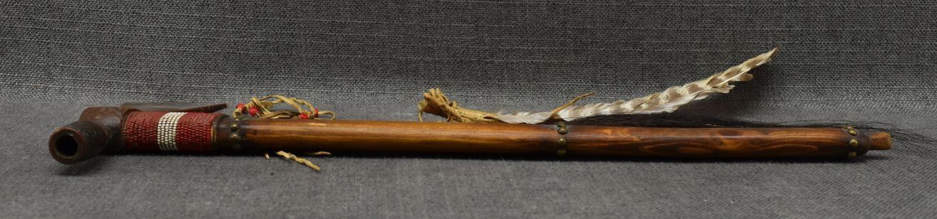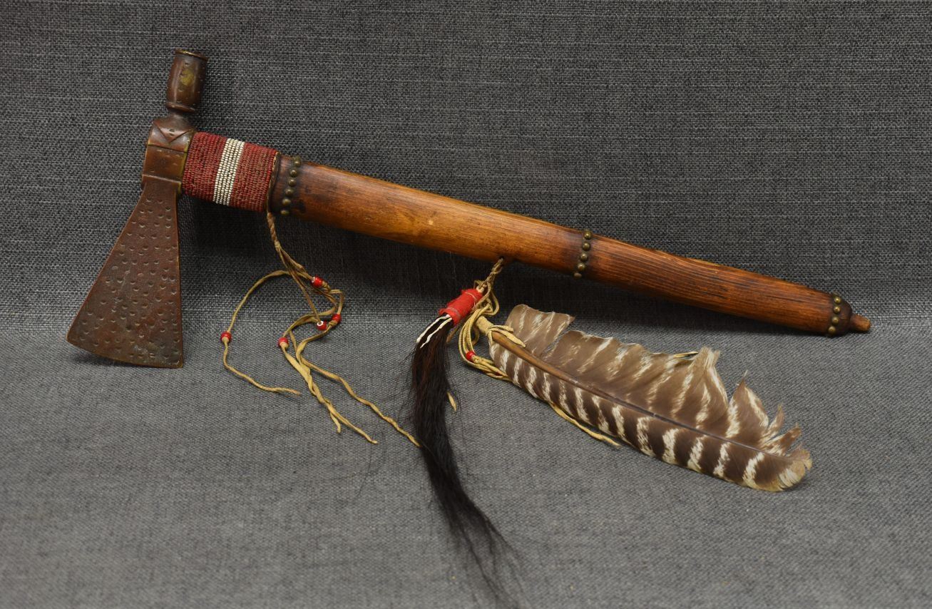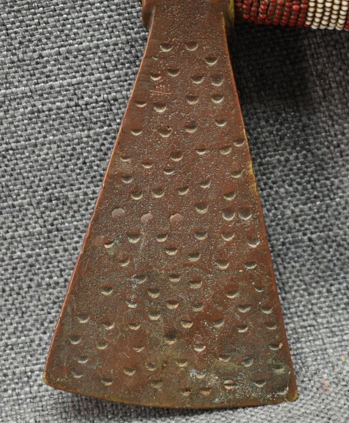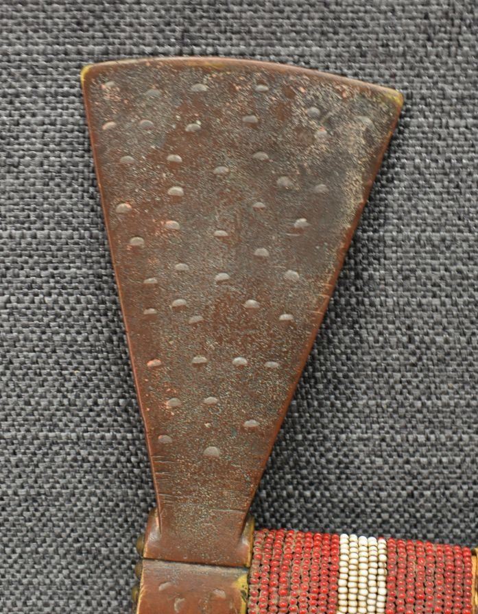 20th century Plains . Brass Pipe tomahawk head. 3'' x 8'' x 1'' and brass tacked and beaded design wooden stem 19'' long .