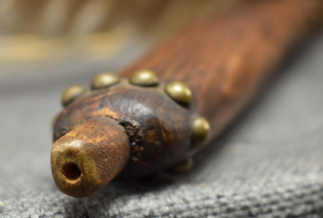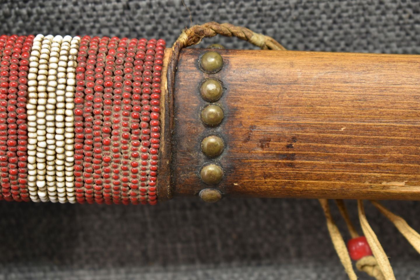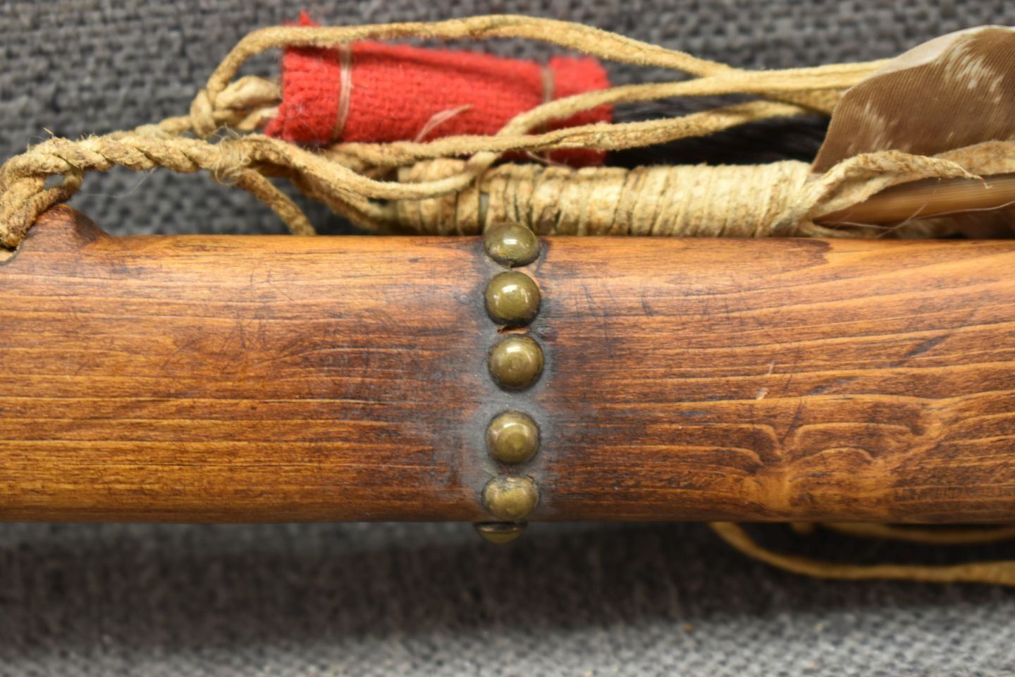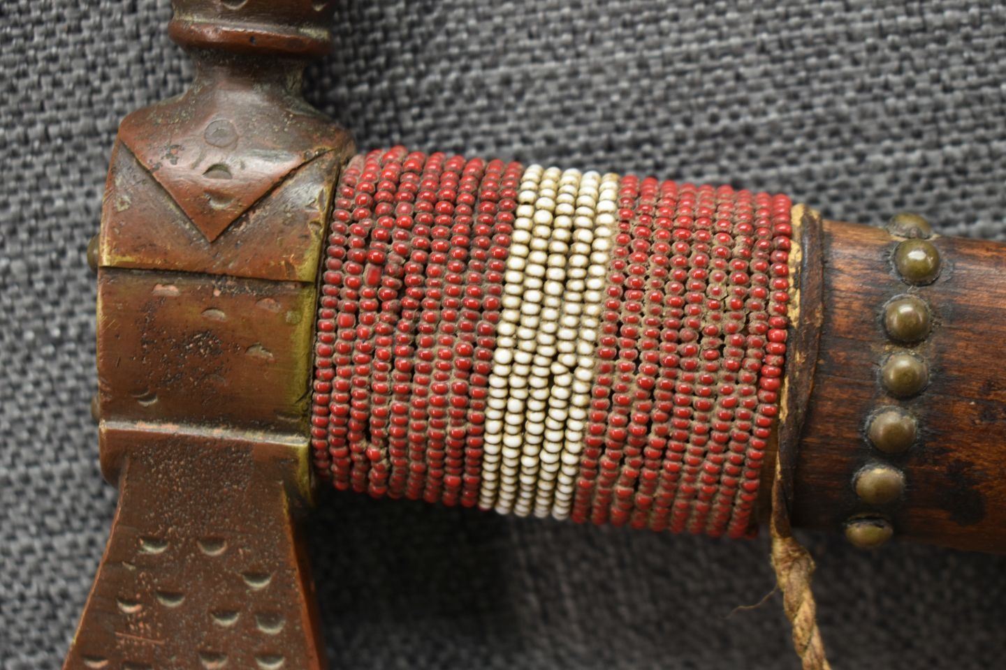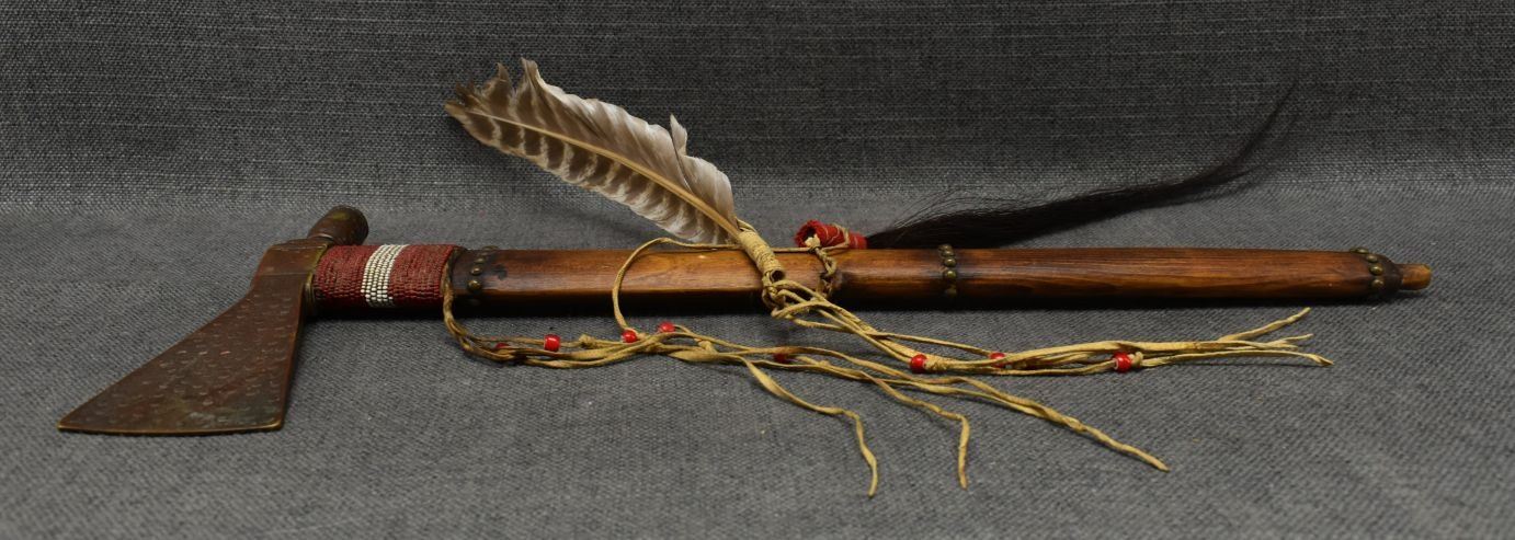 20th century Plains . Brass Pipe tomahawk head. 3'' x 8'' x 1'' and brass tacked and beaded design wooden stem 19'' long .