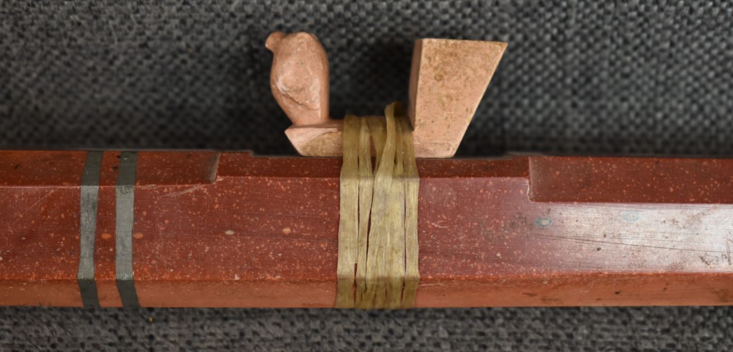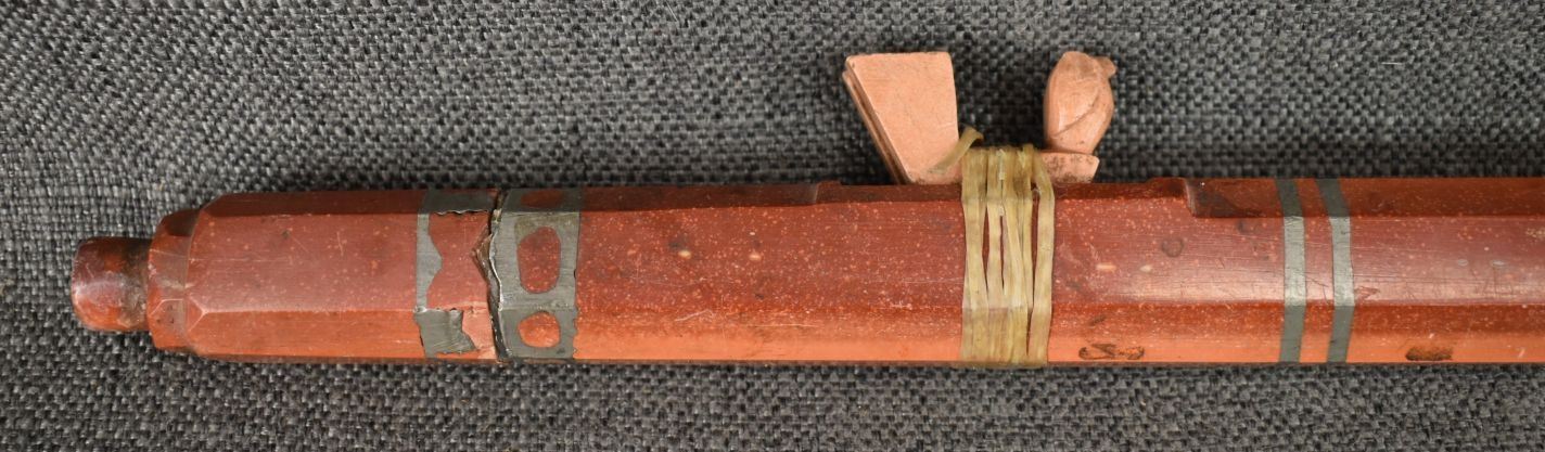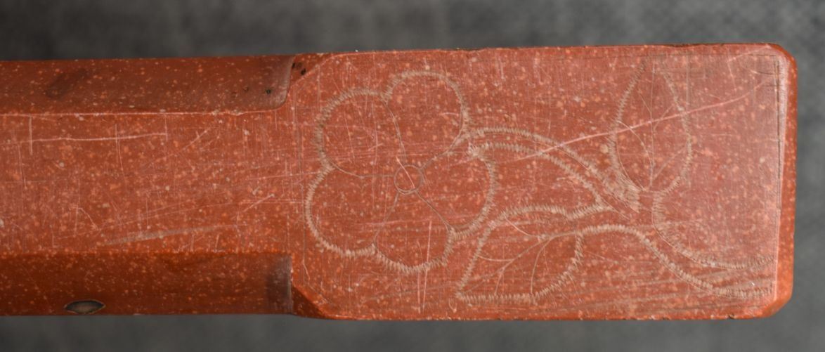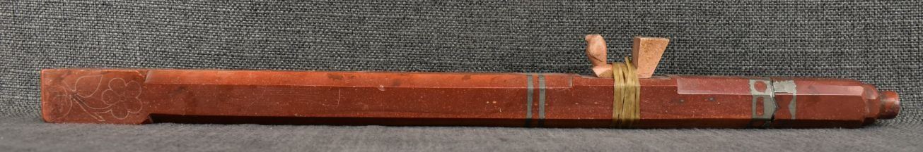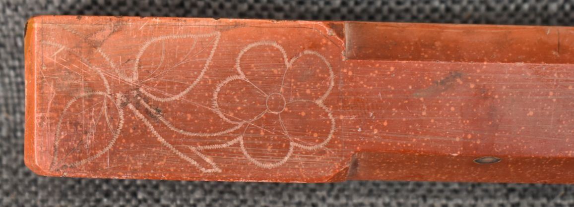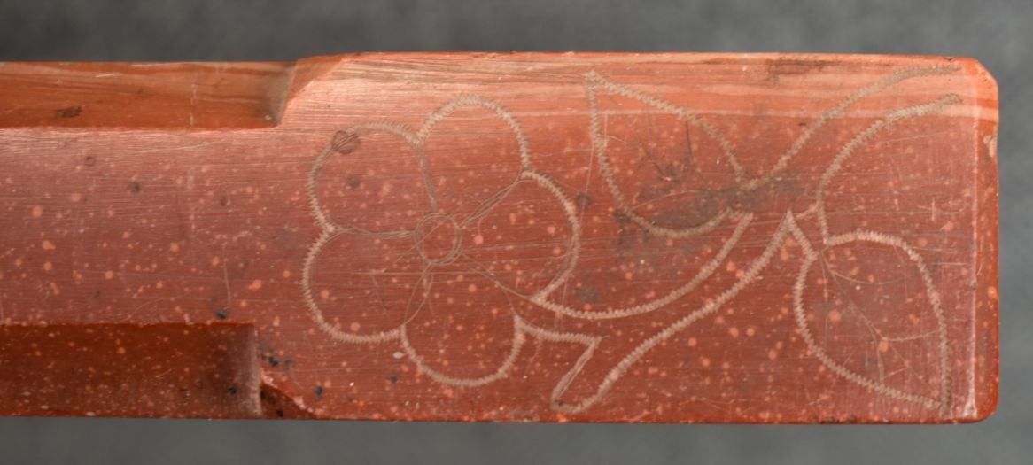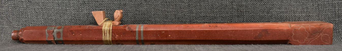 20th century plains Indian, carved with sgraffito floral design and lead inlay 18.5" long, has been broken and glued