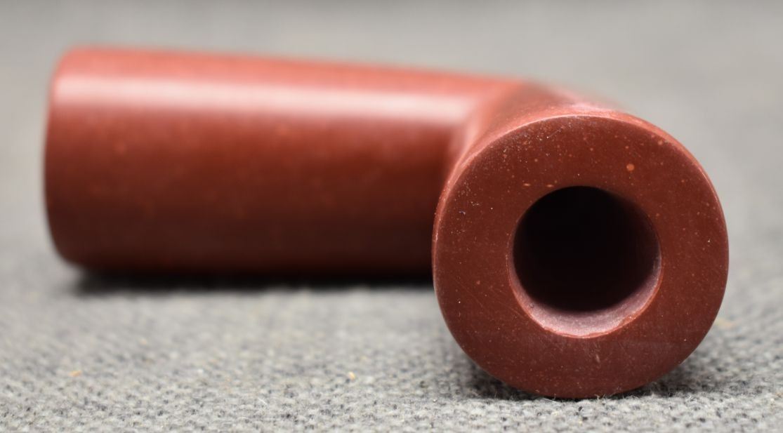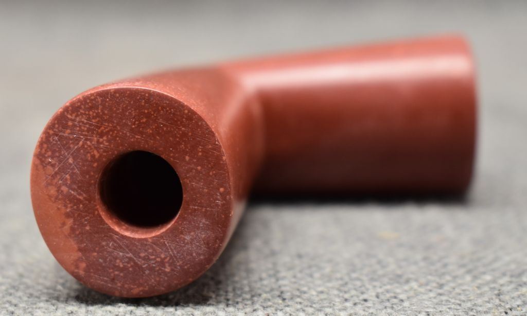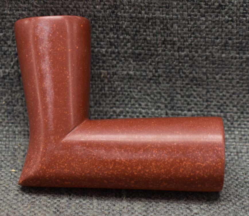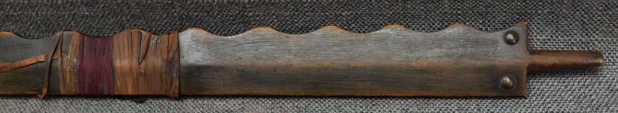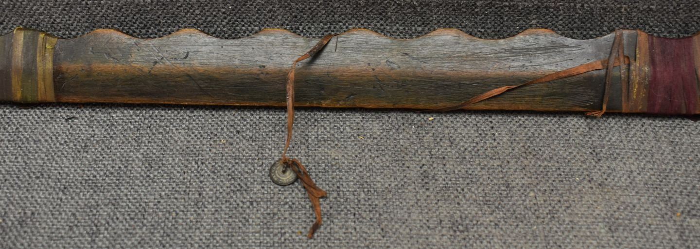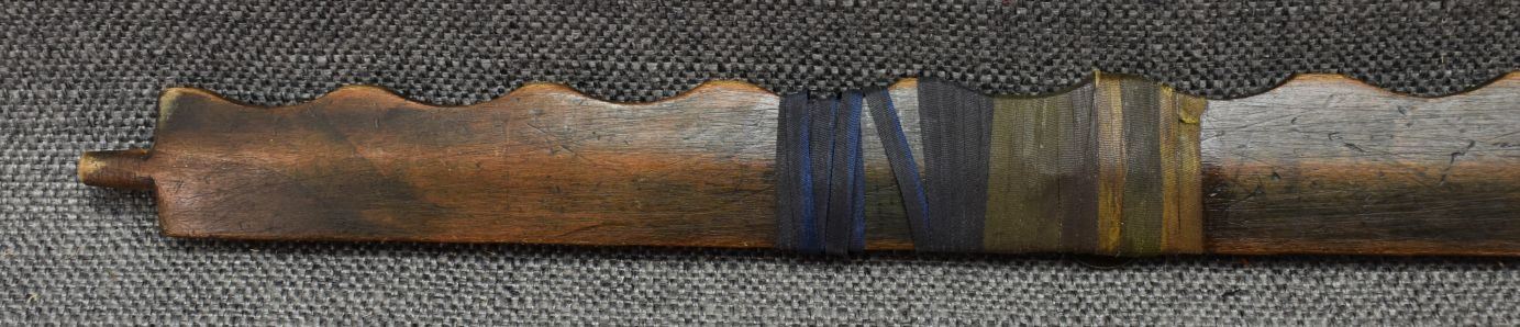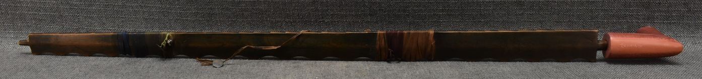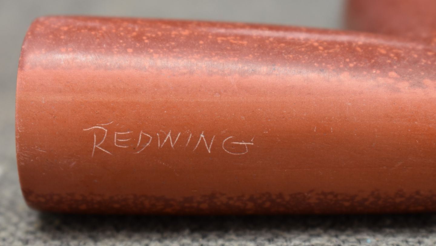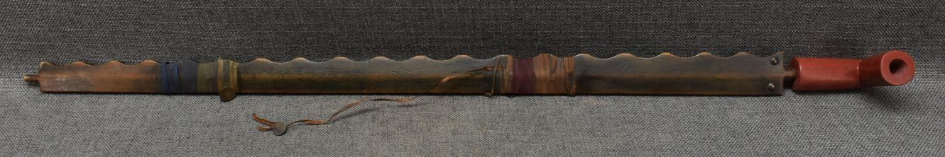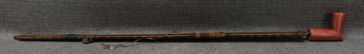 1900's Plains catlinite pipe bowl 2.75'' x 3.25'' x 1.25''. Wooden pipe stem with tacked and ribbon design 29'' long