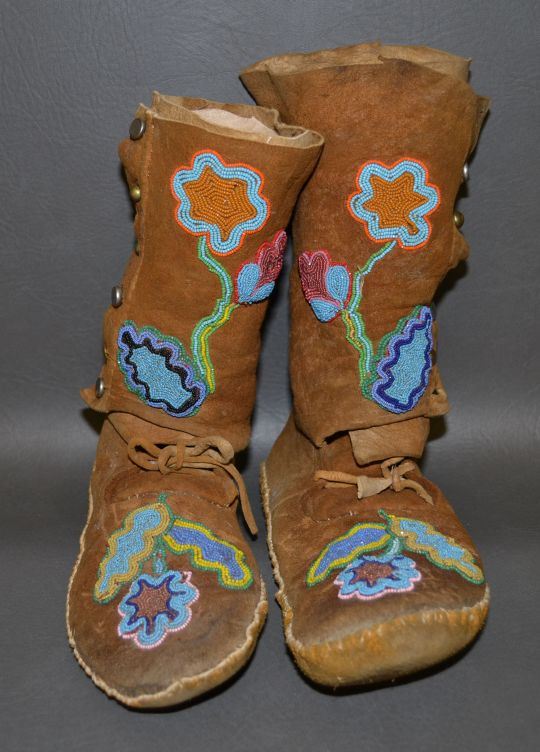 1930-40's hand made and beaded Floral design on native tanned hide with brass buttons and soft soles 9" x 9"