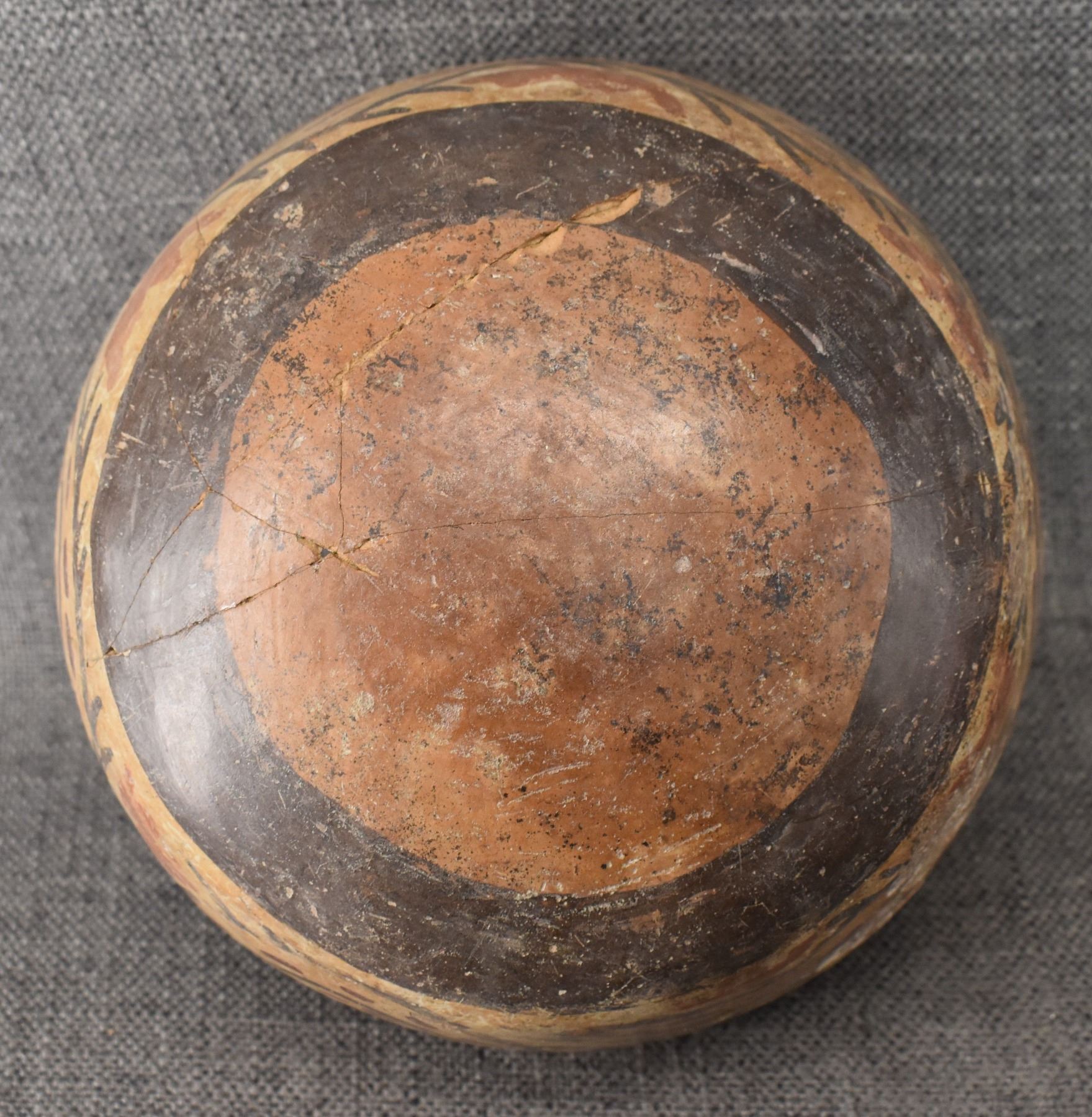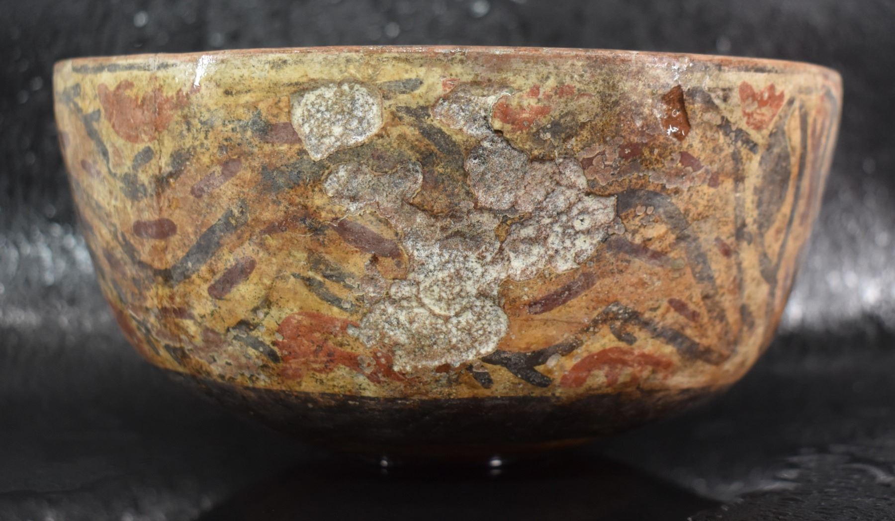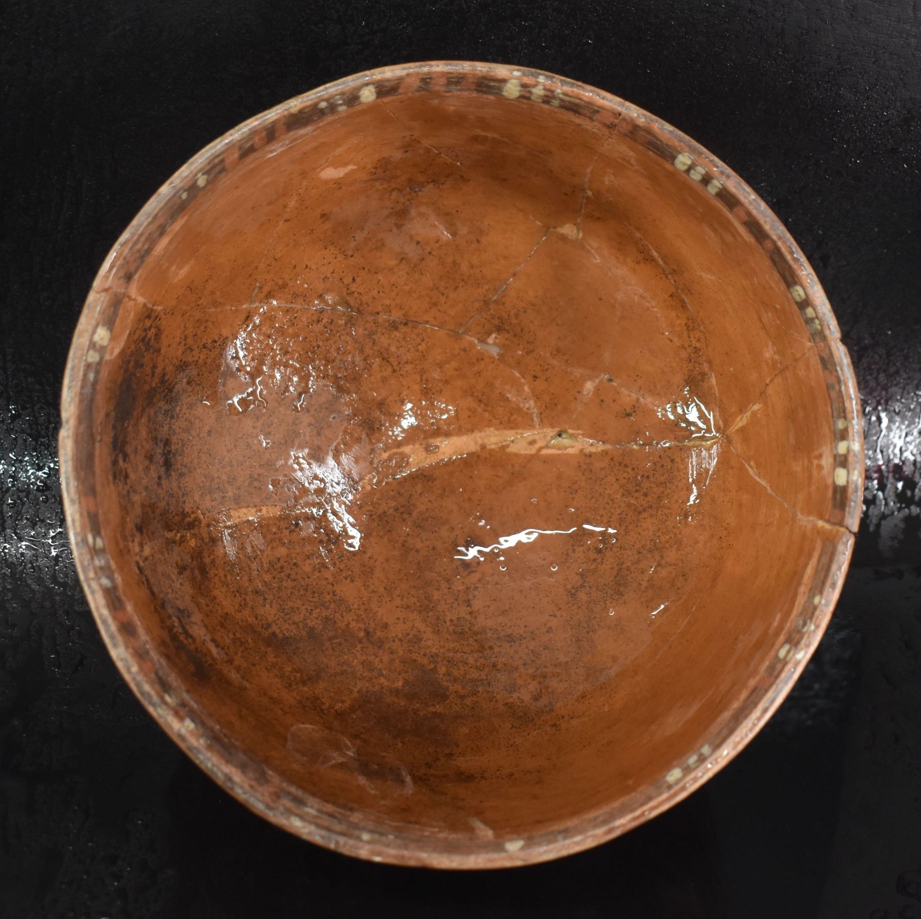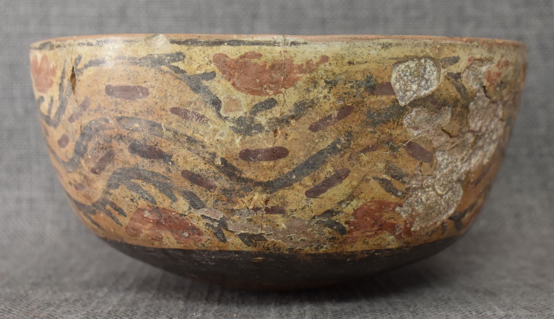 pre Columbian. Hand painted polychrome design pottery bowl. 4'' x 7'' has been broken and glued