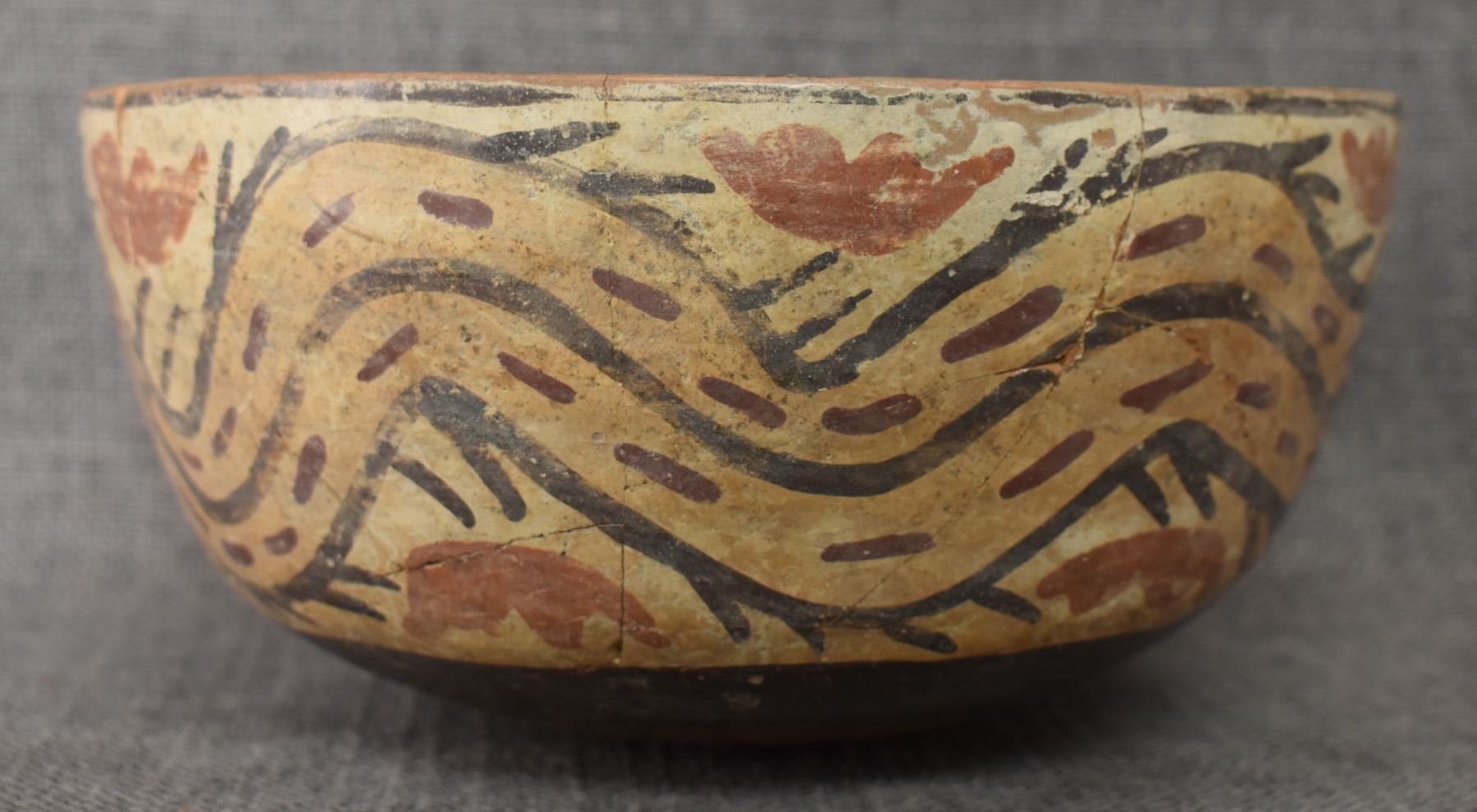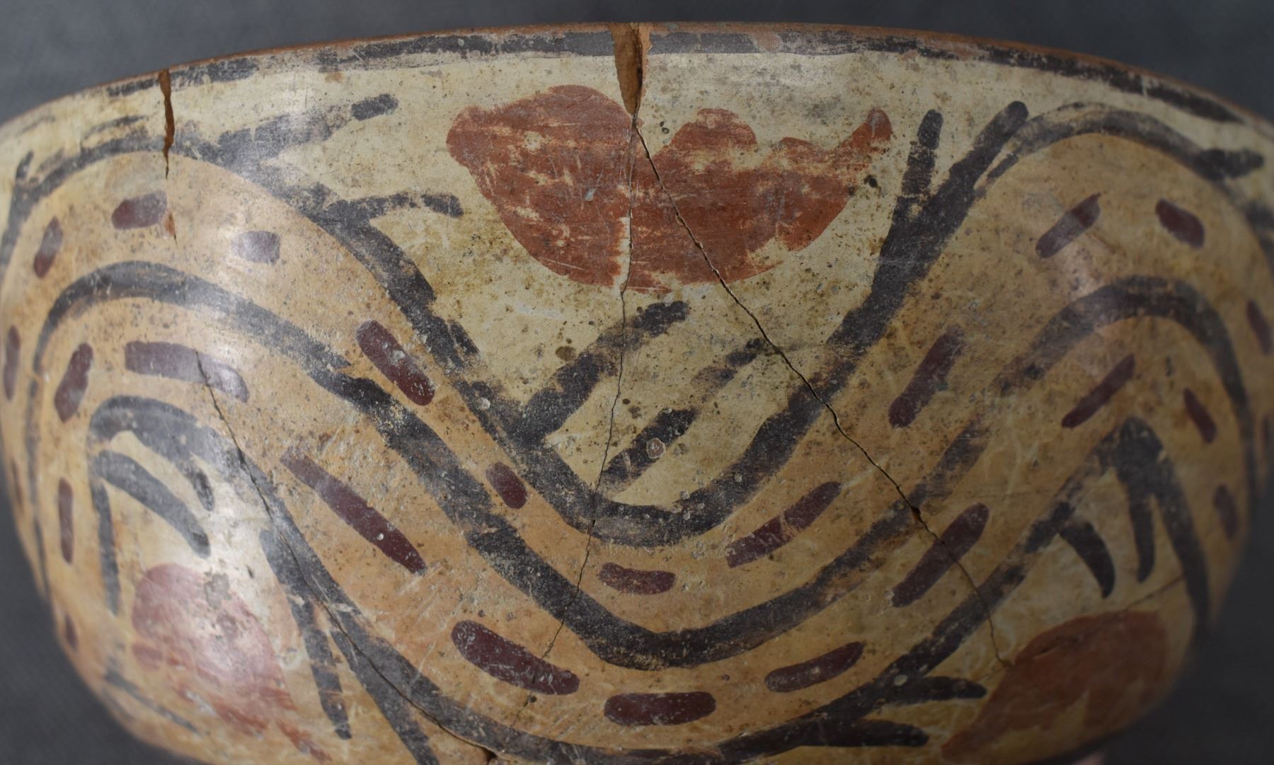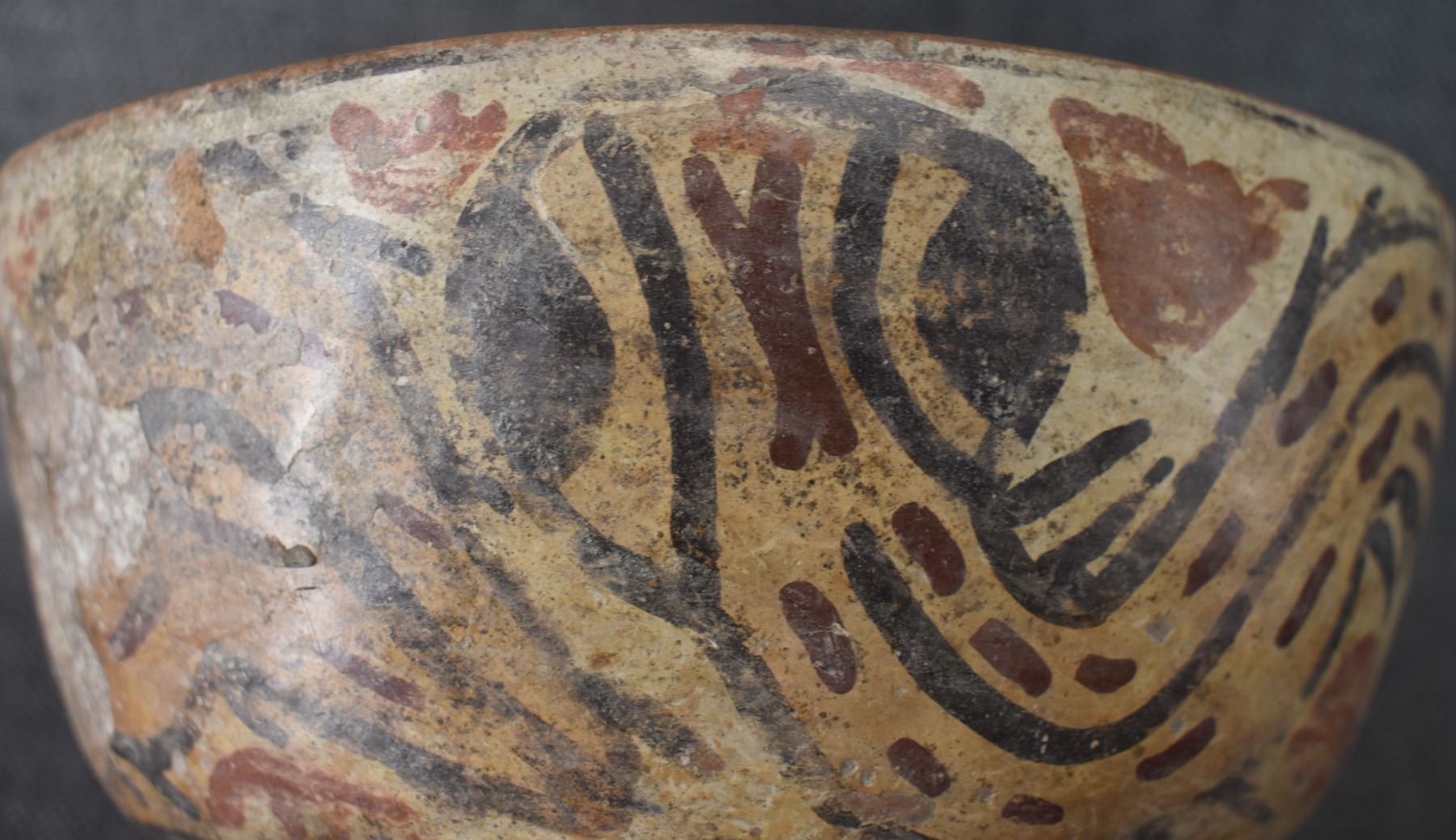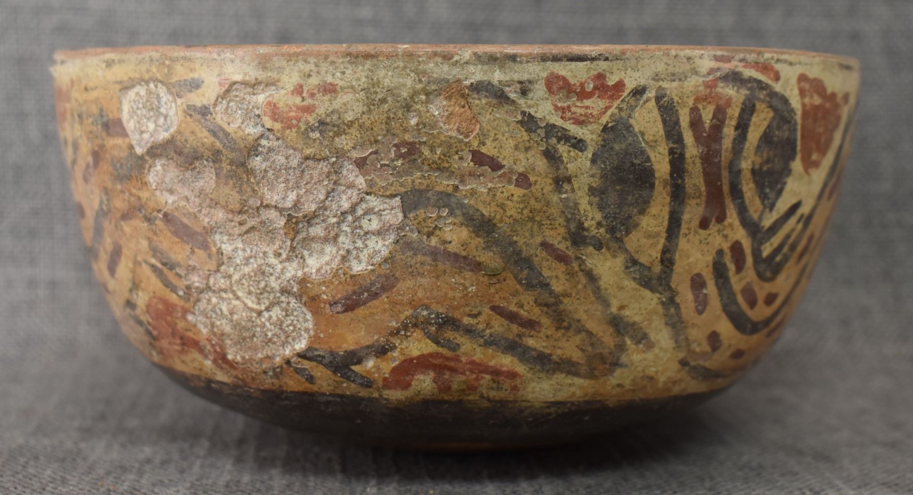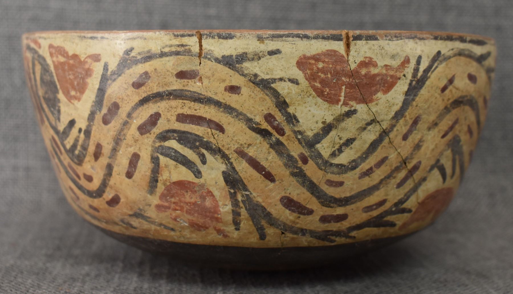 pre Columbian. Hand painted polychrome design pottery bowl. 4'' x 7'' has been broken and glued