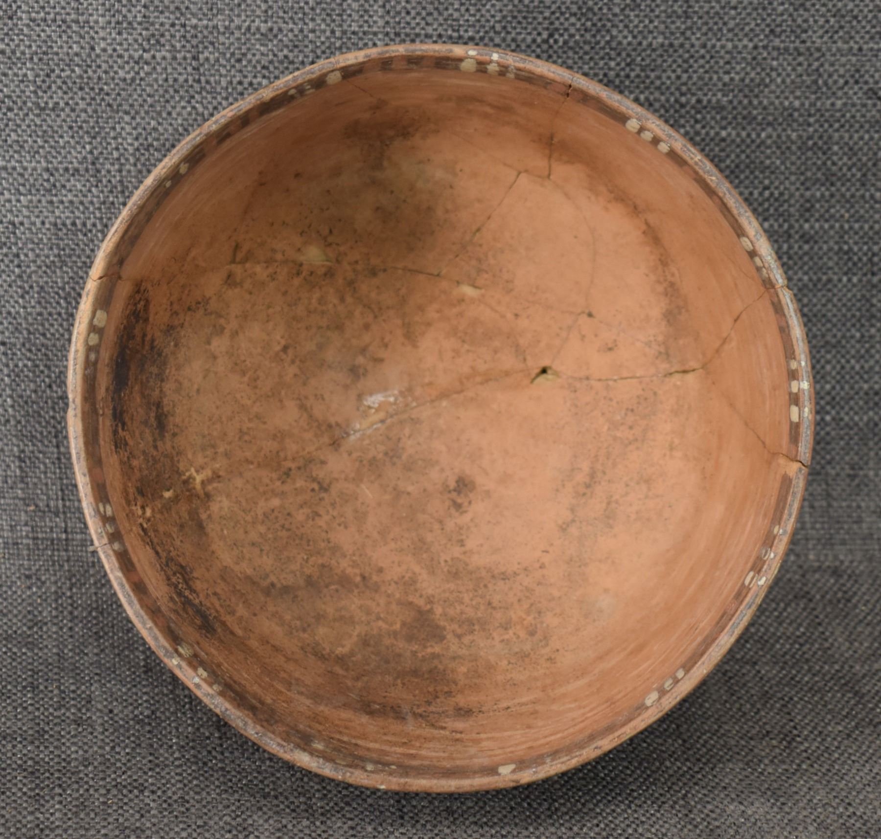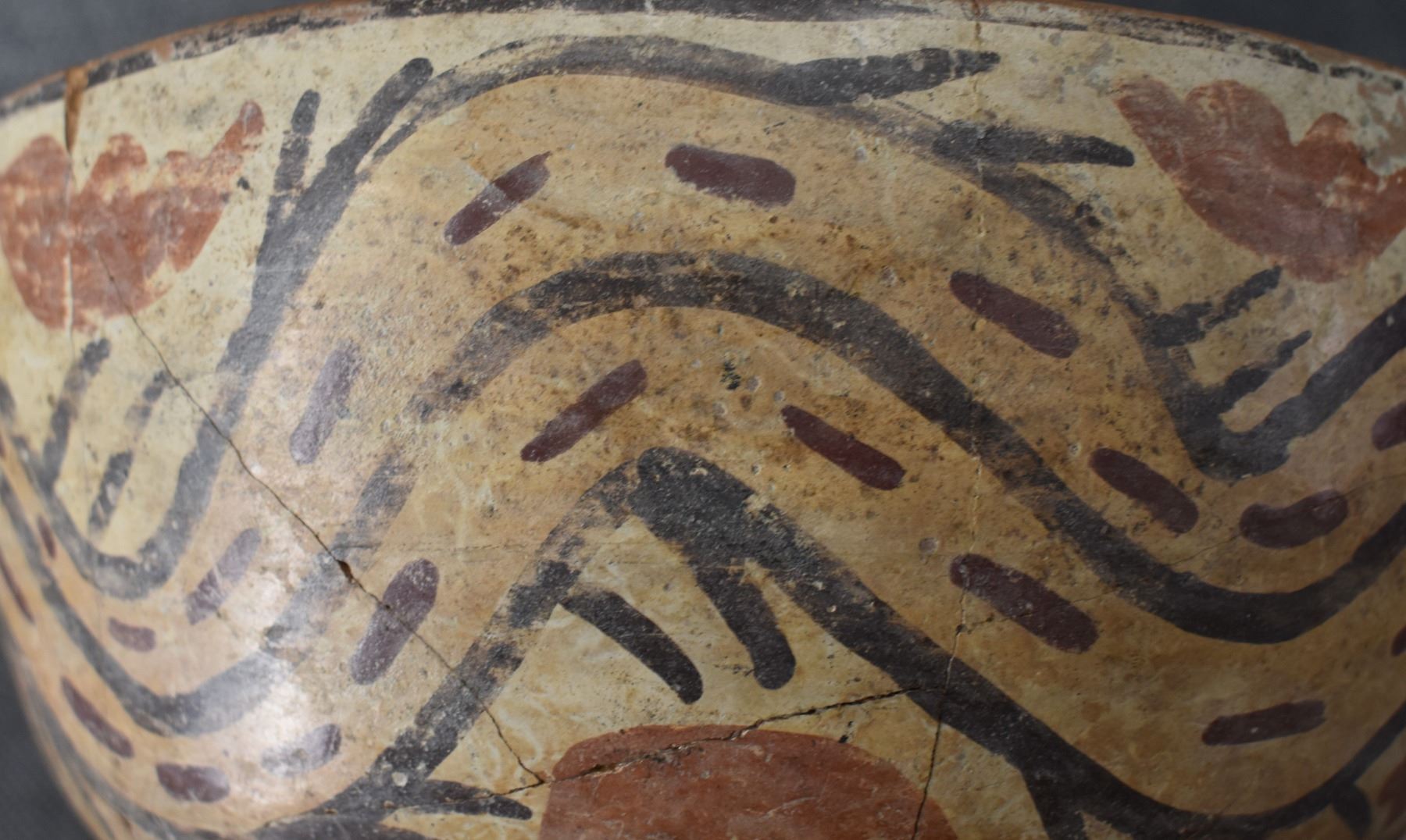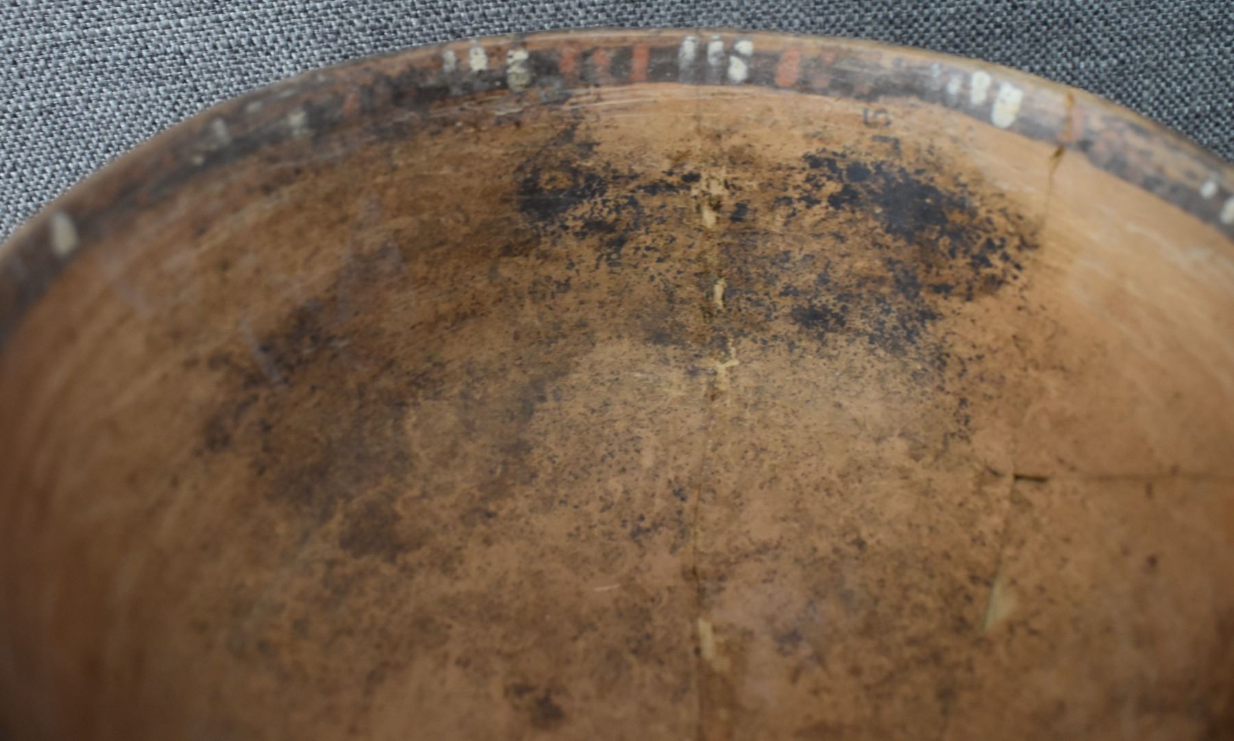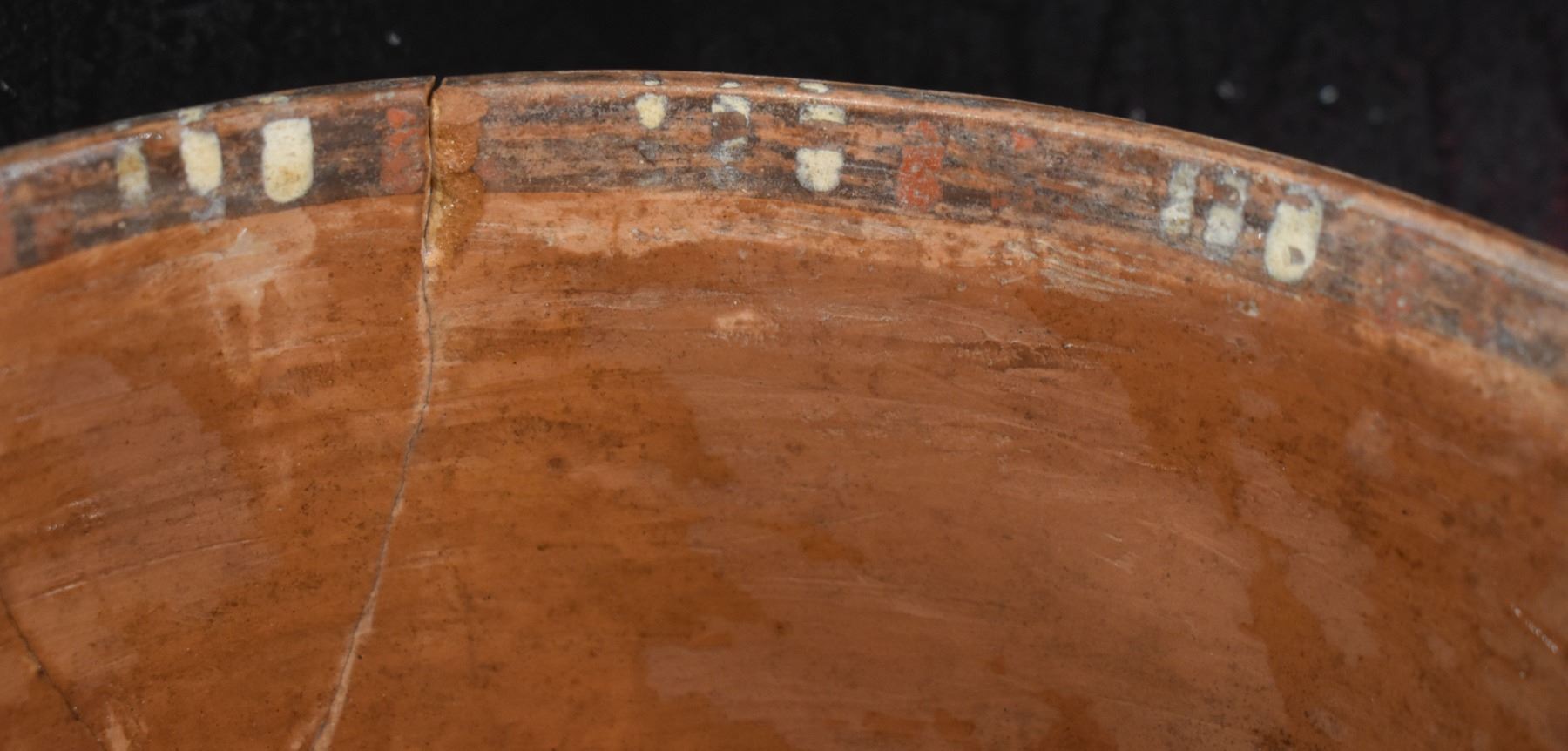 pre Columbian. Hand painted polychrome design pottery bowl. 4'' x 7'' has been broken and glued