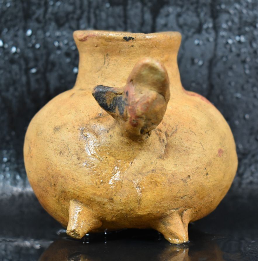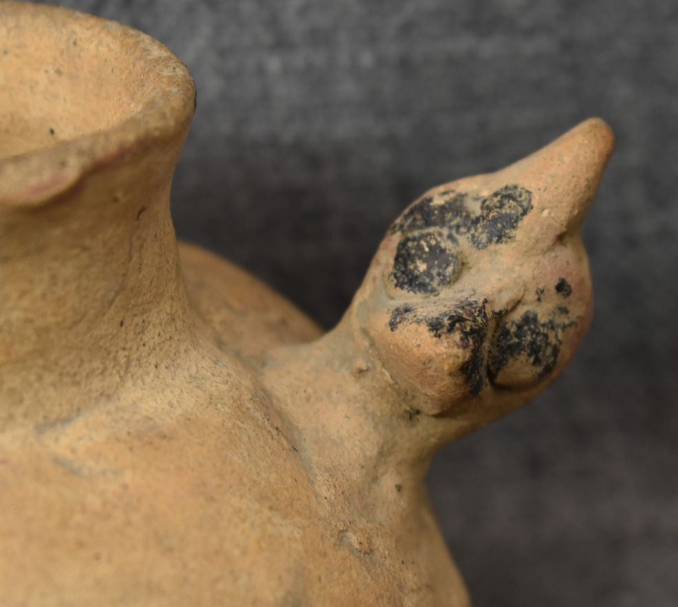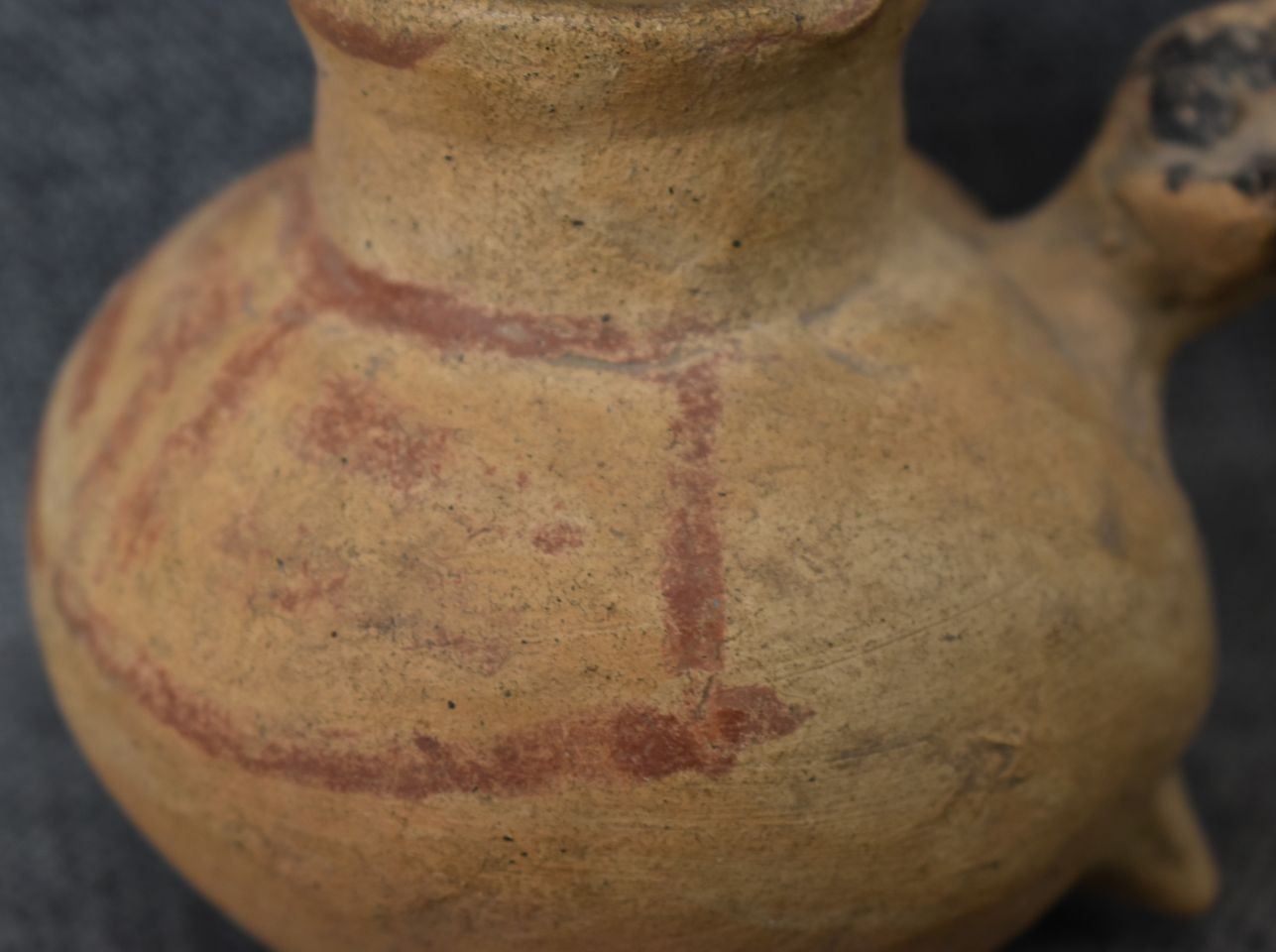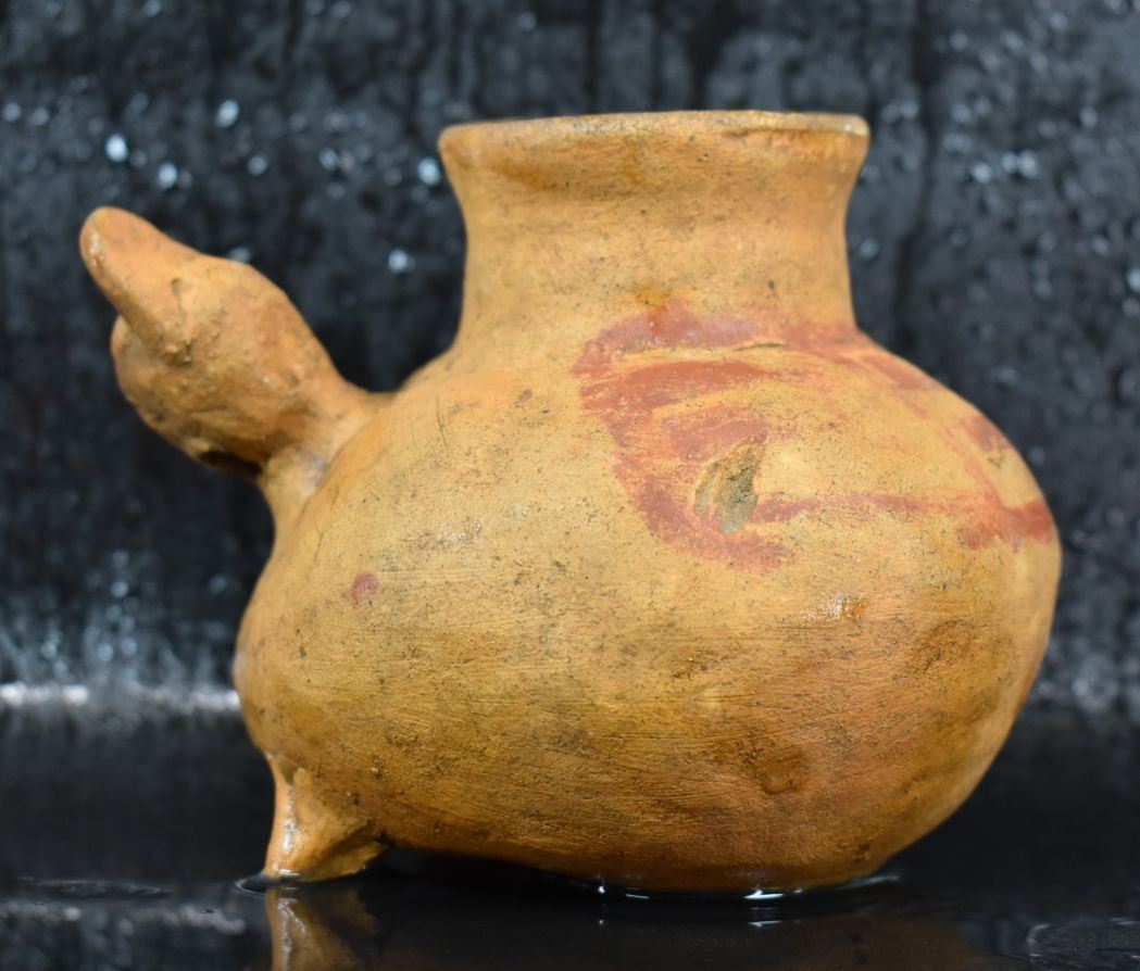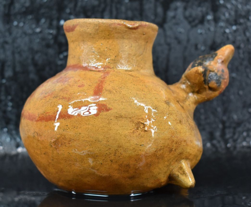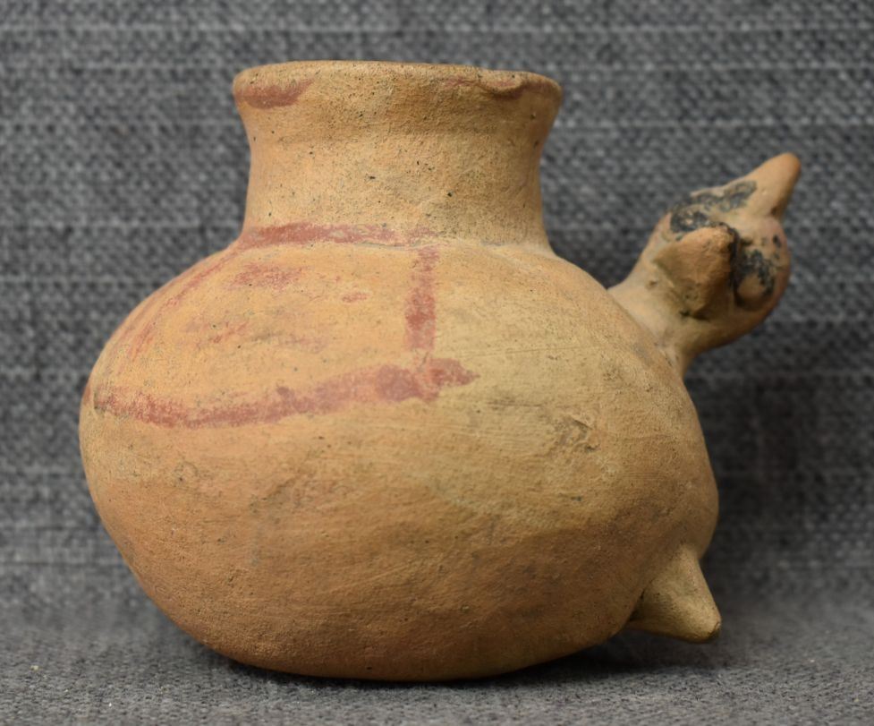 prehistoric pre-Columbian, hand made with bird head effigy and painted design 3.5" x 4.5" x 4" as found condition