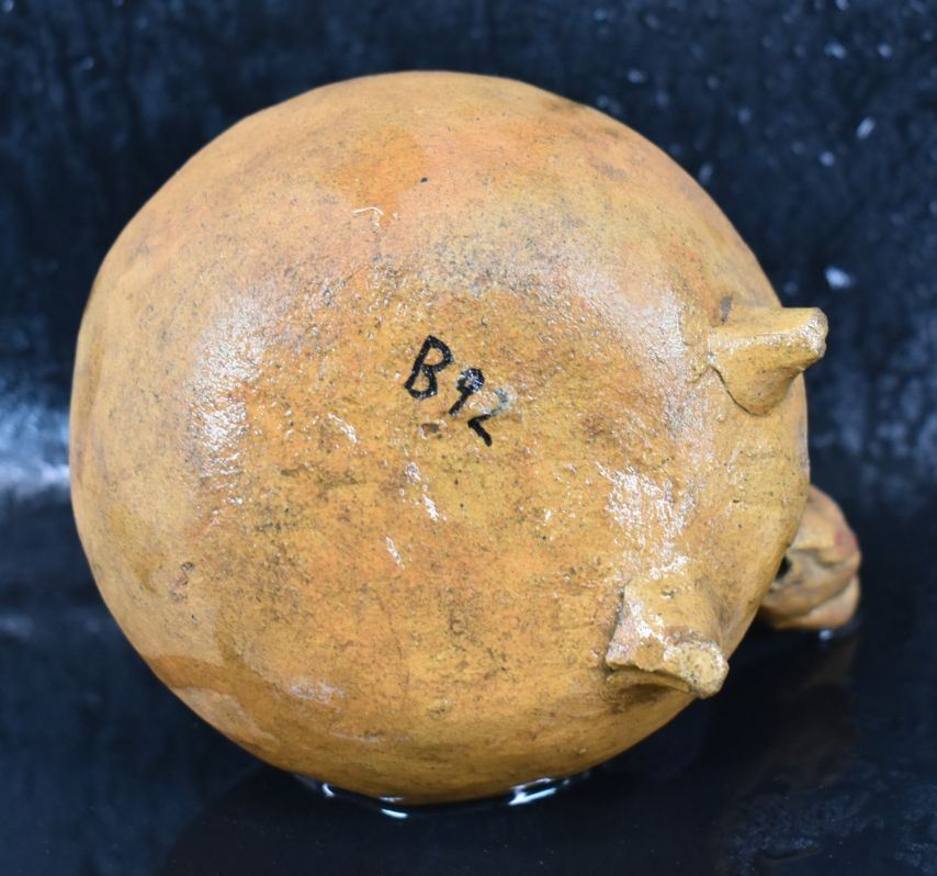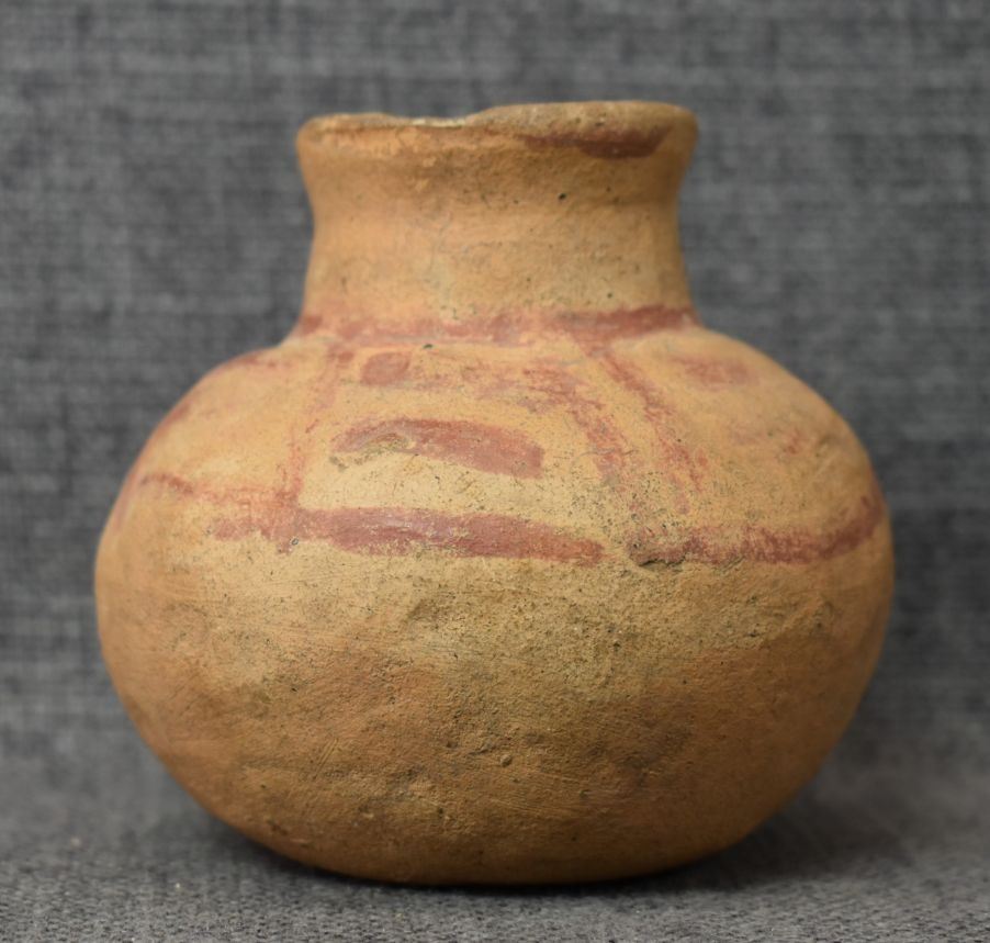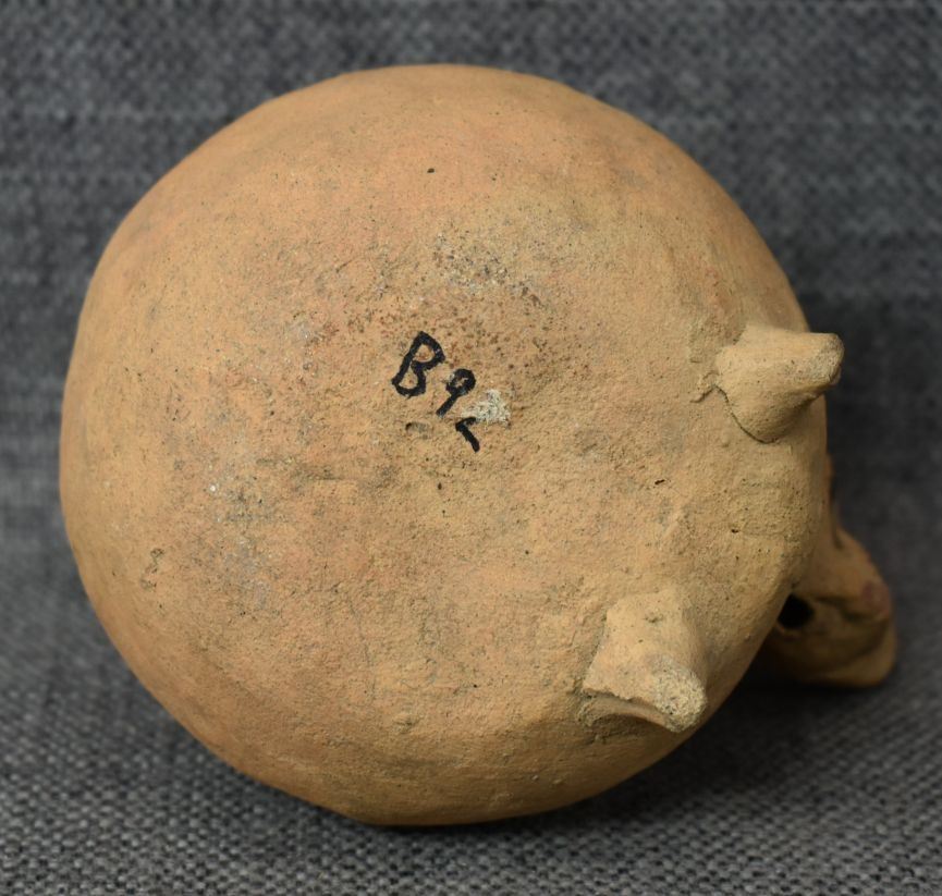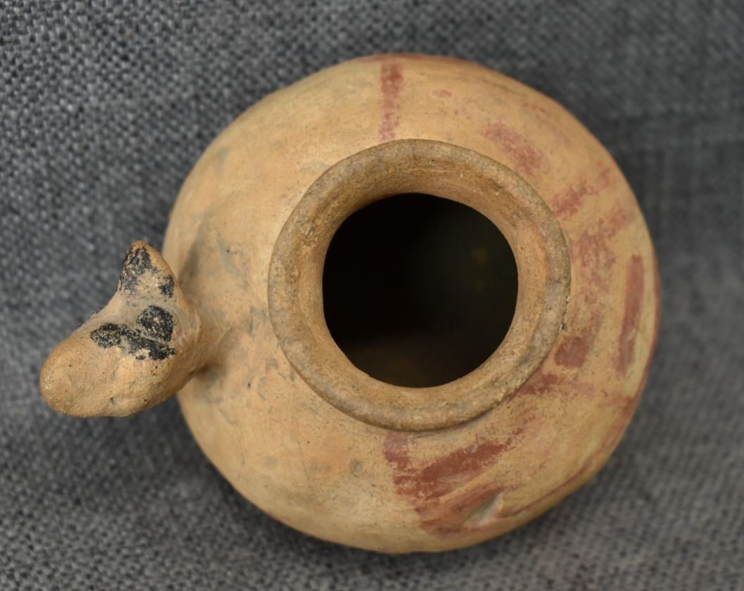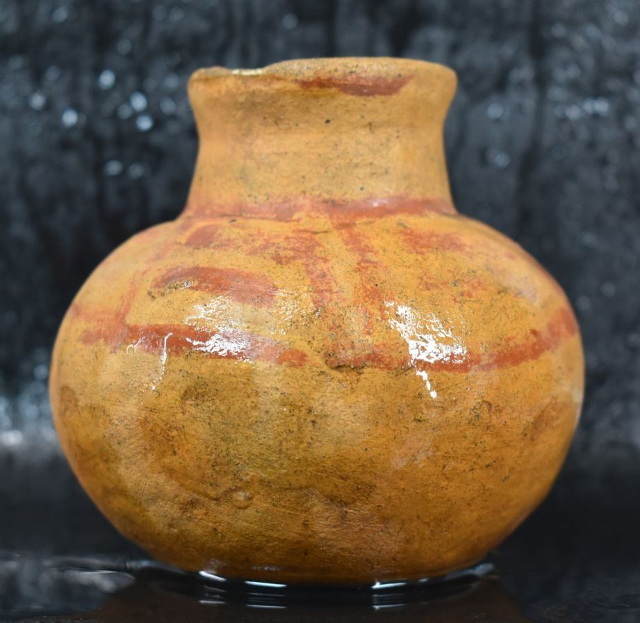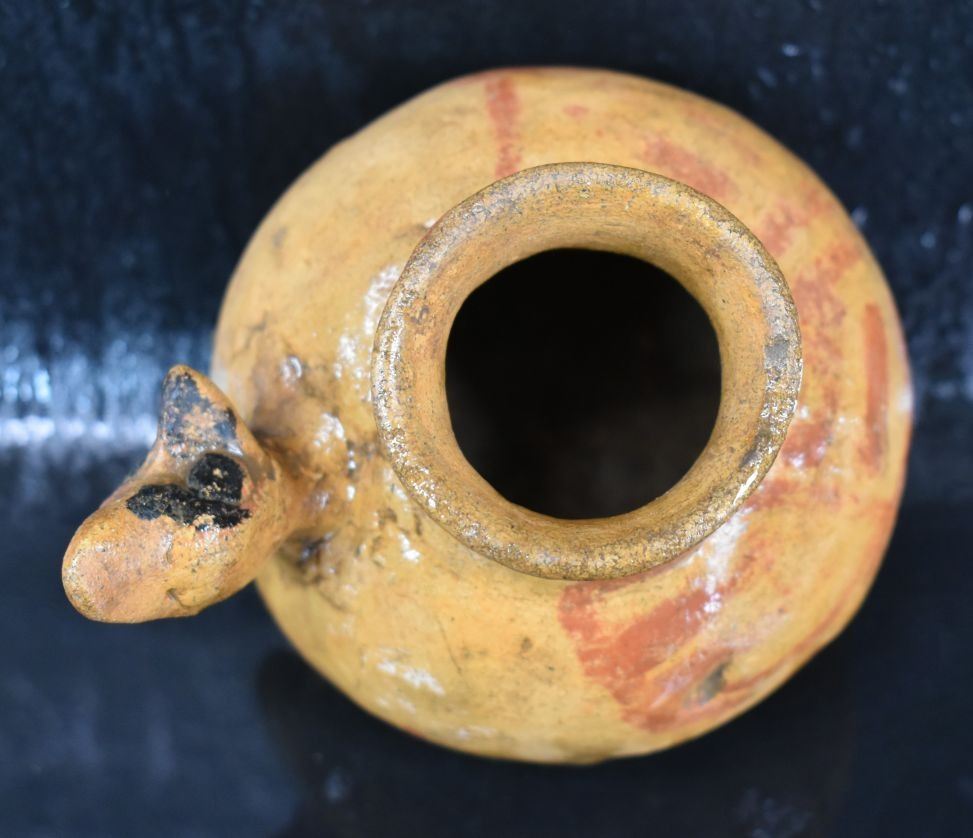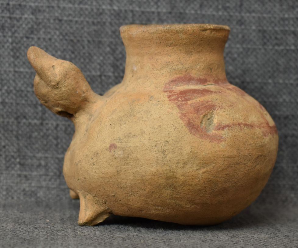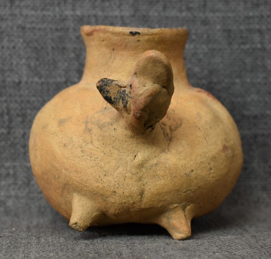 prehistoric pre-Columbian, hand made with bird head effigy and painted design 3.5" x 4.5" x 4" as found condition