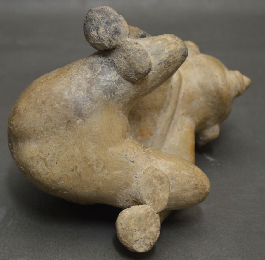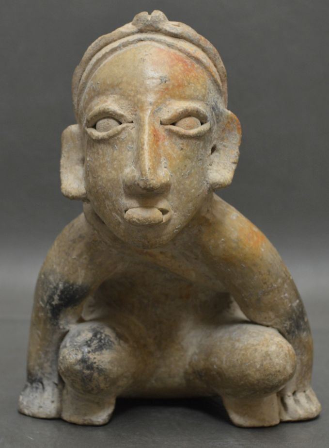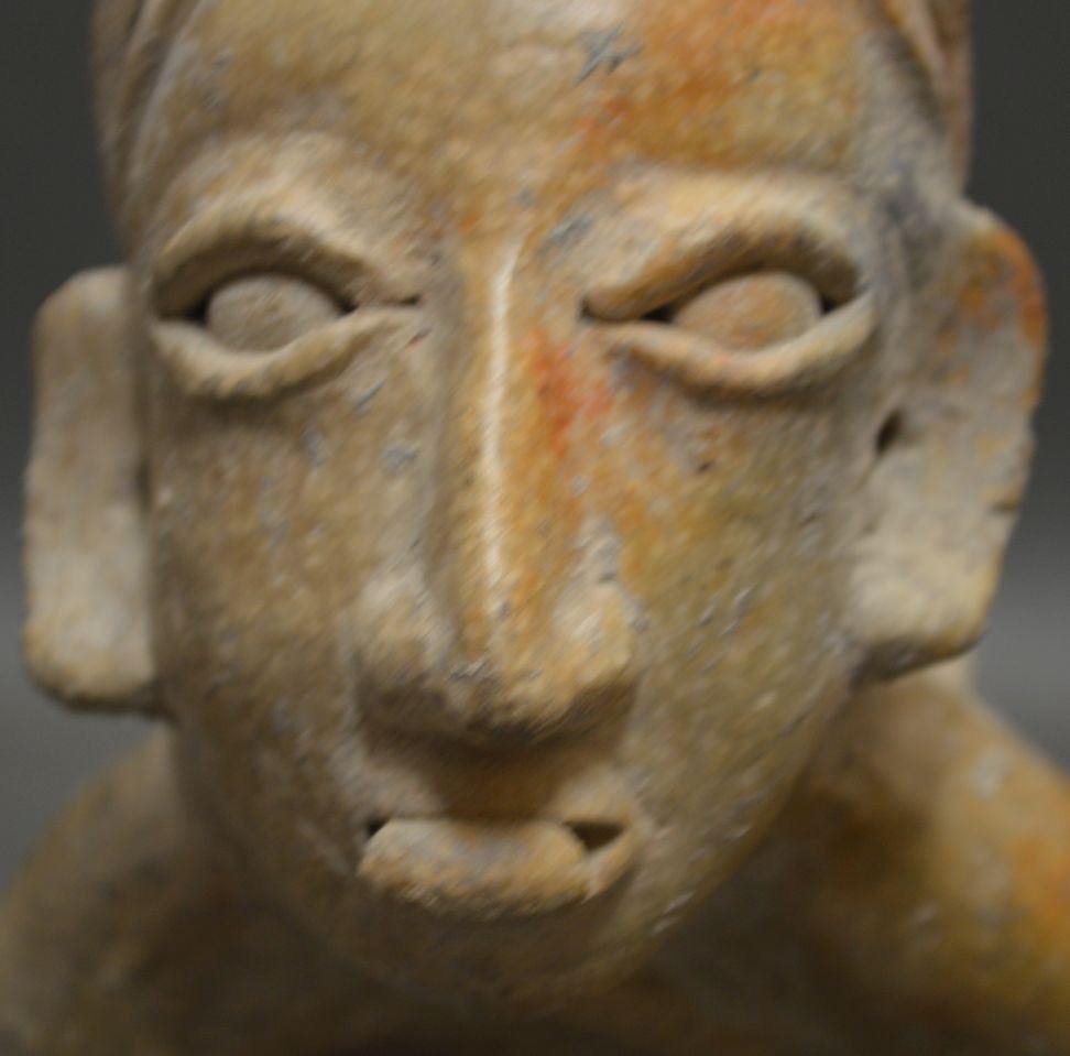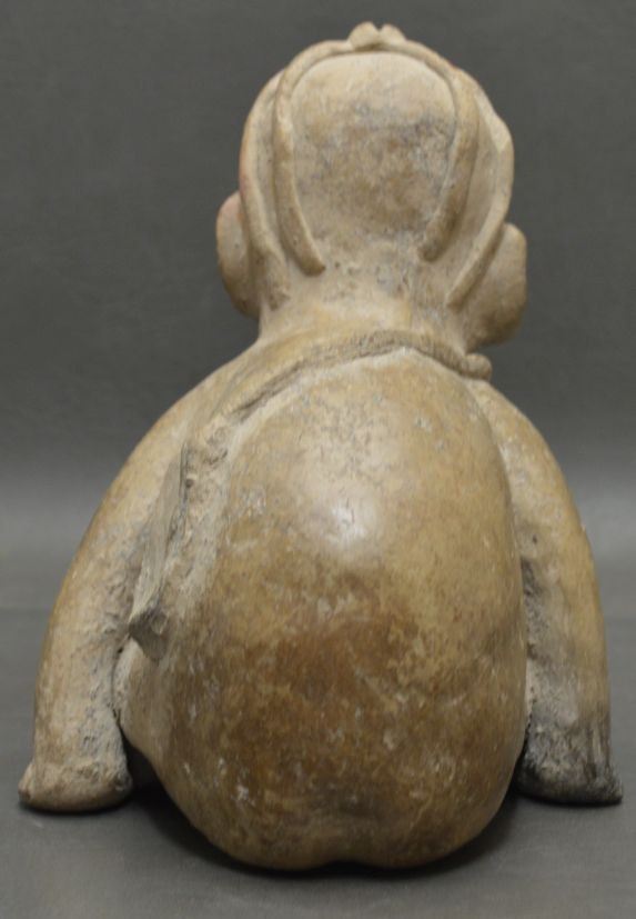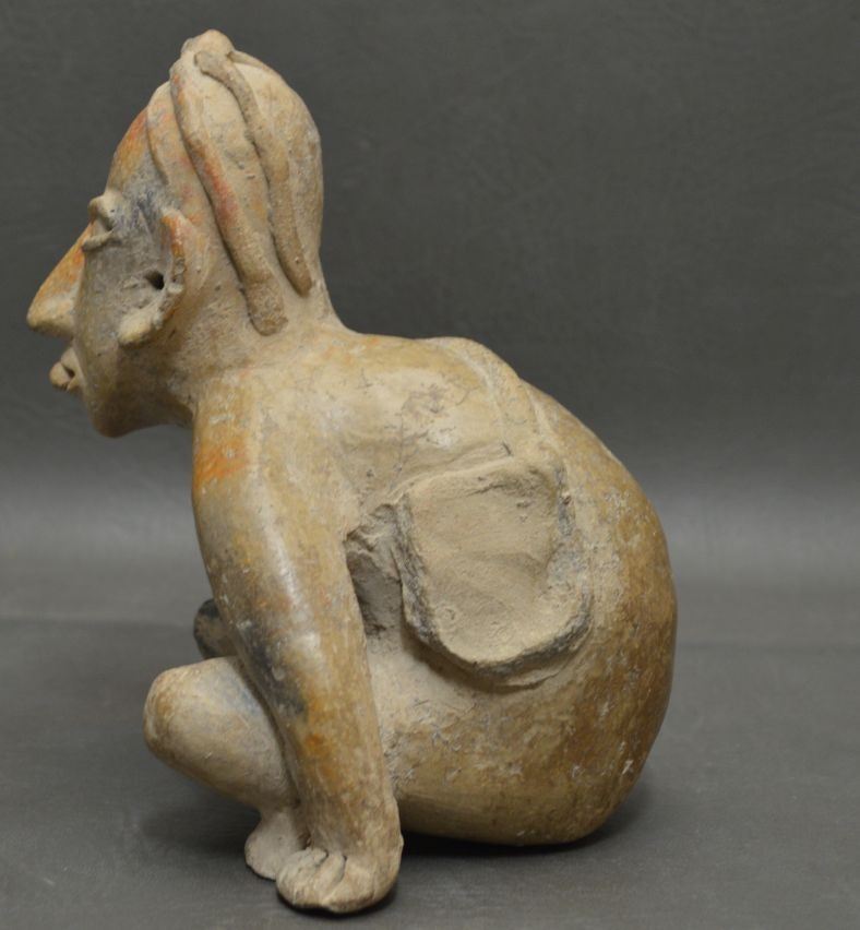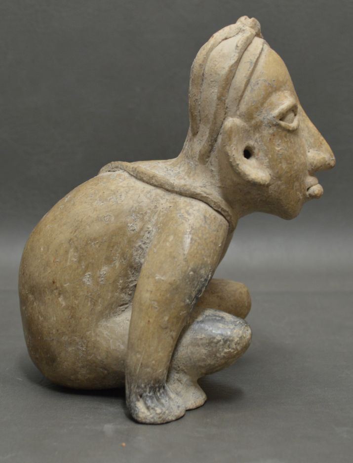 prehistoric hand coiled pottery seated male figure. 7'' x 5'' x 6'' tall in as found condition. *this item was consigned as Authentic And are Guaranteed to be as described *