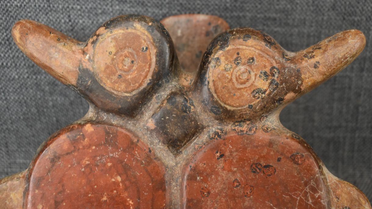 prehistoric pre-Columbian, hand made with carved and painted owl design 6.25" x 8" x 3.5" as found condition