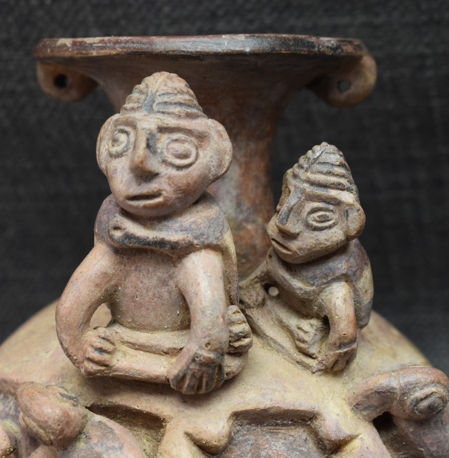 prehistoric Pre-Columbian, hand made and painted with raised and carved animal and human designs 7.5" x 7" x 5.5" has minor broken and glued figures