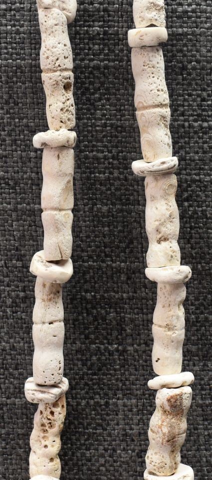prehistoric, singled strand of shell and possibly coral beads 32" long with stone pendant 1.5" x 1"