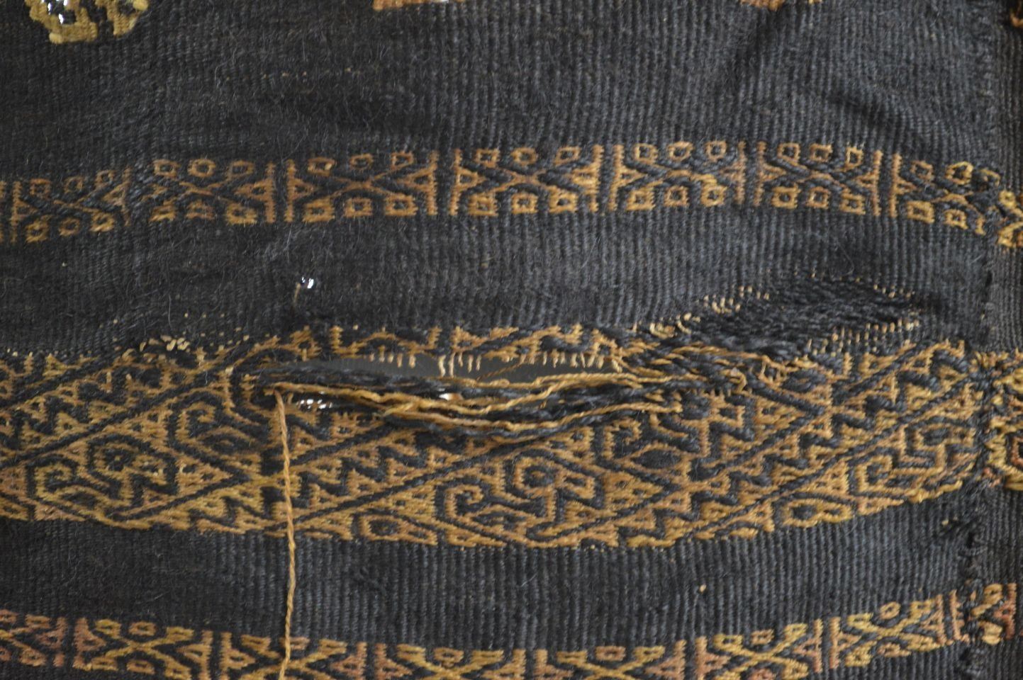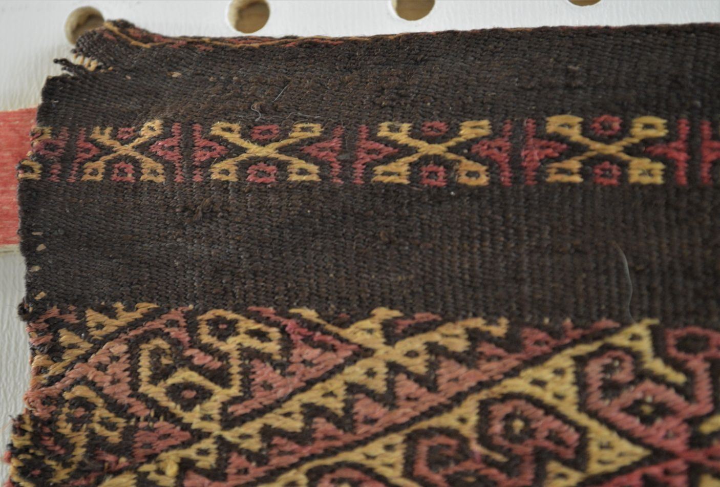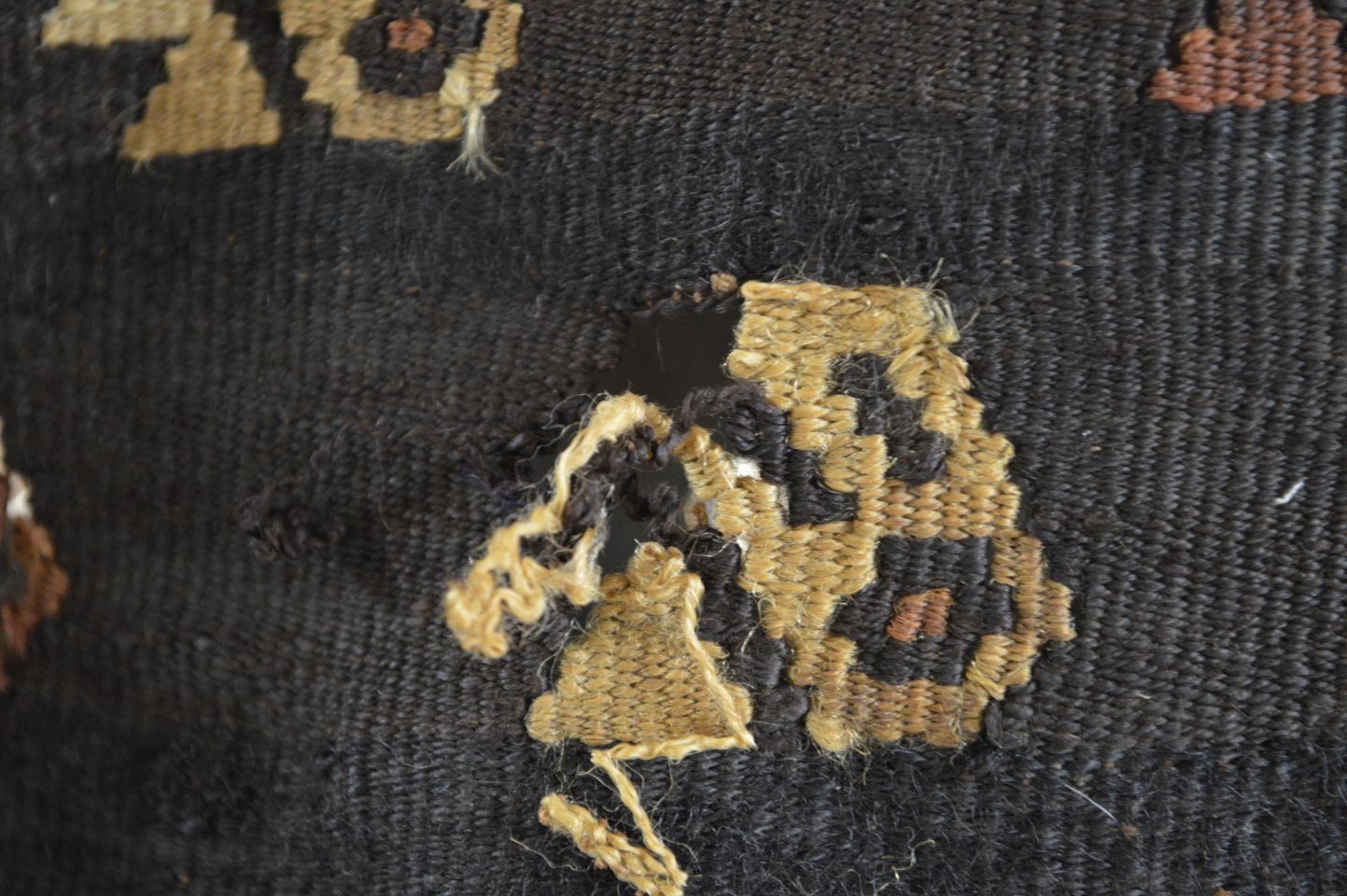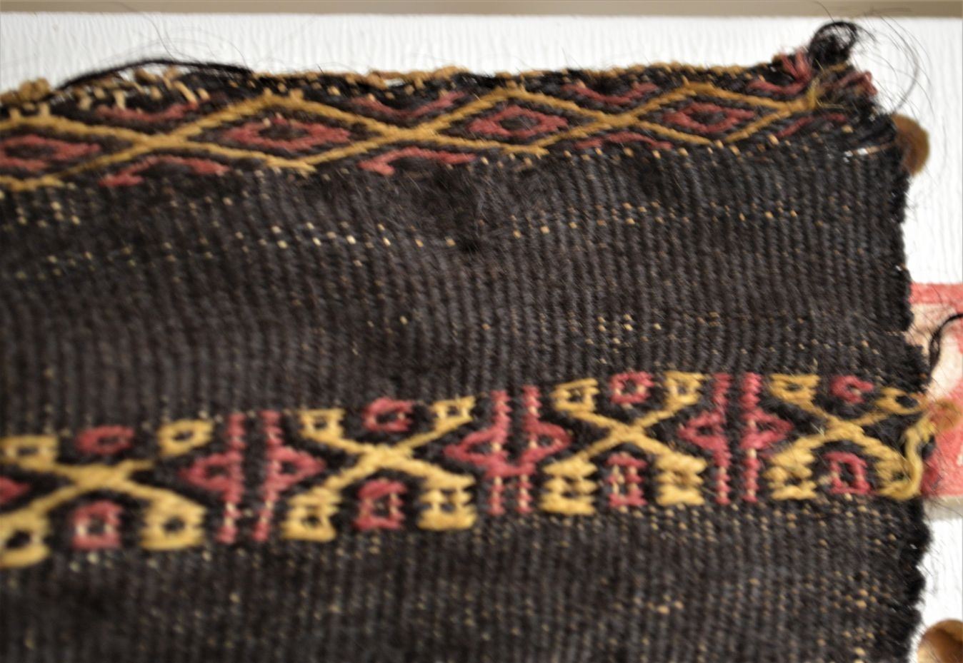 prehistoric. Hand woven banded design Peruvian textile, has minor damage. 30'' x 28''