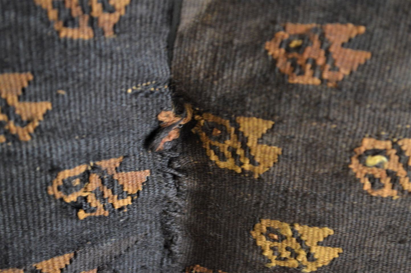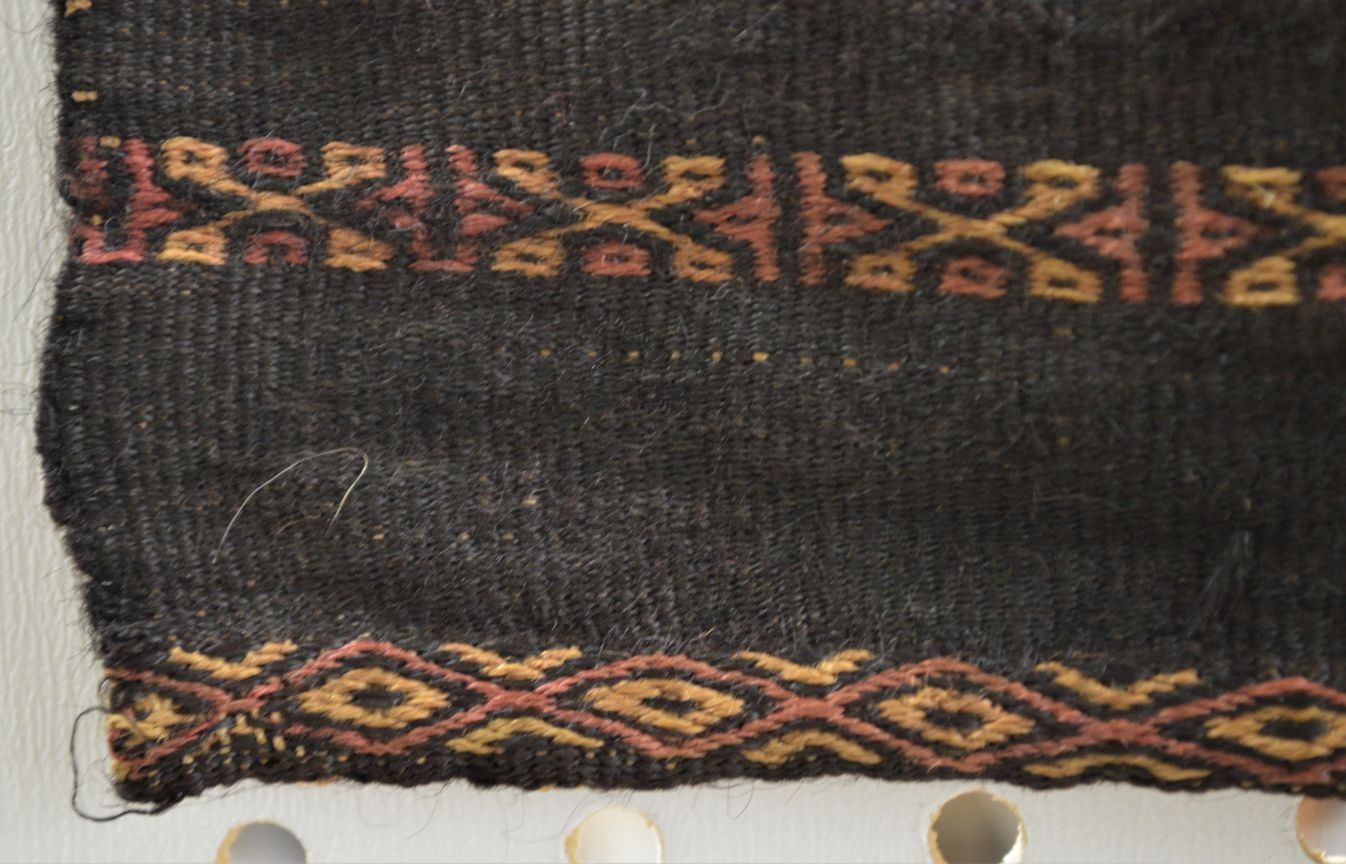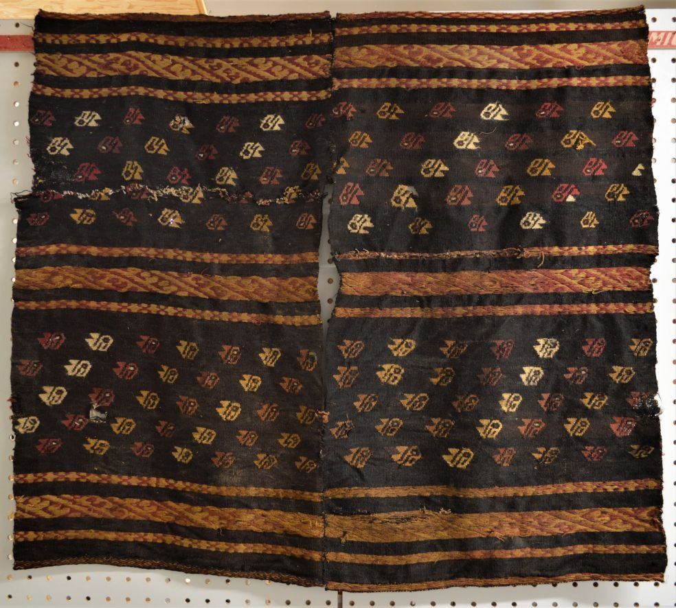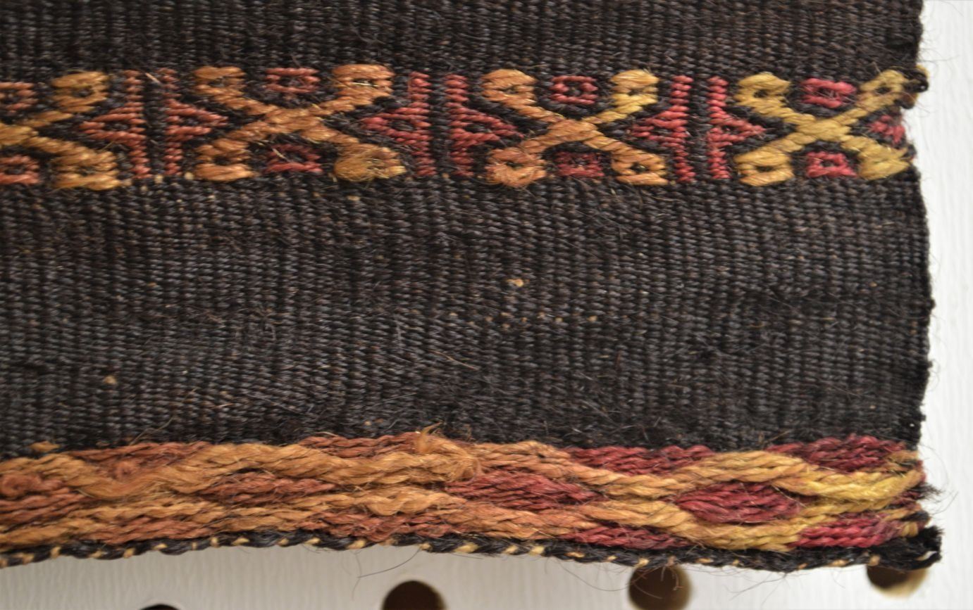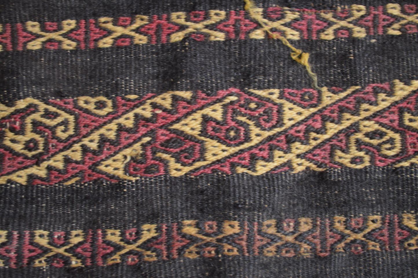 prehistoric. Hand woven banded design Peruvian textile, has minor damage. 30'' x 28''