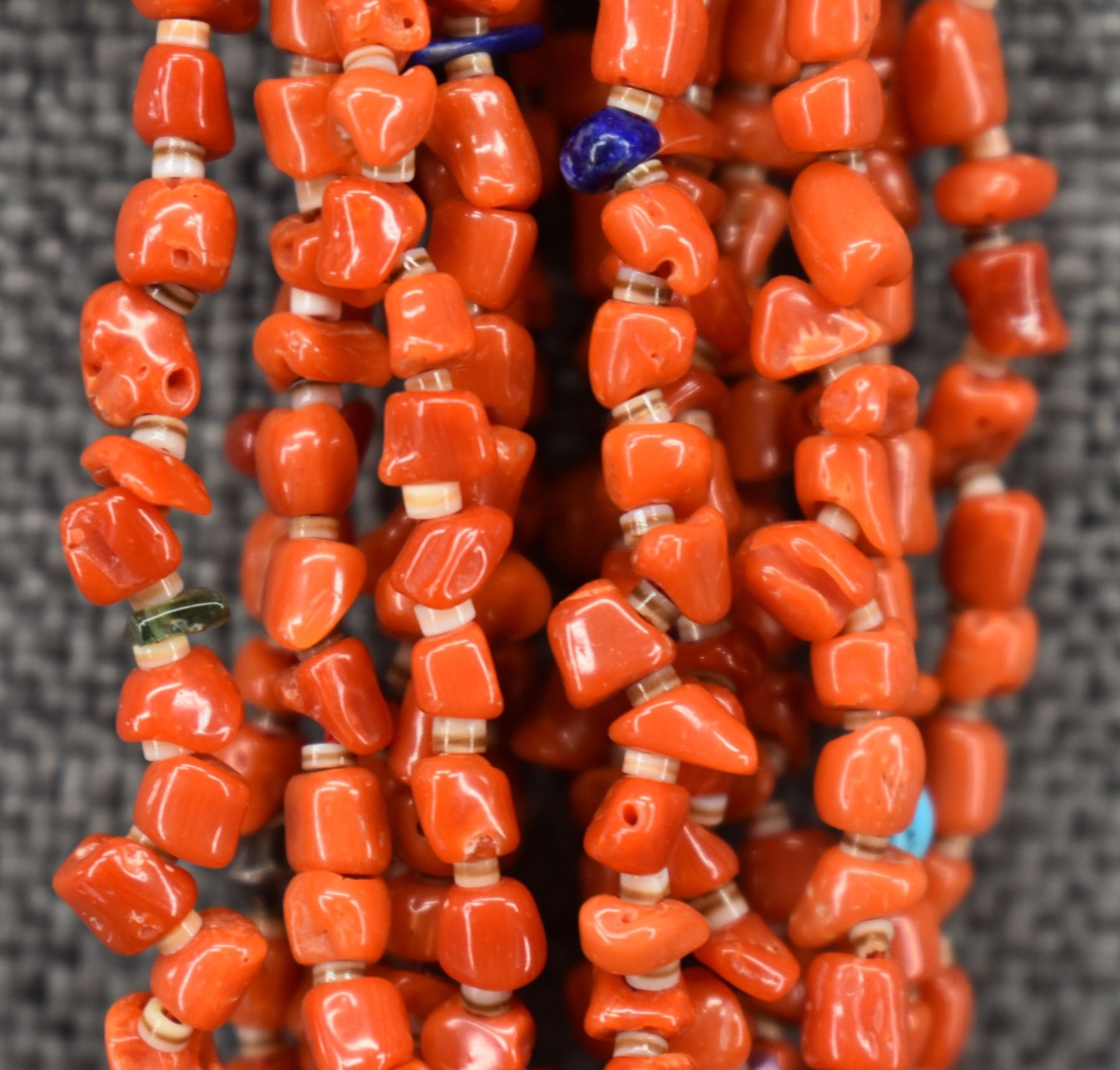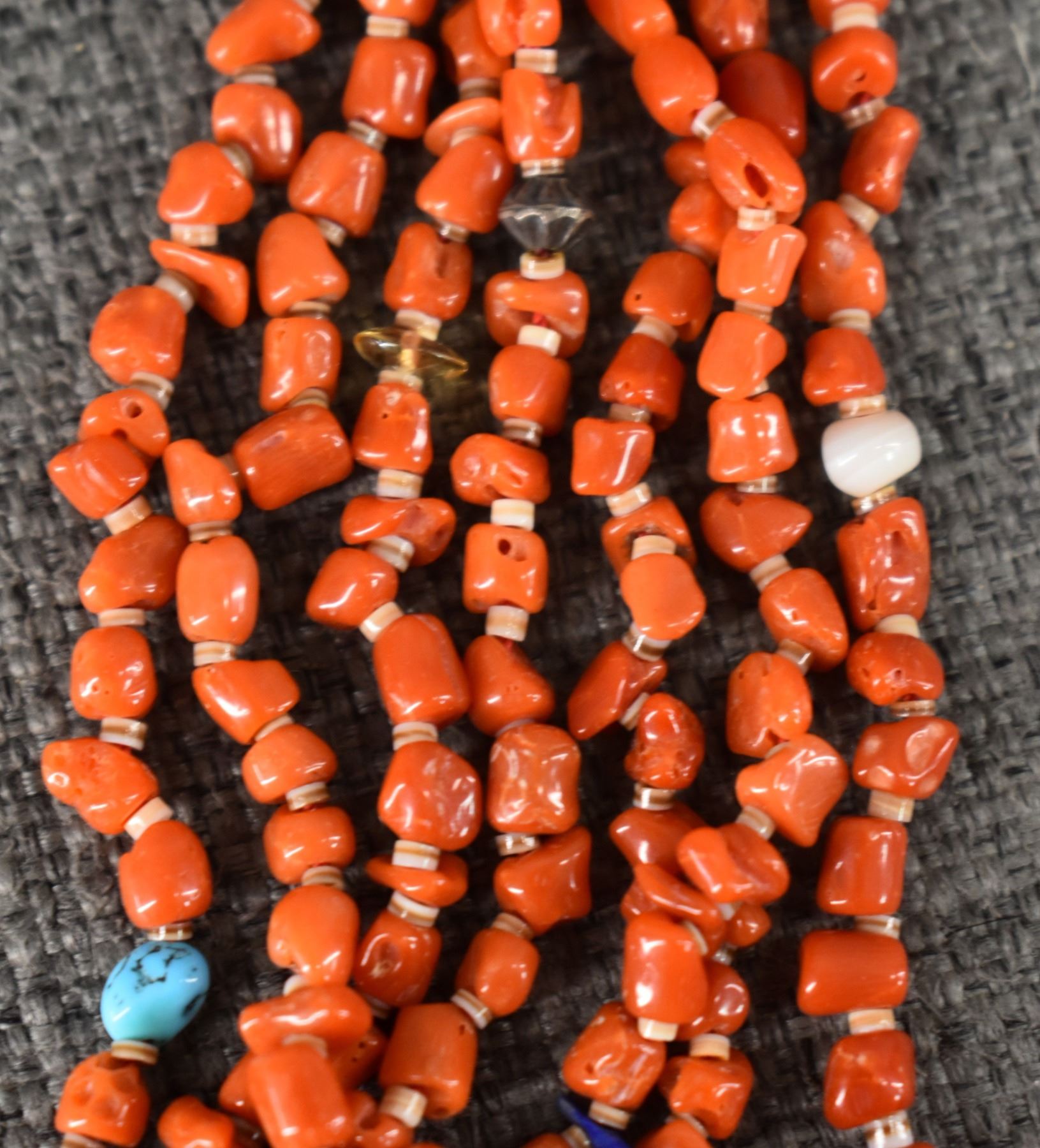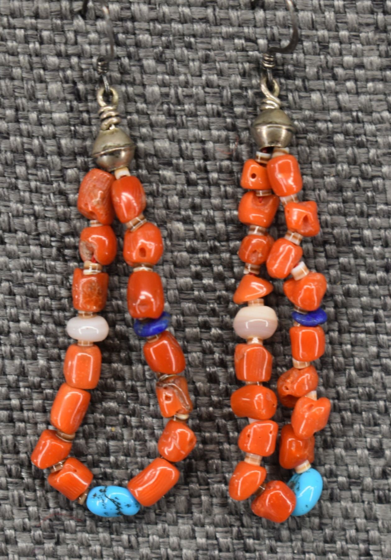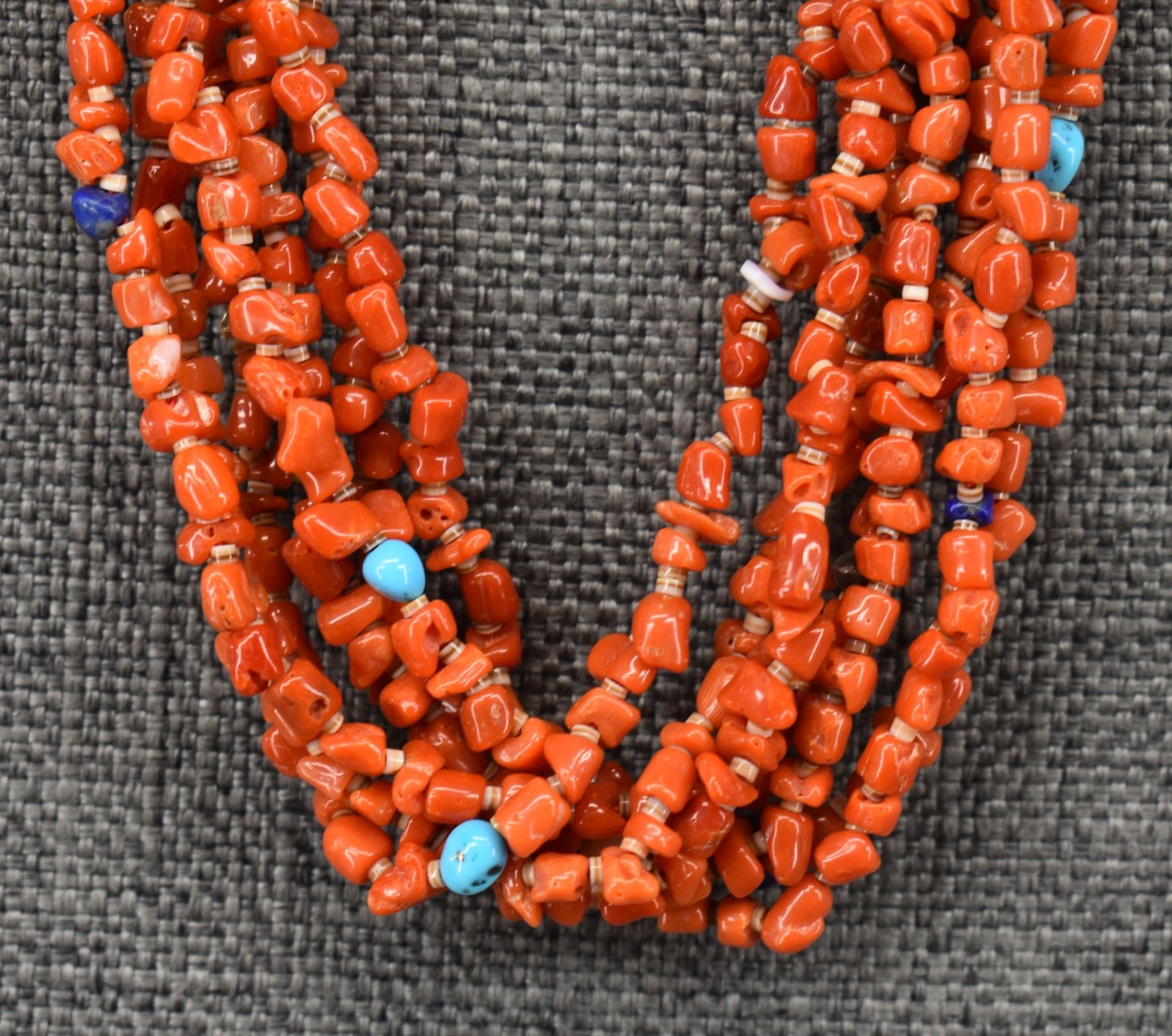 1980's Pueblo. Seven strand coral shell and turquoise necklace 20'' long and earrings 2.5'' long