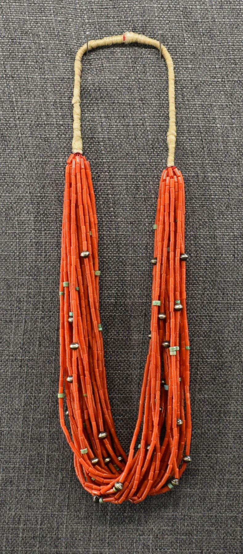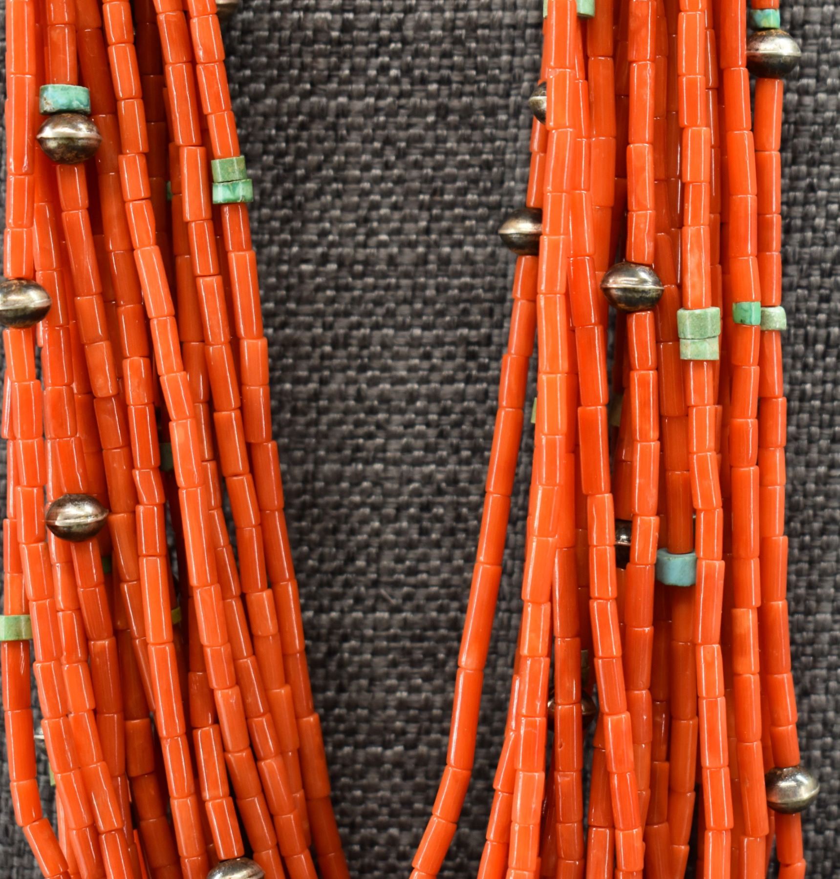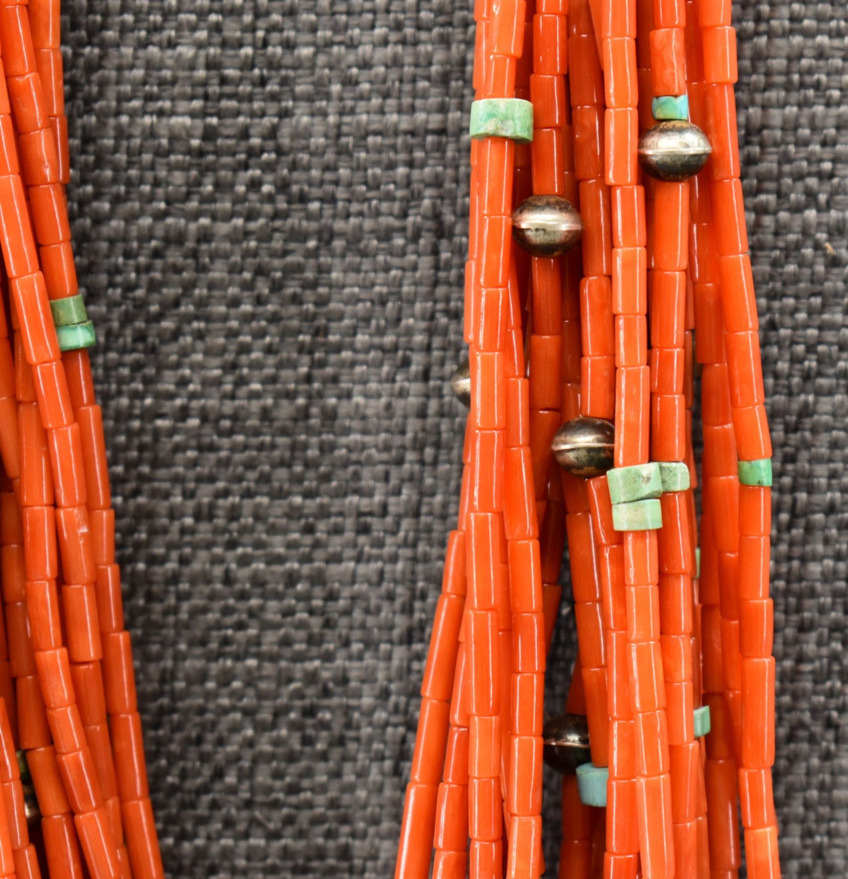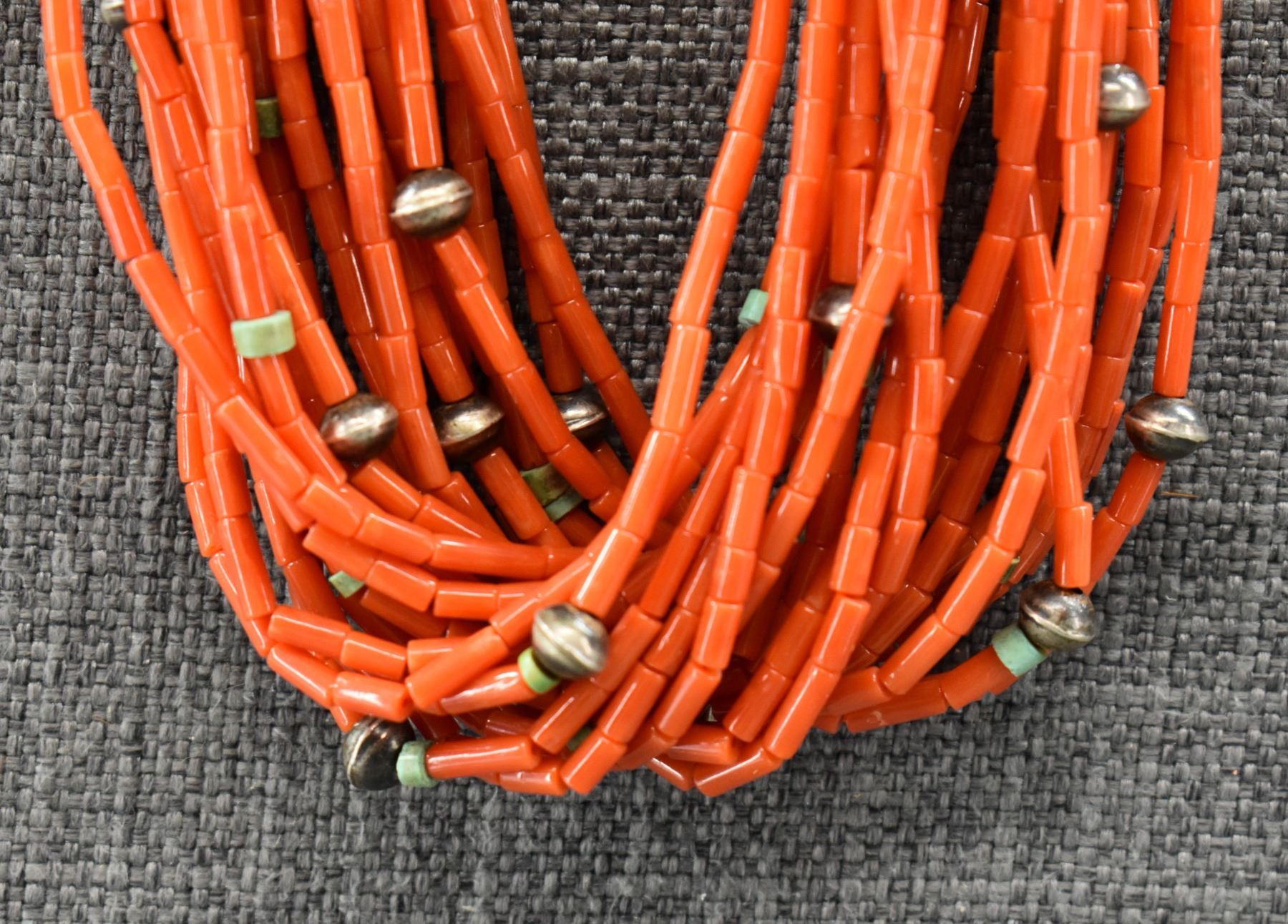 1980's Pueblo. Twenty three strands coral turquoise and sterling silver bead necklace. 26'' long