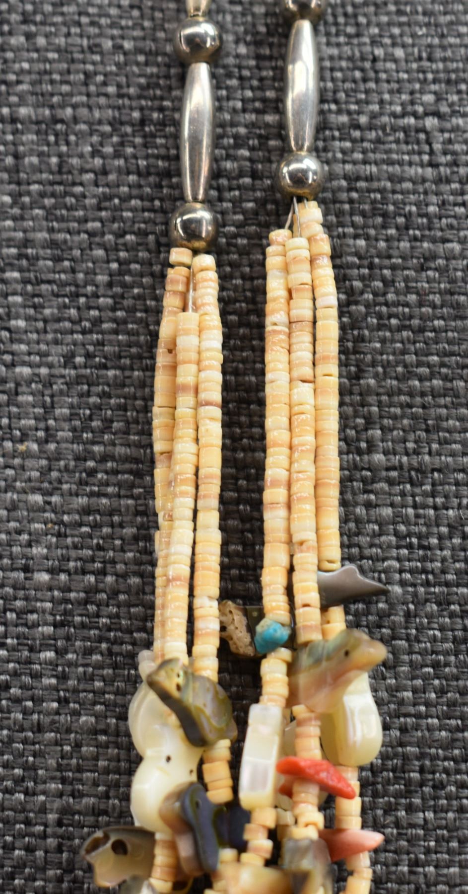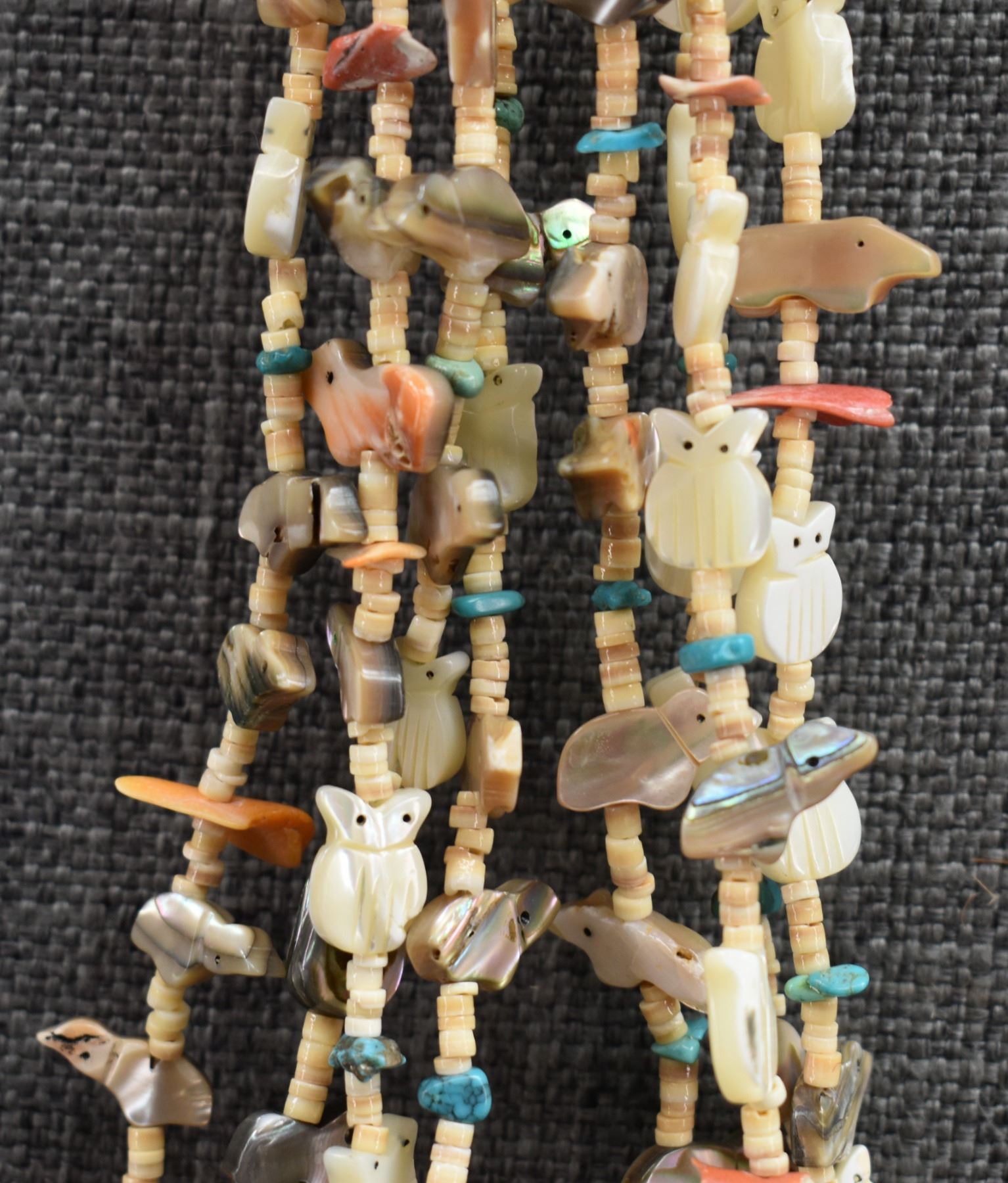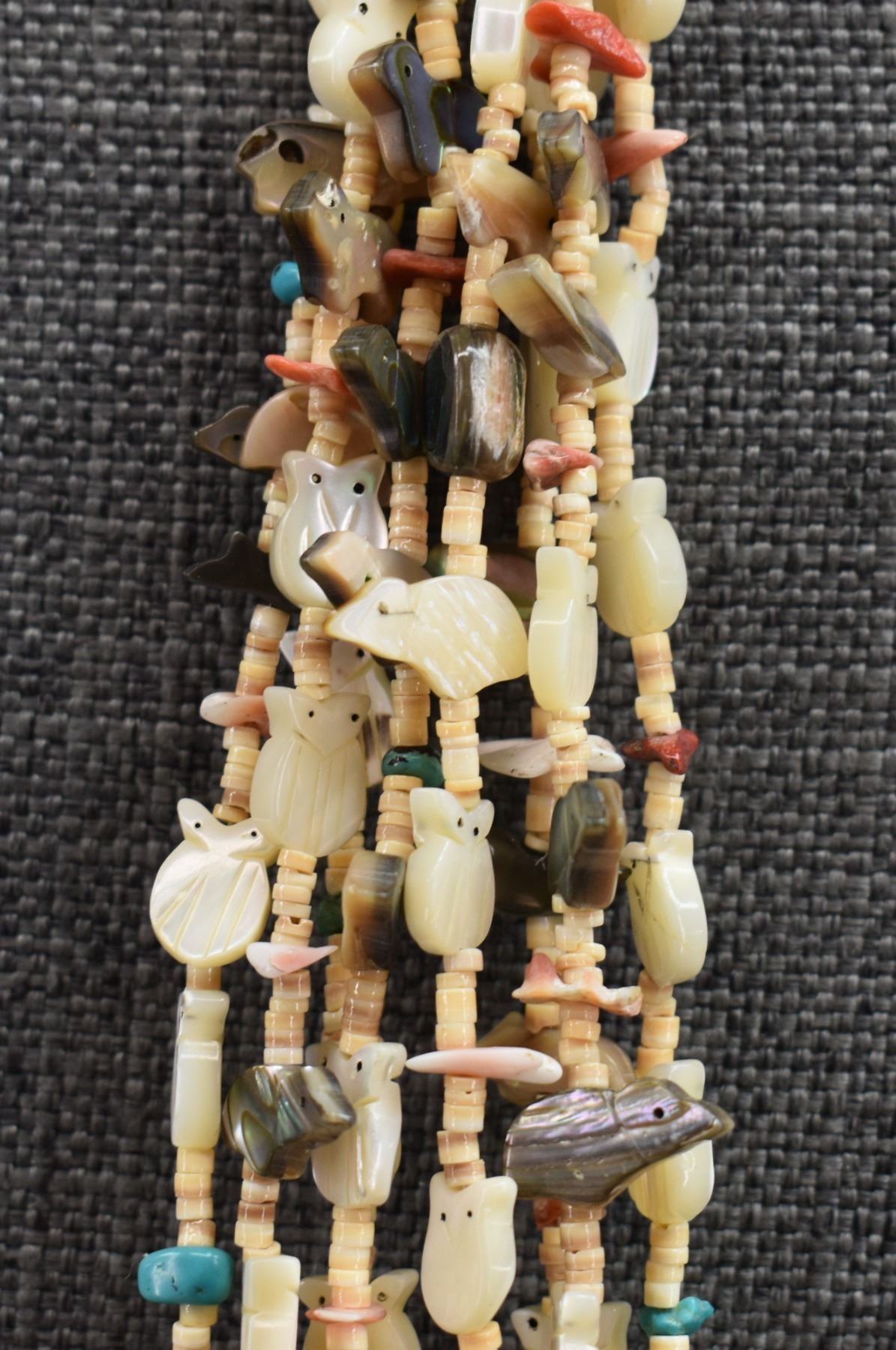 1980's pueblo, four strand carved shell fetish and shell heishi necklace. 30'' long