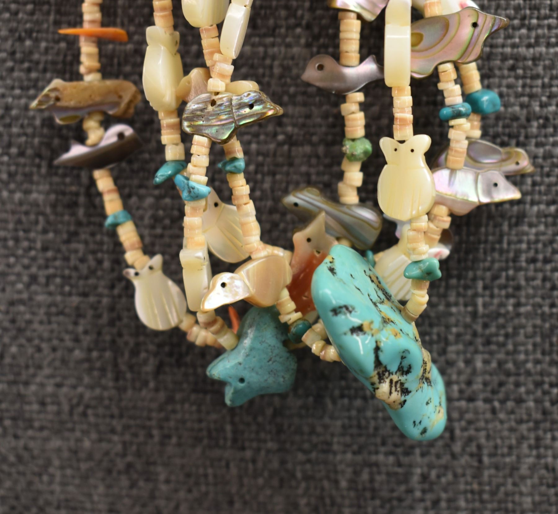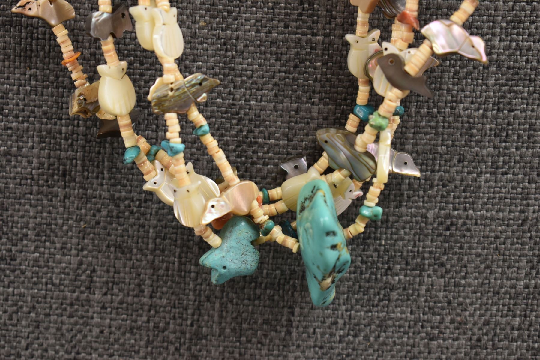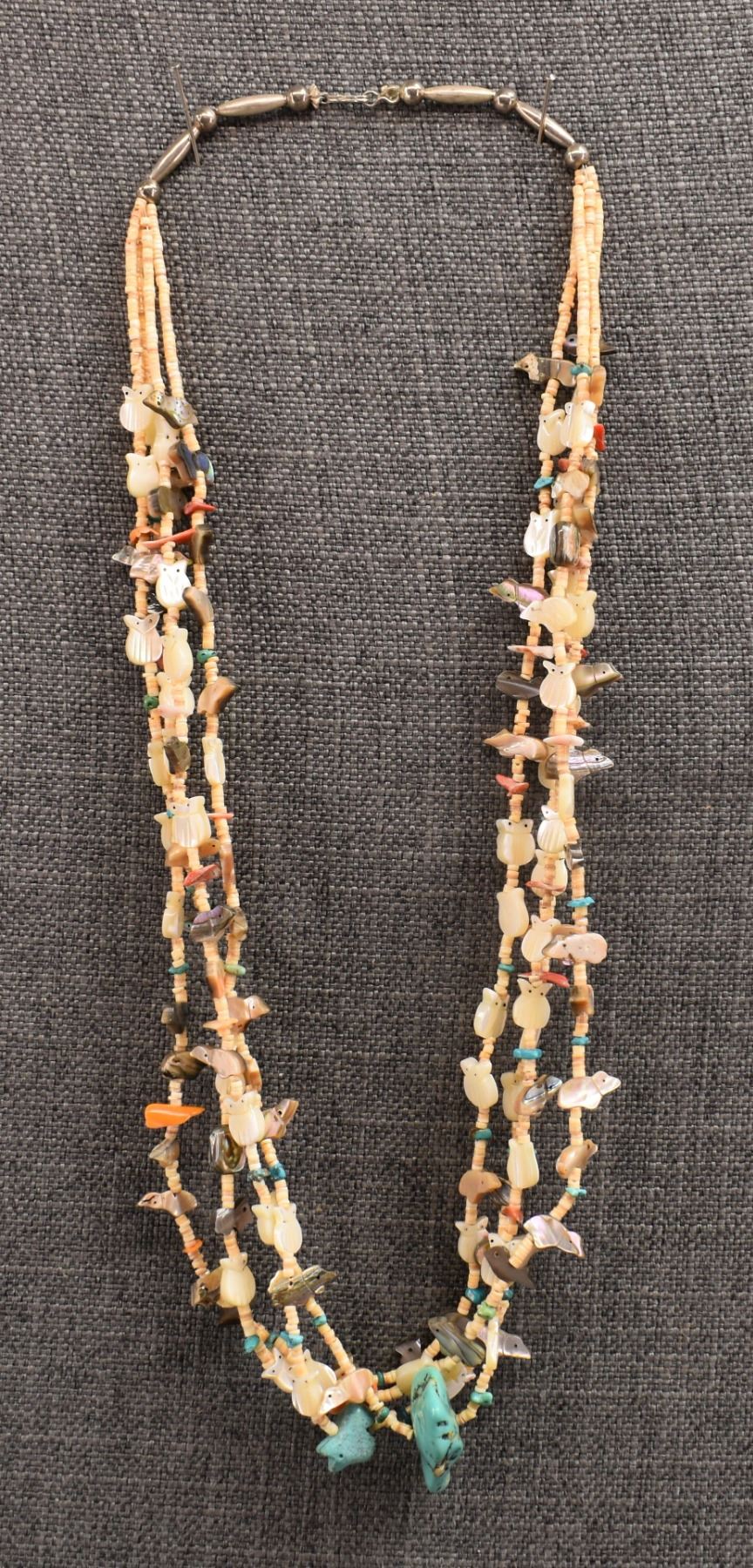 1980's pueblo, four strand carved shell fetish and shell heishi necklace. 30'' long