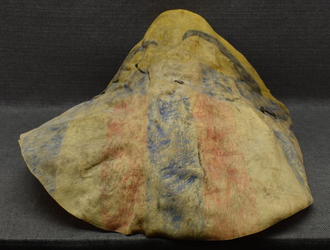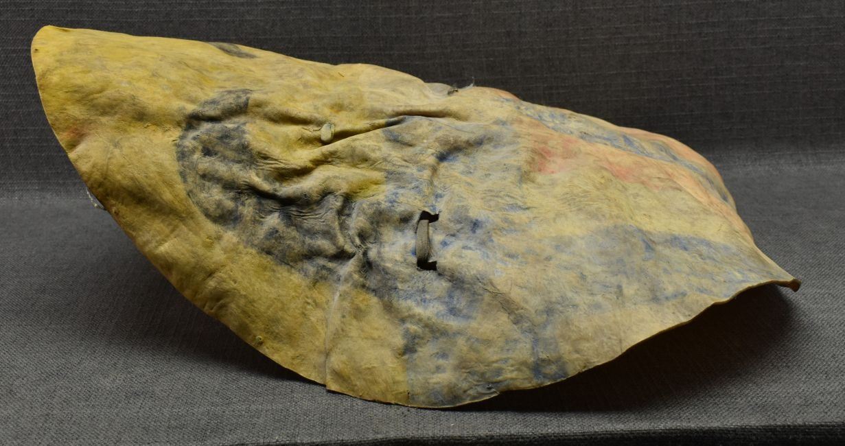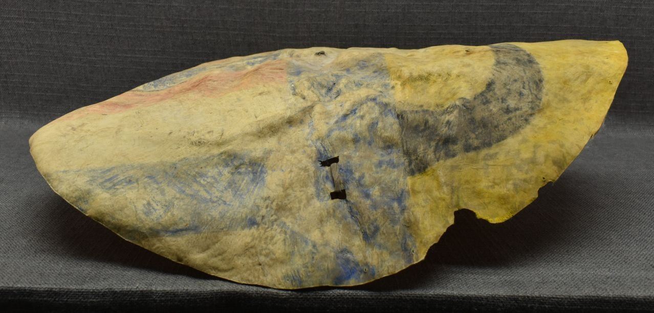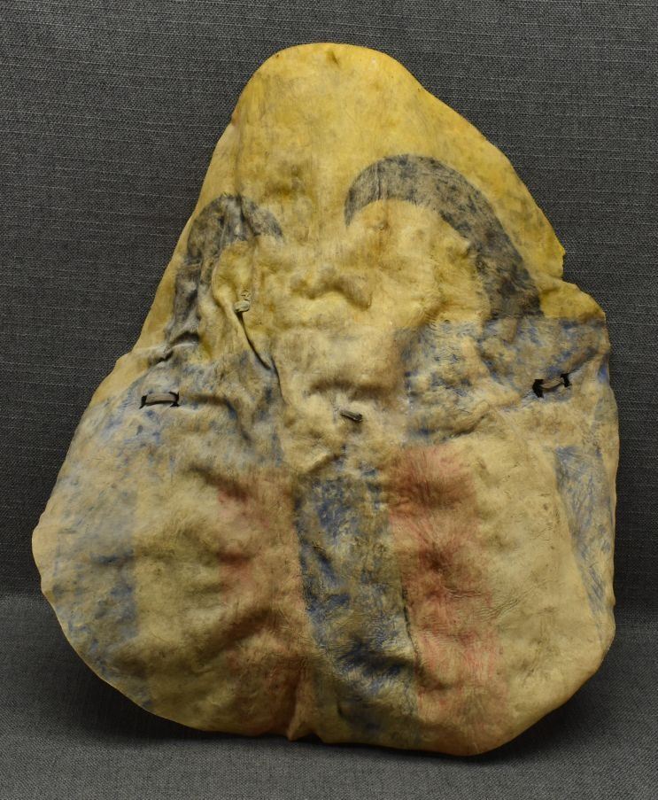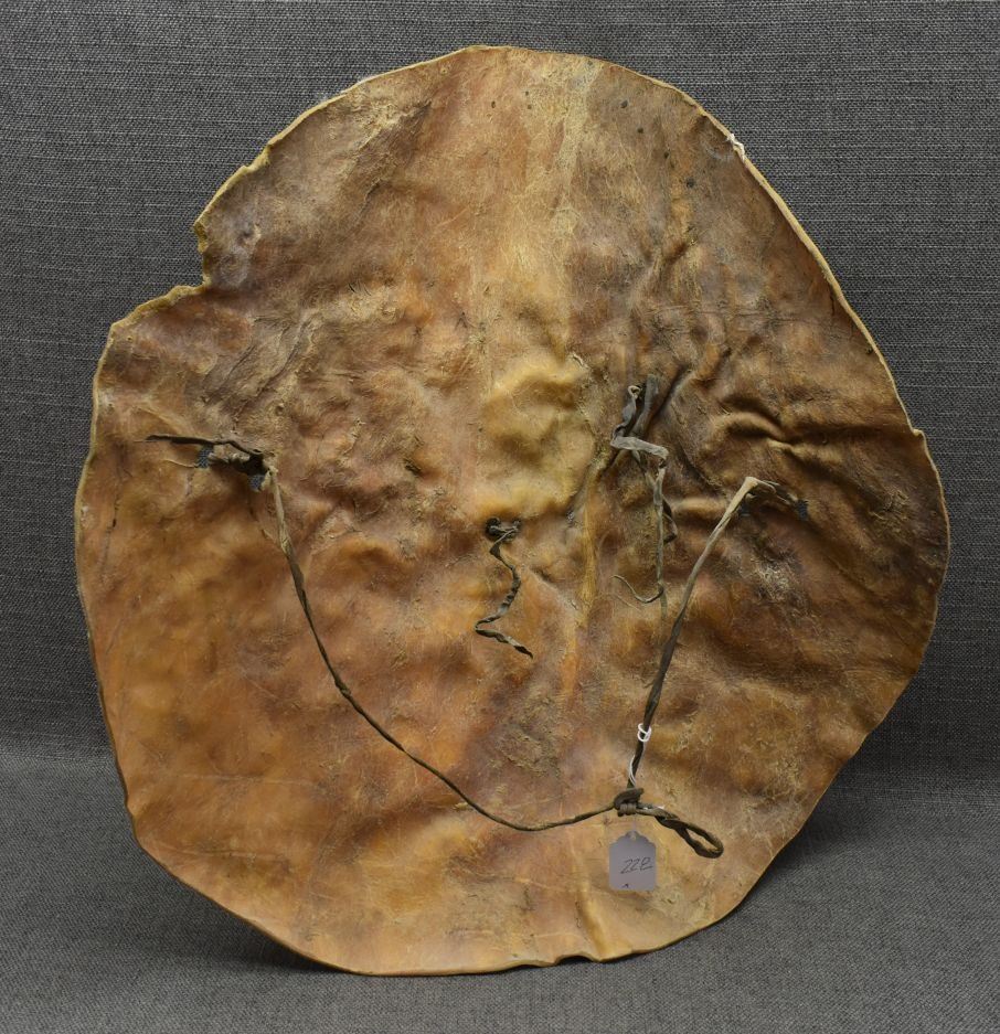 20th century. Hand painted design on hide dance shield. 22'' x 18''